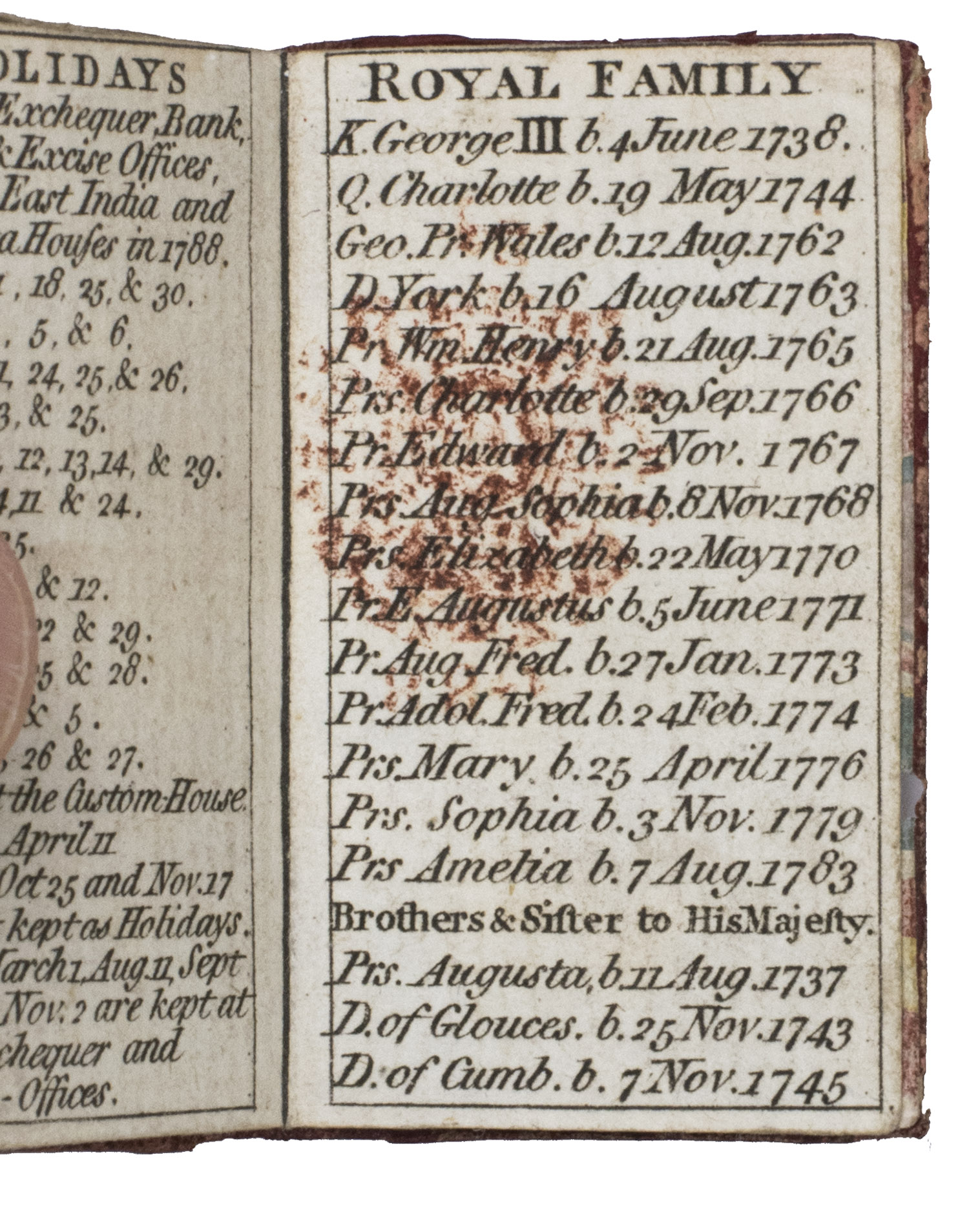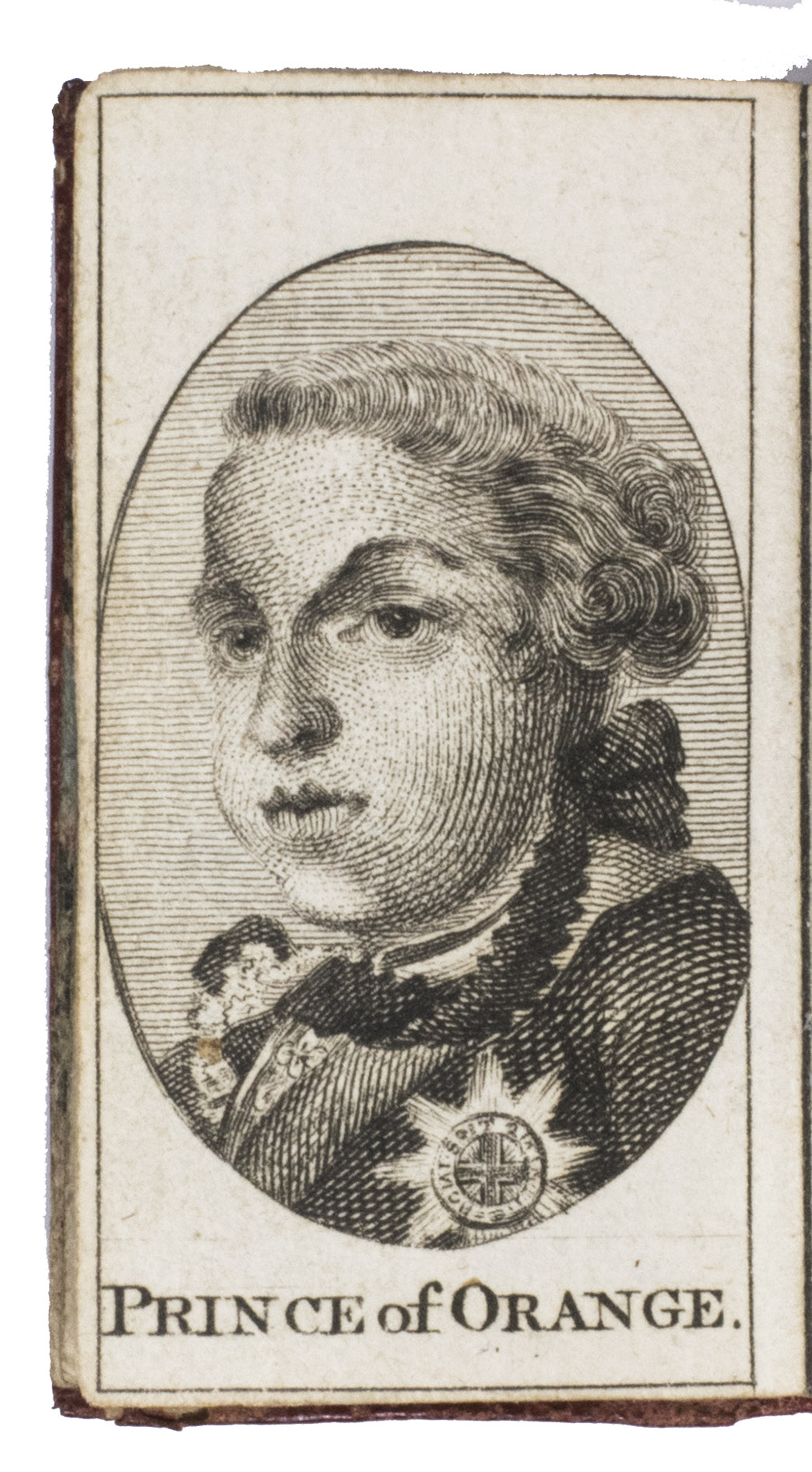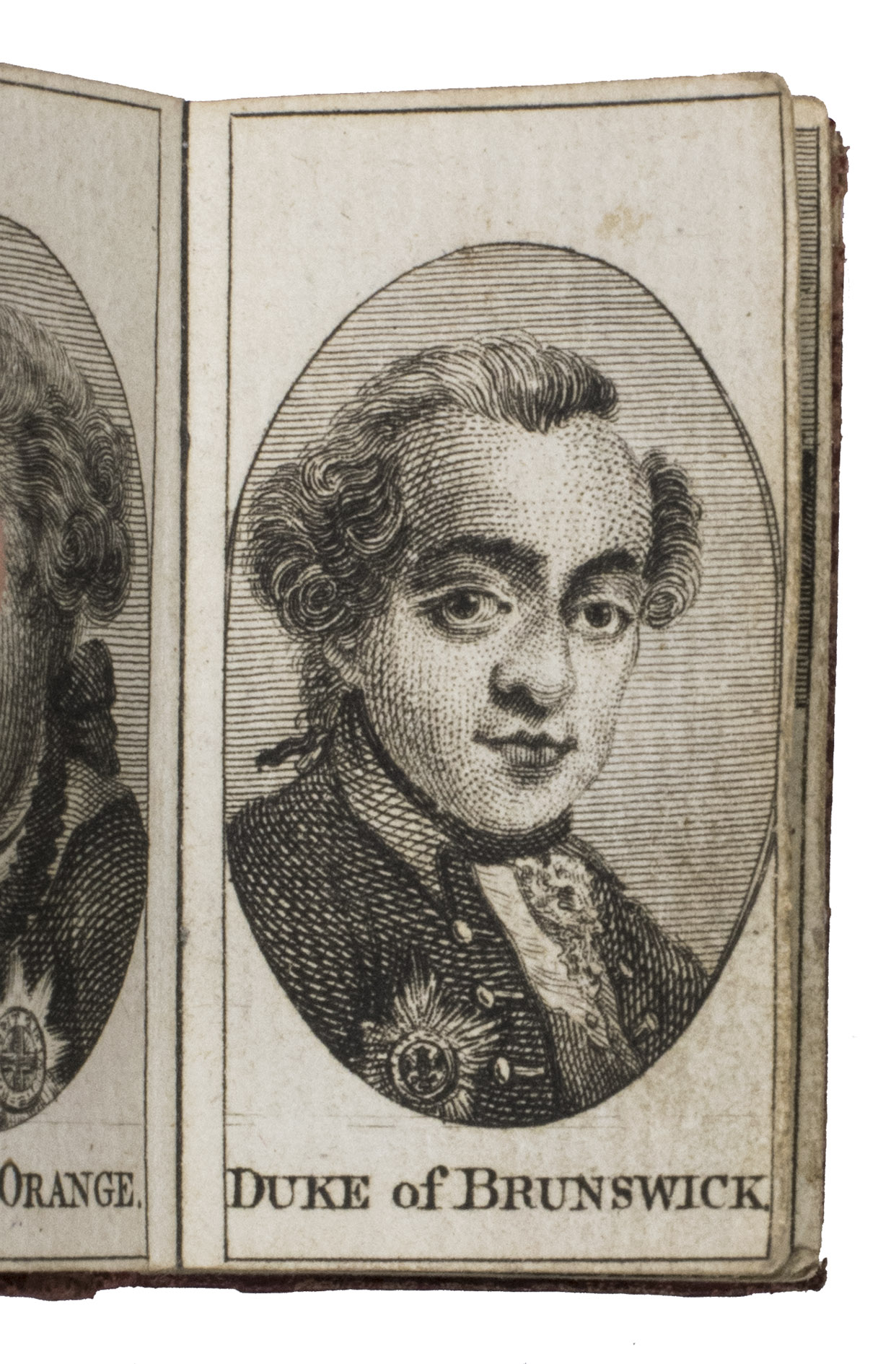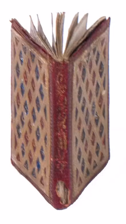 London, T. Carnan, [1788]. 24mo(?) (5.7 x 3.3 cm). With an engraved armorial title page, 4 full-page engraved portraits, and a half-page engraved view. Contemporary elaborately gold-tooled red morocco, the gold-tooled boards are beautifully decorated with a white morocco trellis-like (mosaic) pattern with red and green lozenge shaped morocco inlays, gilt edges, marbled endpapers. [24] pp.