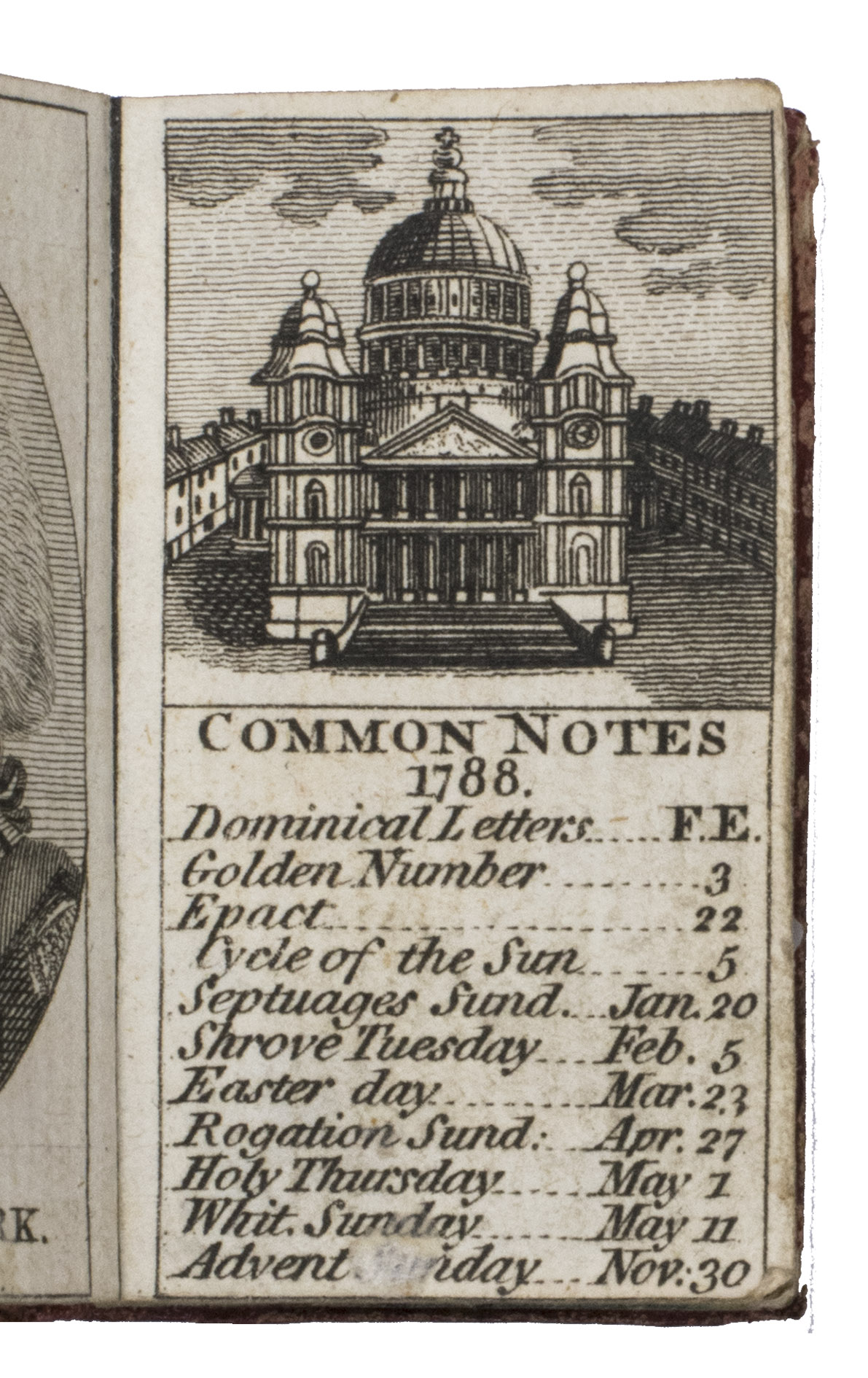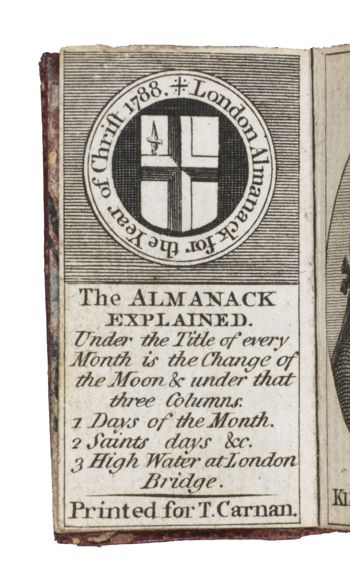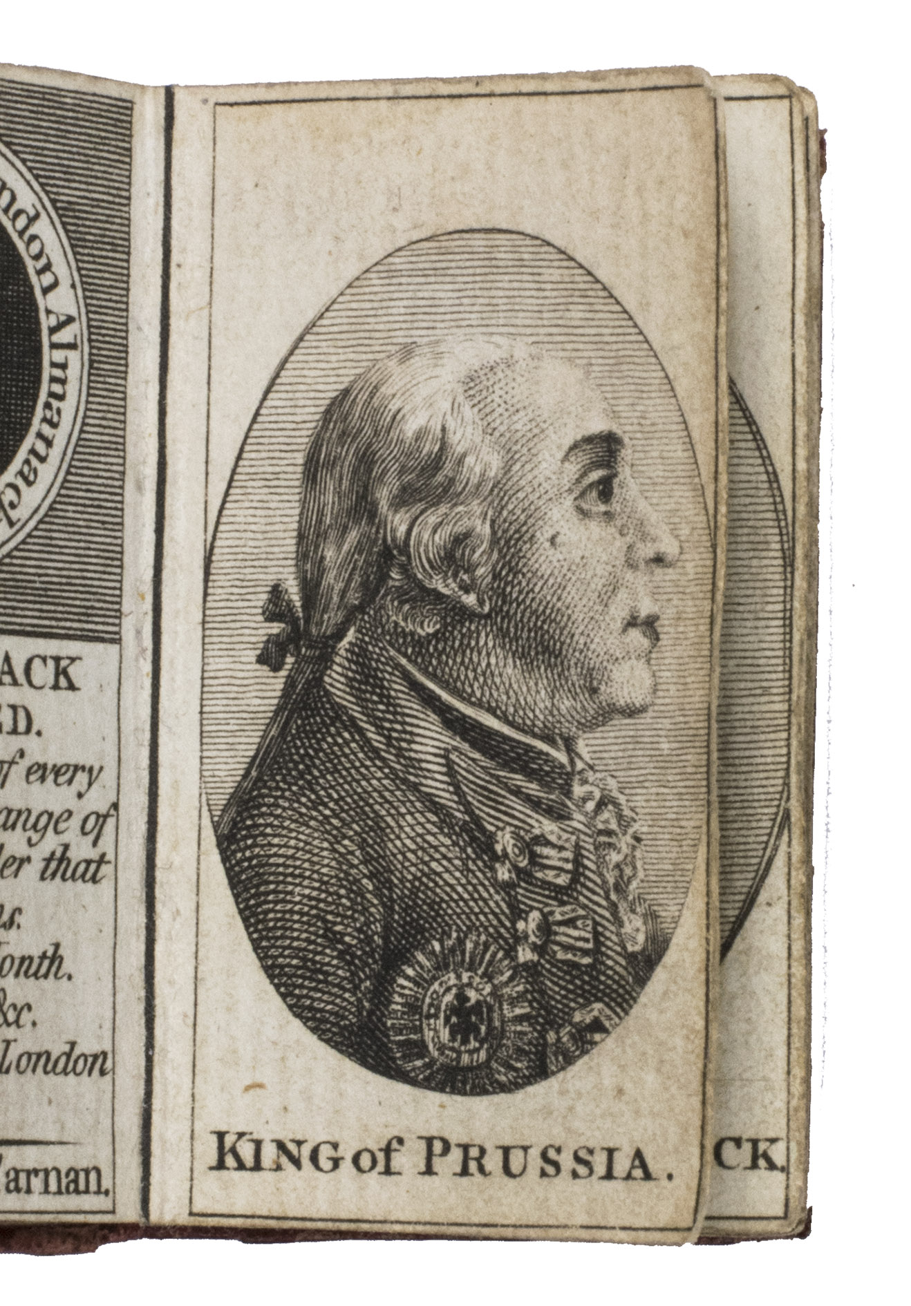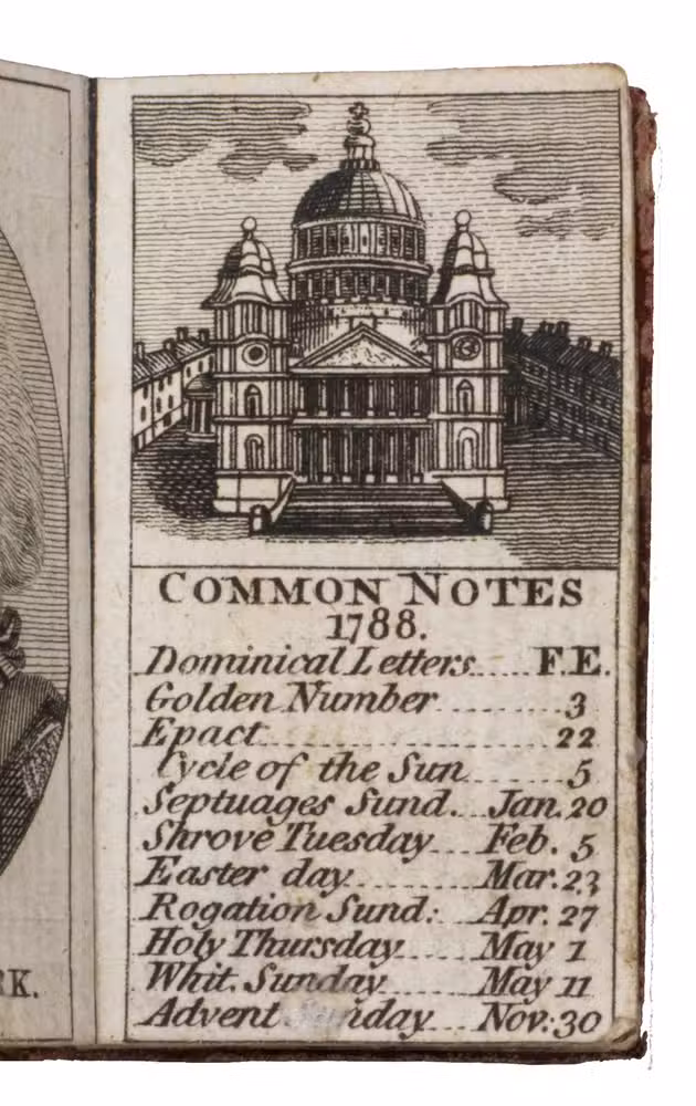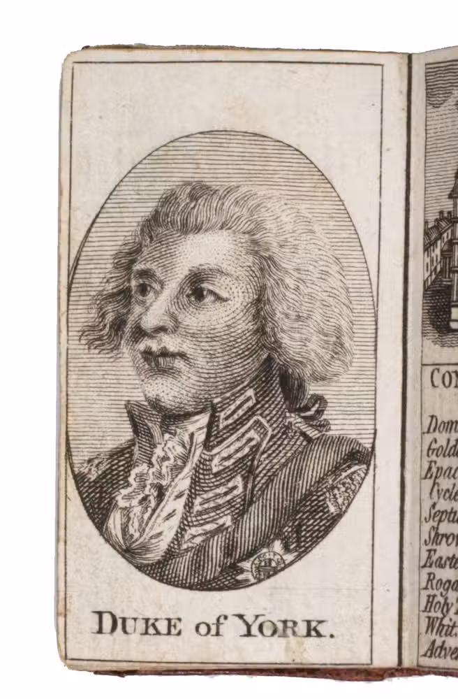 Rare remarkable "pocket" London almanack; an entirely engraved miniature publication for the year 1788. The almanac contains an explanation of its use on the title page, four full-page portraits of the King of Prussia, the Prince of Orange, the Duke of Brunswick, and the Duke of York, common notes (including the dominical letters, golden number, and religious festive days) for 1788 beneath a half-page view of St. Paul's Cathedral, a calendar, an overview of all British Kings and Queens and the dates of their reign, a list of mayors and sheriffs (1767-1788), one page listing bank holidays, and an overview of the Royal family (King George III and Queen Charlotte and their children) can be found on the final page. The long series of the London Almanack is, according to Bondy, of special interest for the beautiful bindings which were issued or commissioned by the publishers themselves.