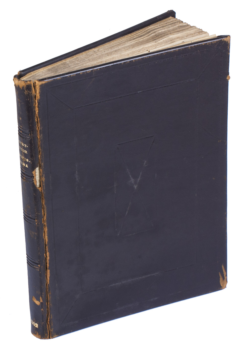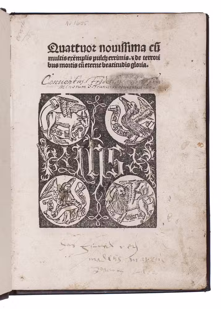 Deventer, Jacobus de Breda, 1502. 4to. With a woodcut illustration (9.5 x 8.5 cm) on title-page with the symbols of the four Evangelists.19th-century blind-tooled calf, title in gold on spine, preserving some contemporary endpapers but also with later ones. [47], [1 blank] ll.
