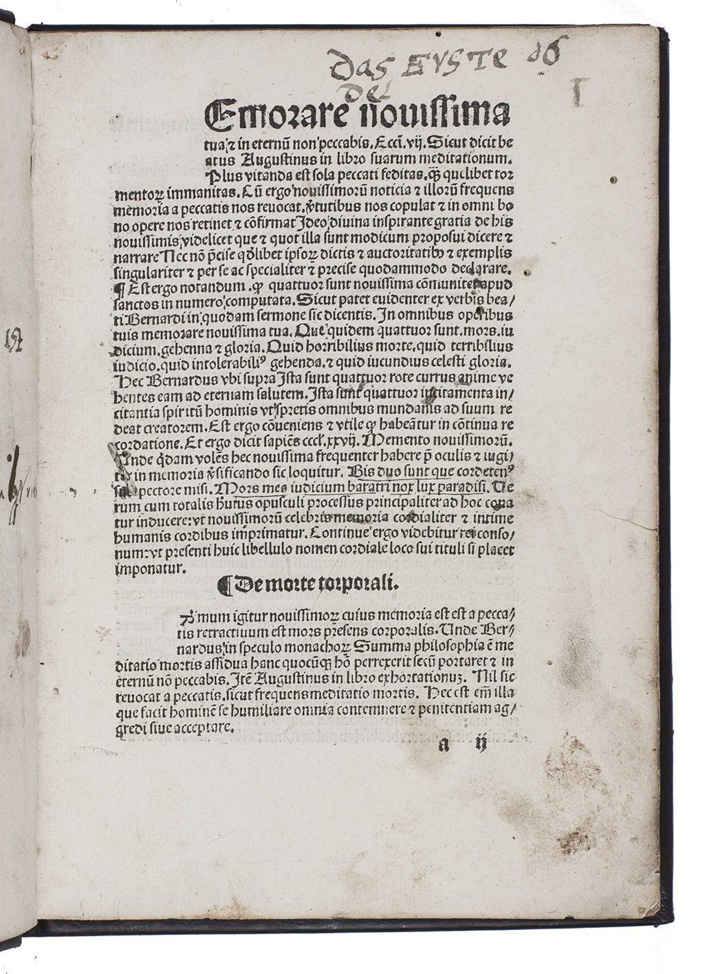 Rare Deventer post-incunable of a devotional book on the four extremes ("quattor novissima"): death, the last judgement, hell and heaven. This work is ascribed to Gerardus de Vliederhoven , who wrote the Latin work De Vier Utersten (The four extremes) at the beginning of the 15th century, but also Dionysius Carthusianus wrote on this topic. This work is even, however unfounded, ascribed to Geert Grote. It is most likely to ascribe the text of this postincunable, or at least the very original of the text on which this copy is based on, to Gerard van Vliederhoven.