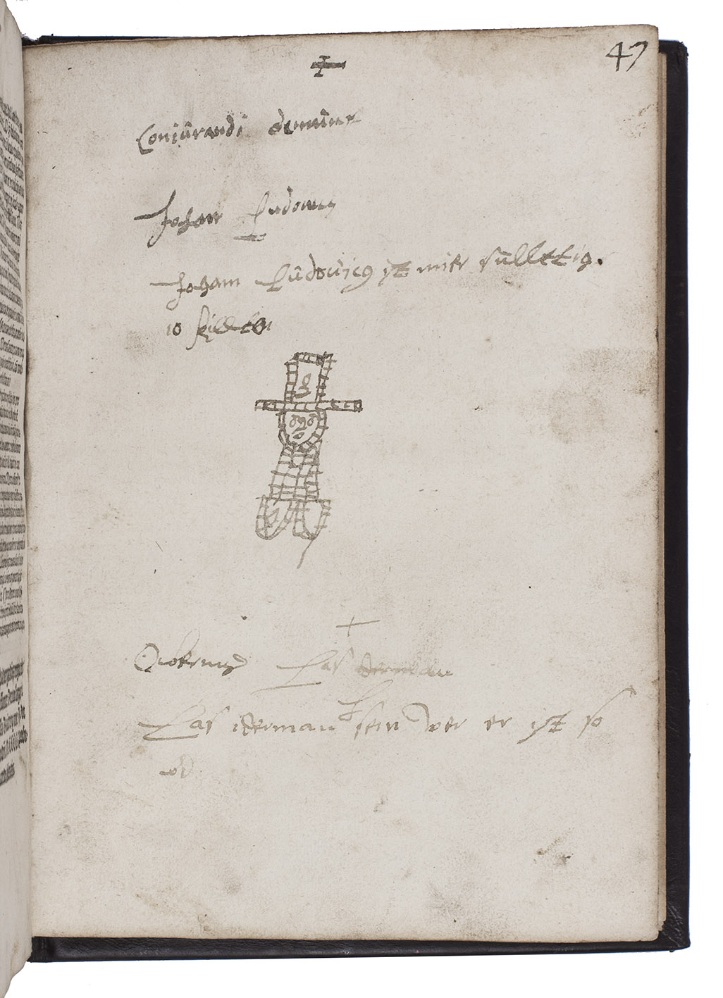 With some manuscript notes in different hands on the endpapers and in the margins, the one on the last contemporary endpaper dated 1598-1600. Also with some 17th- or 18th-century ownerships entries on the title: "Conventus Frideslariensus Fratrum minorum S. Francisci in conventualium", which is an indication that this book was in possession of the monastery of the fratres minores at Fritzlar. There is also an ownershipss entry on the verso of the title in the vernacular: "Johannes Teuffel tem ist tas buch ..." and in Latin "Johannes Diabolus ergo sum ...". Also another annotations and a small drawing on the last contemporary endleaf, perhaps in another hand and not very easy to read, recording purchases and sales, and on Johannes Ludovicus owning him several amounts of money. Binding slightly rubbed, corners bumped, front hinge cracked. Only some small stains and occasional browning in the margins, not affecting the text. Tear in title-page. With all its fault, still a rare post-incunable in good condition. Adams C2620; Van Huisstede & Brandhorst 1380; Nijhoff-Kronenberg 1605; Vooys, Middelnederlandse legenden en exempelen, p. 57, 253-254; USTC 420029.