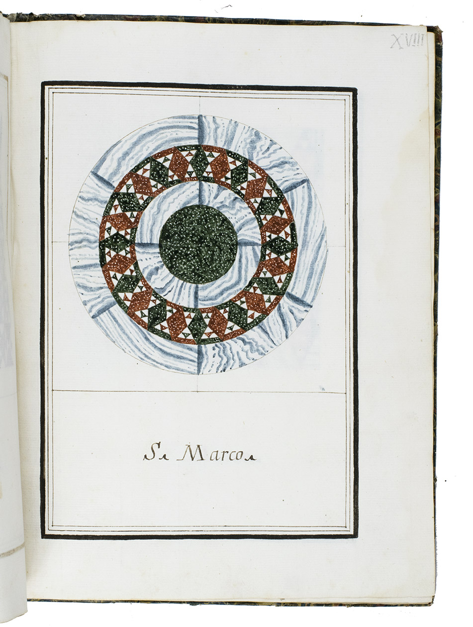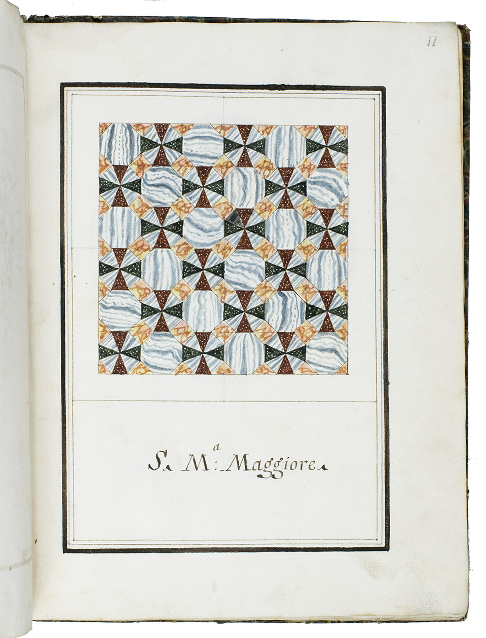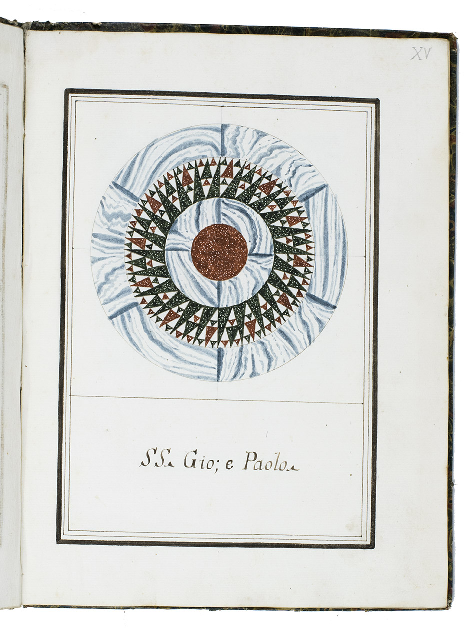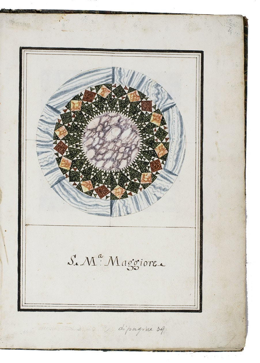 [Rome?, ca. 1662 or 18th century]. Small folio (26 x 19.5 cm). 40 ink and watercolour drawings (28 round and 12 square, each ca. 11 x 11 cm) showing the decorative patterns and coloured marbles from the floors of 5 churches. Each has a triple-rule border in black ink with a panel at the foot containing the name of the church. Contemporary(?) boards covered with later (ca. 1840?) Storemont on shell marbled paper. [40] ll.