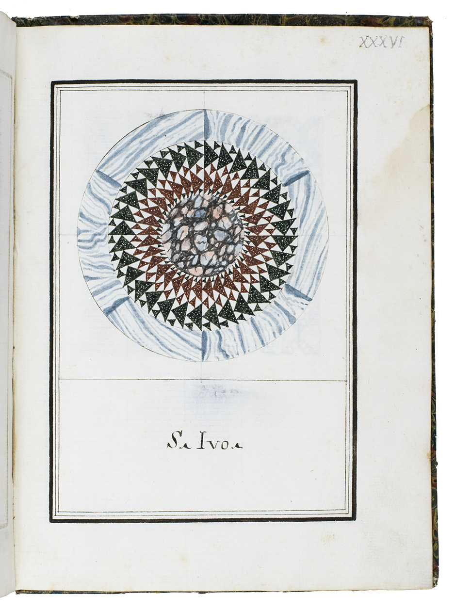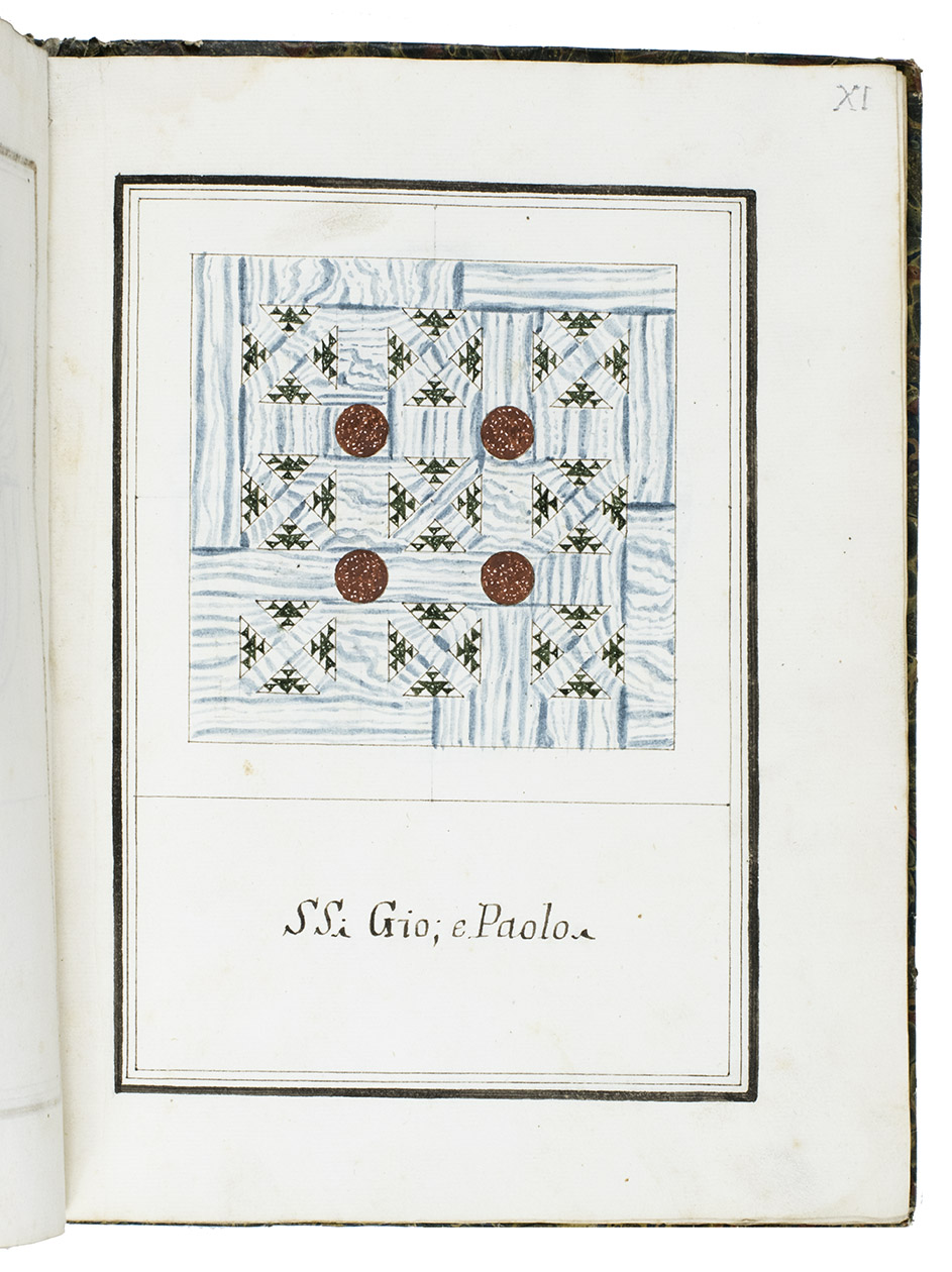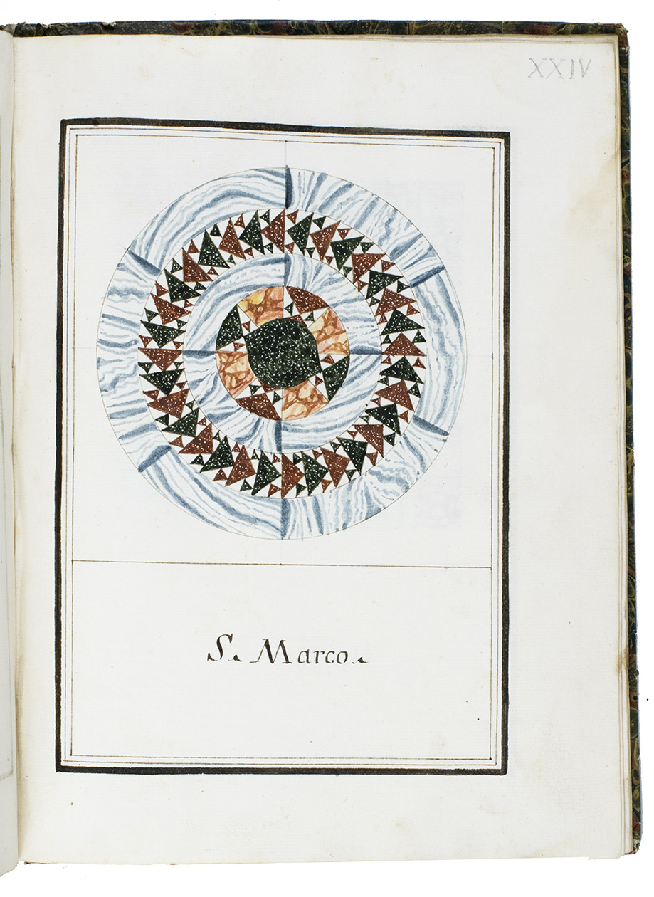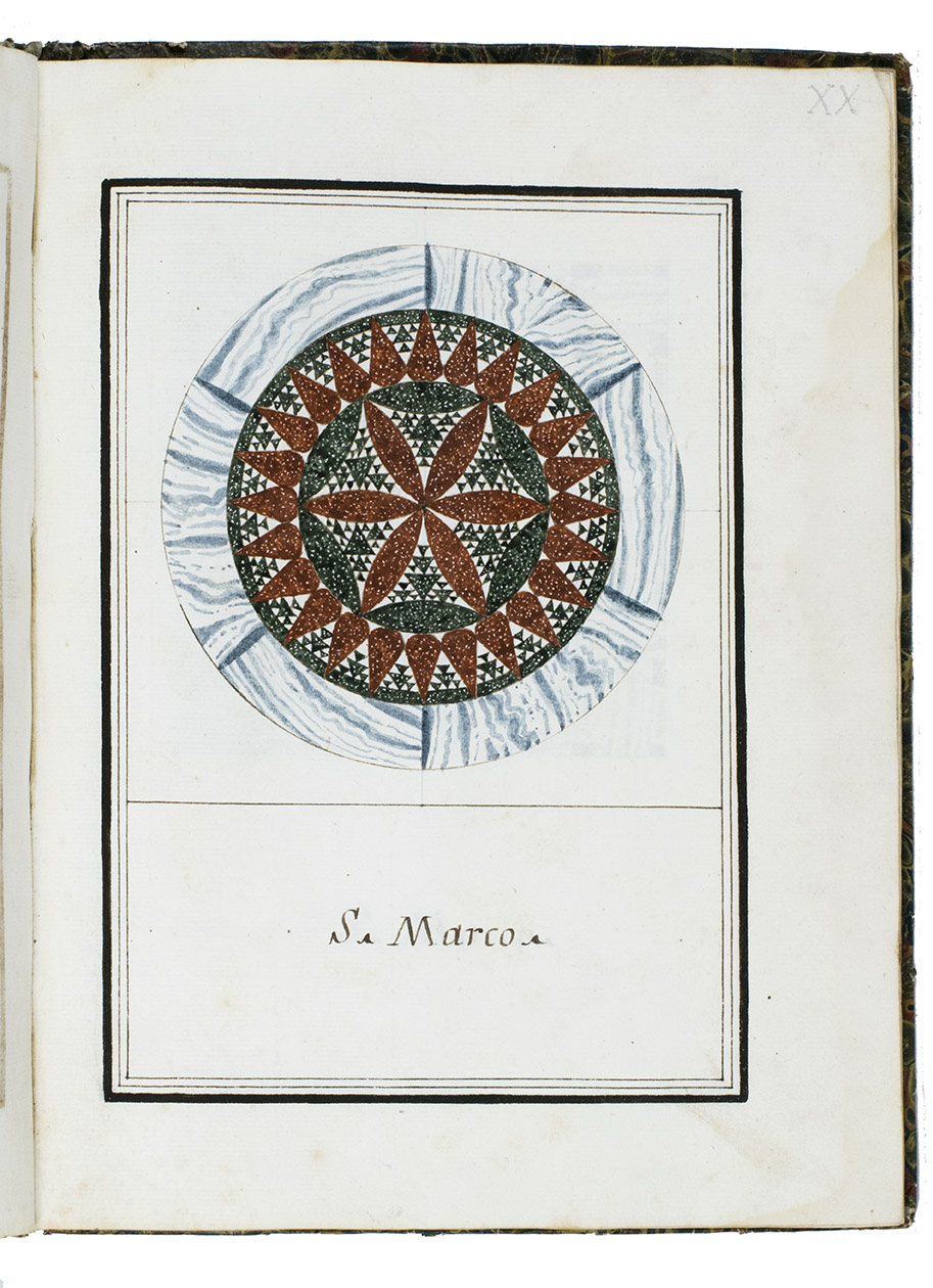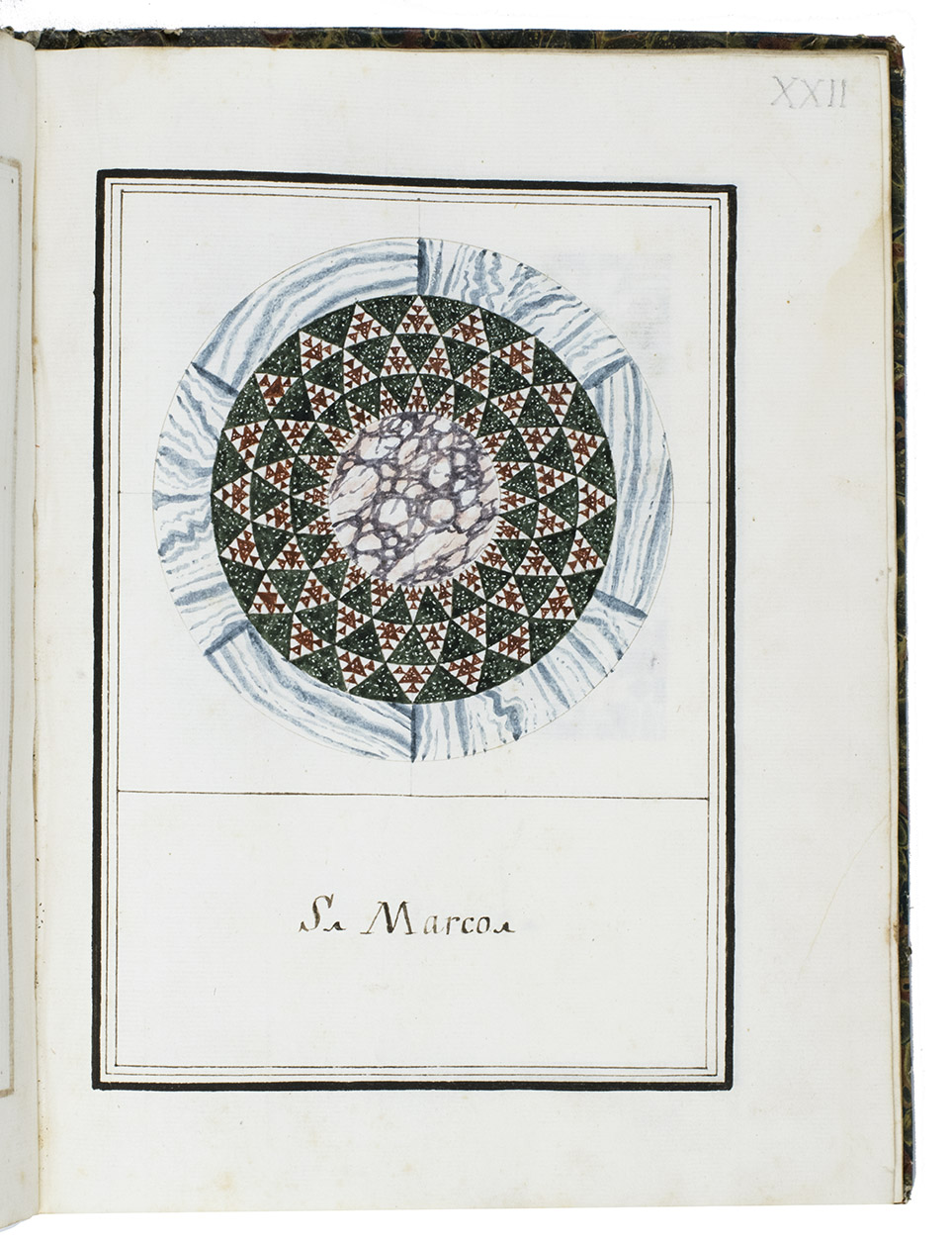[Rome?, ca. 1662 or 18th century]. Small folio (26 x 19.5 cm). 40 ink and watercolour drawings (28 round and 12 square, each ca. 11 x 11 cm) showing the decorative patterns and coloured marbles from the floors of 5 churches. Each has a triple-rule border in black ink with a panel at the foot containing the name of the church. Contemporary(?) boards covered with later (ca. 1840?) Storemont on shell marbled paper. [40] ll.