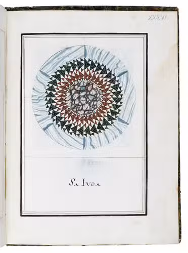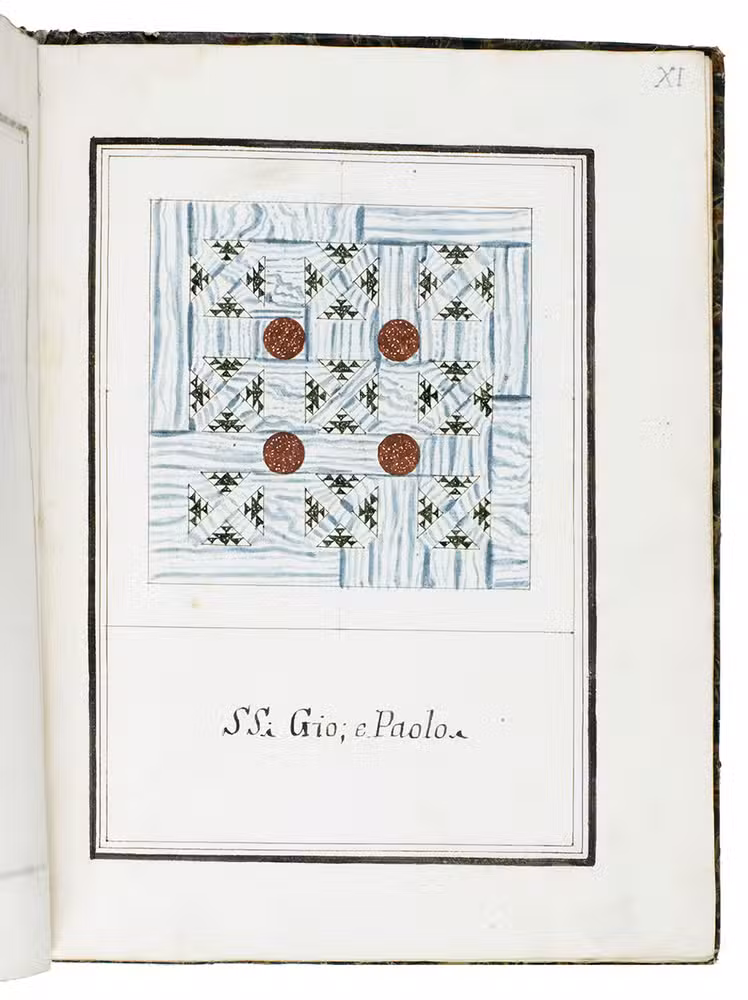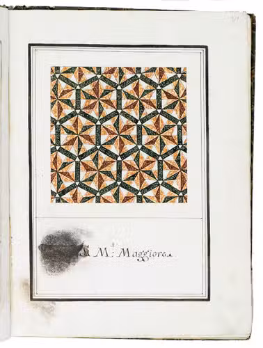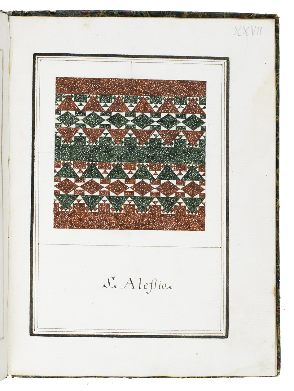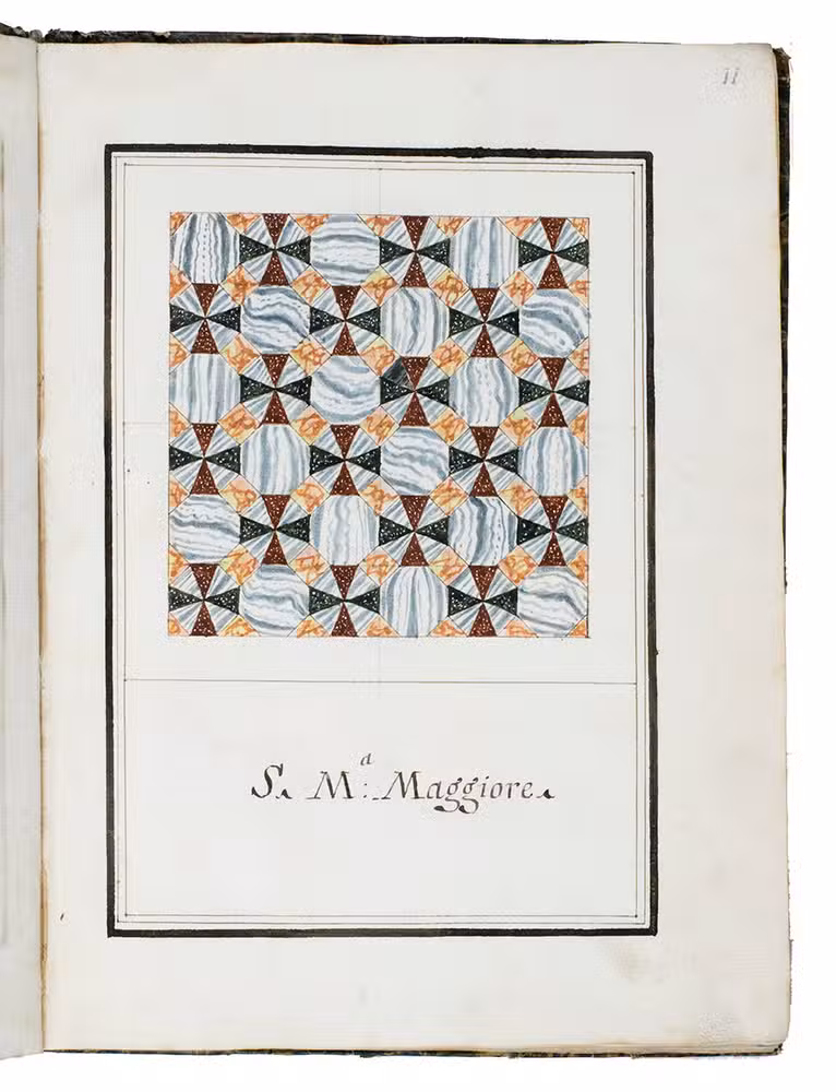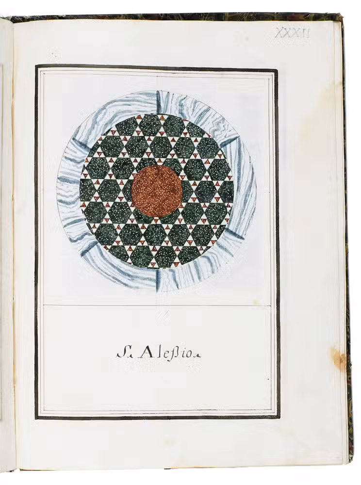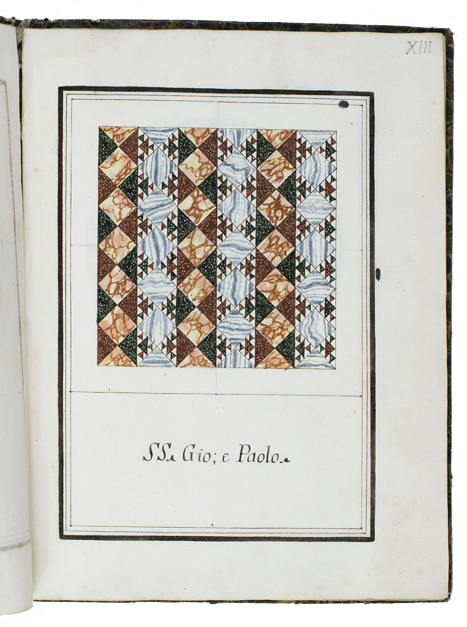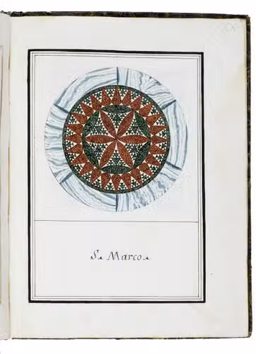 [Rome?, ca. 1662 or 18th century]. Small folio (26 x 19.5 cm). 40 ink and watercolour drawings (28 round and 12 square, each ca. 11 x 11 cm) showing the decorative patterns and coloured marbles from the floors of 5 churches. Each has a triple-rule border in black ink with a panel at the foot containing the name of the church. Contemporary(?) boards covered with later (ca. 1840?) Storemont on shell marbled paper. [40] ll.