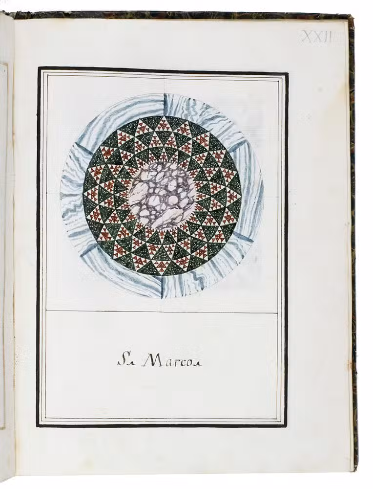 With smudges on a few pages, one slightly affecting the edge of one drawing, but otherwise in very good condition, with only a light marginal water stain in the last few leaves. The front hinge is broken and the spine and edges of the binding are somewhat tattered. Since many floor mosaics have been destroyed or damaged over the centuries, the present book provides a unique historical record of some of the designs.
