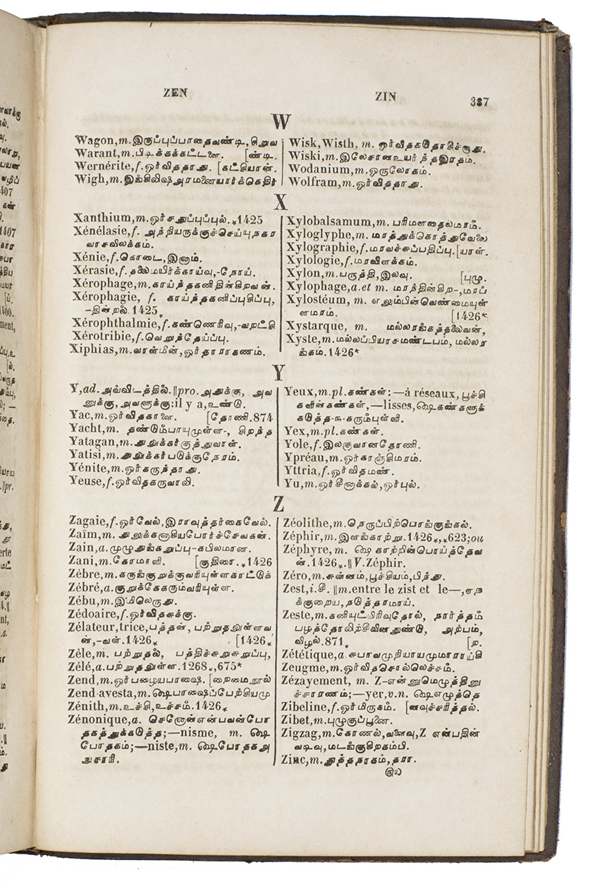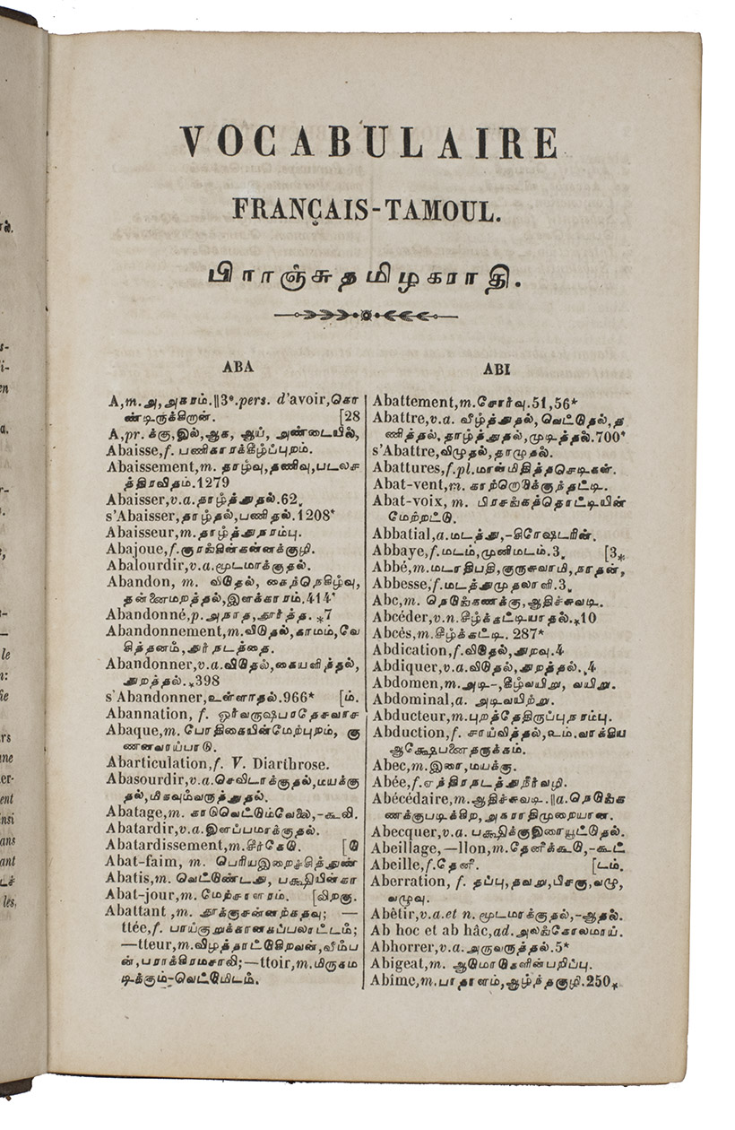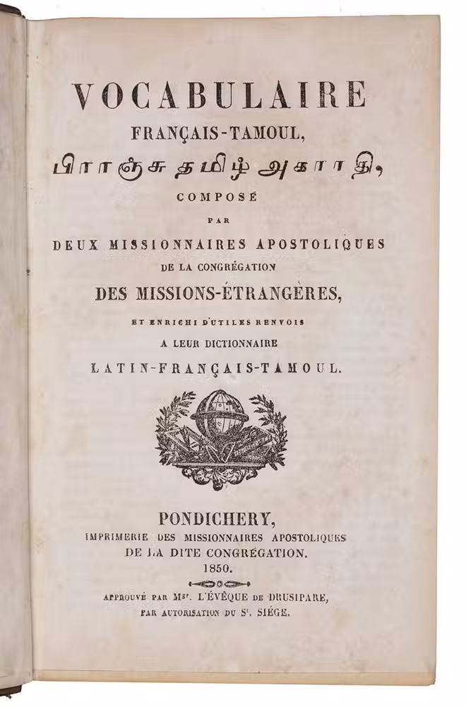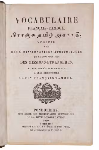 Extremely rare first edition of a French-Tamil vocabulary, composed by Louis-Marie Mousset (1808-1888) and Louis-Savinien Dupuis (1806-1874), both missionaries in Pondicherry of the French Catholic Mission in India. The dictionary is enriched with useful references to their Dictionarium Latino-Gallico-Tamulicum (1846), being the first French-Tamil-Latin dictionary. "In the field of Tamil studies", it is still regarded "one of the most important dictionaries published today" (Lardinois). Mousset was a French Tamil scholar, priest of the "Missions etrangères de Paris" and a missionary in South India.The present dictionary, being printed in Pondicherry on the apostolic mission press, is extremely rare. Only three copies are recorded in WorldCat at the Bibliothèque nationale de France (BNF), BM Lyon and the British Library. The CCFr lists one more copy at the BMVR, Rennes. Besides the present copy, we could not trace it to be ever at auction or offered for sale.