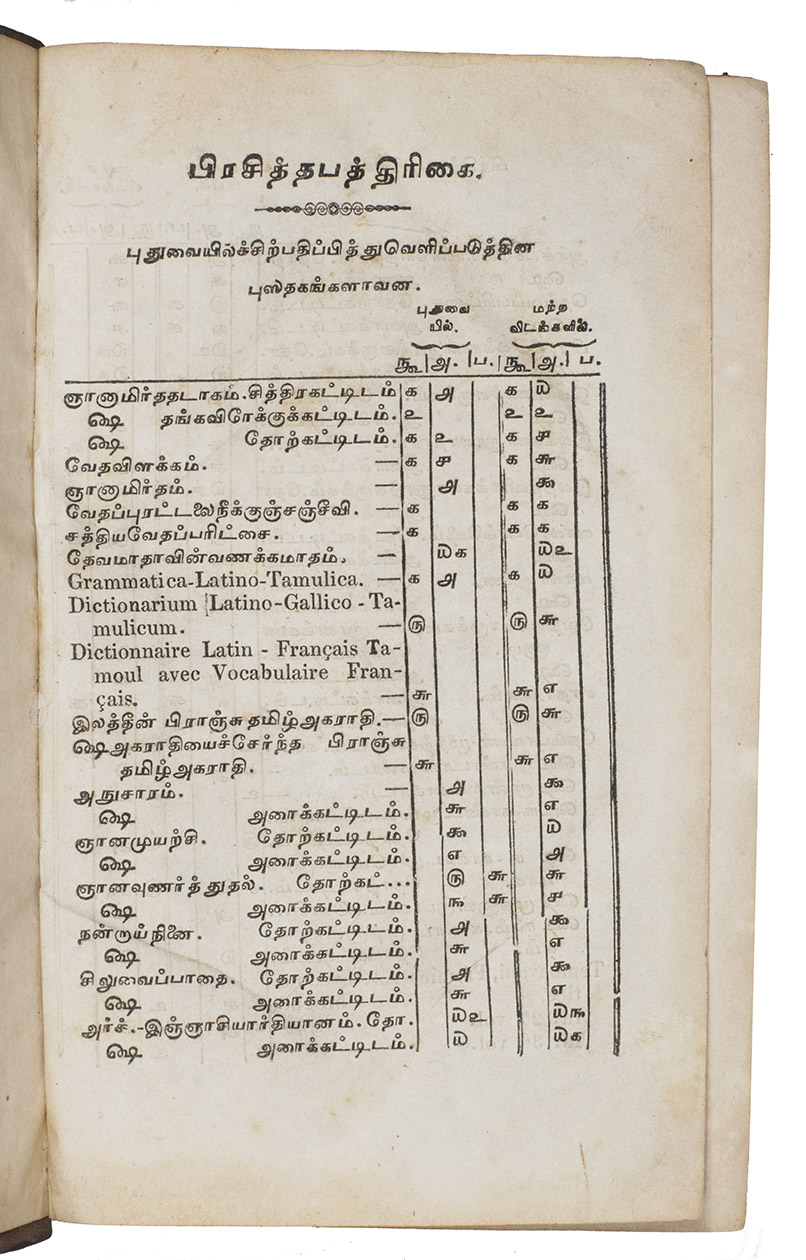 Pondicherry, Imprimerie des Missionnaires Apostoliques de la Dite Congrégation, 1850. 8vo. With the text printed in two columns in roman and Tamil type. Contemporary speckled sheepskin, gold-tooled title label on spine, gold-tooled spine, blue sprinkled edges. [10], 420 pp.