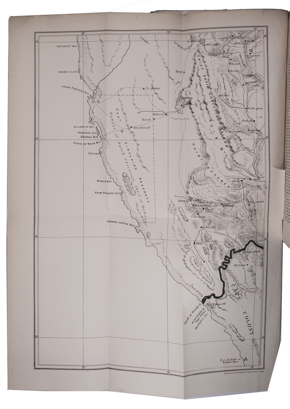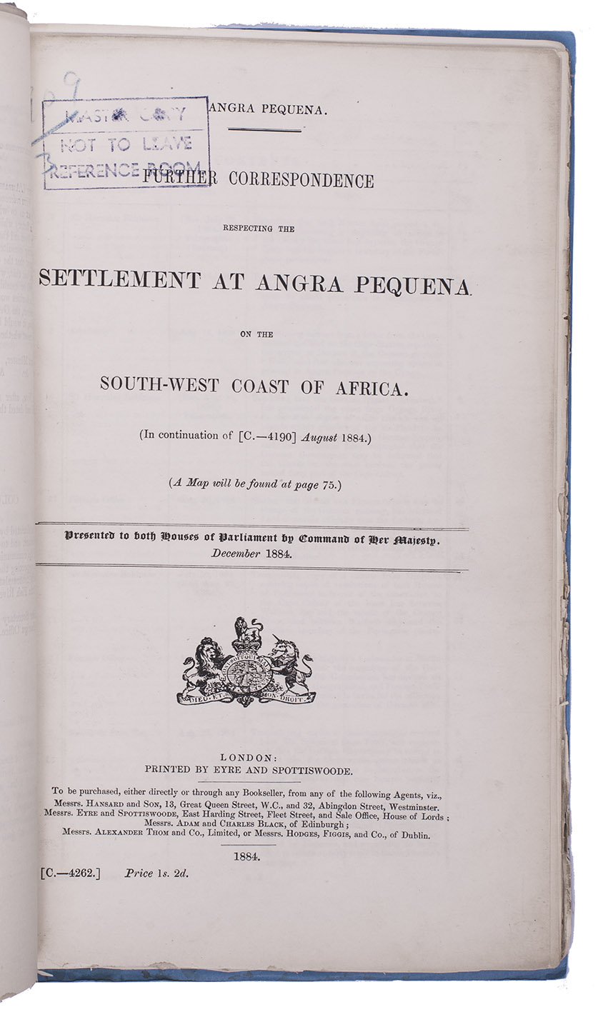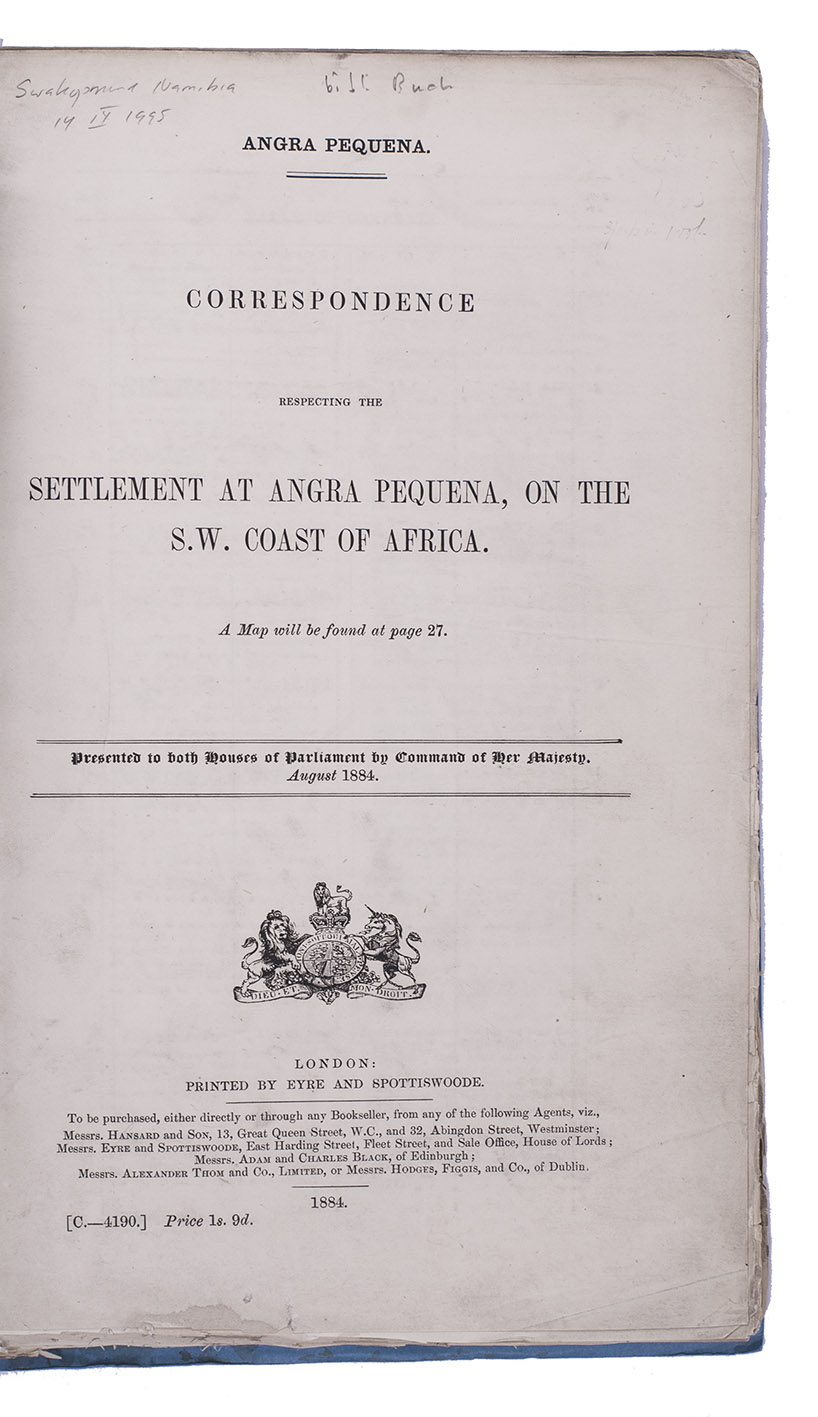 Ad 1: Official publication, presented to the British Houses of Parliament, containing correspondence concerning the German settlement at Angra Pequena or Lüderitz, Namibia. The correspondence starts with four letters written in 1880, the first letter including a translation of a German article expressing the German interest in the region. The following letters and telegrams were written in 1883 and 1884, starting with letters from July 1883, asking whether the rumours that a German trading company has bought Angra Pequena harbour are true. The land had indeed been bought by Adolf Lüderitz (1834-1886), who founded a trading post at Angra Pequena and renamed it Lüderitz. The majority of the following letters discuss the British attitude towards Germany and the new settlement, including evidence of British claim and authority in the area and orders to send gunboats to the bay. The folding map shows a large part of Namibia's coast line.