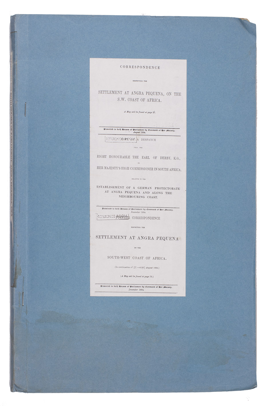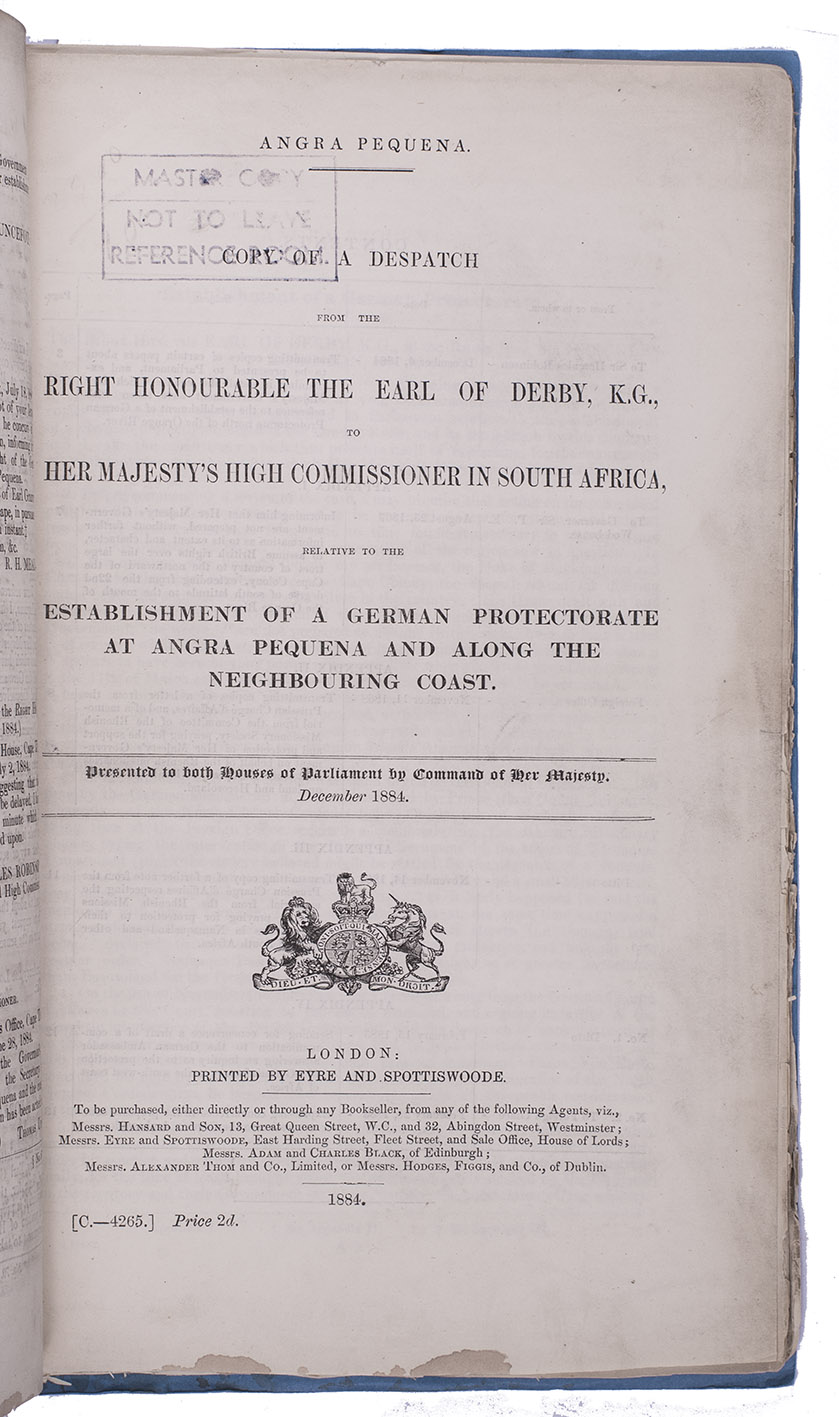 Ad 2: Official publication, presented to the British Houses of Parliament, containing a letter by the Earl of Derby, Colonial Secretary, concerning Lüderitz, with four appendices, including letters and statements from 1867 and 1868. It becomes clear that Britain doesn't have a solid claim on the territory.Ad 3: Official publication, presented to the British Houses of Parliament, containing further correspondence concerning Lüderitz from July to November 1884. Some letters deal with the official statement of the German government to treat Lüderitz as a German protectorate: German South West Africa; others with the exact boundaries of the territories belonging to Germany, Portugal and Britain.