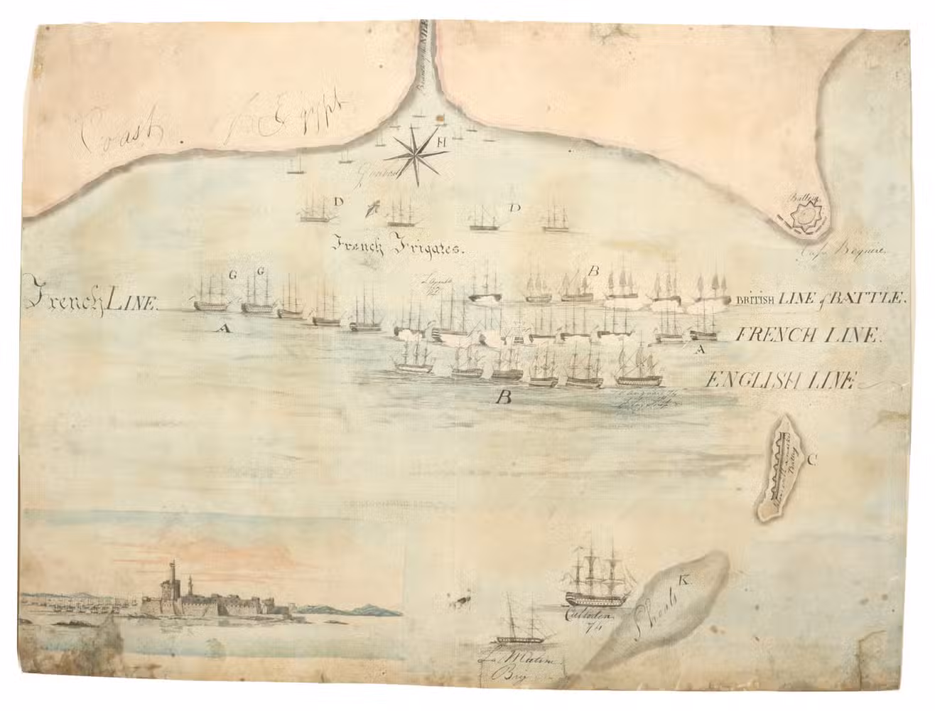 Rare hand-drawn plan of the Battle of the Nile of 1 August 1789, one of the most pivotal naval confrontations of the Napoleonic Wars brilliantly orchestrated by British Rear-Admiral Sir Horatio Nelson against the French fleet anchored in Aboukir Bay. Prepared by an aspired British cartographer on Whatman paper, the leading paper manufacturer in the country, and the inventor of wove paper.