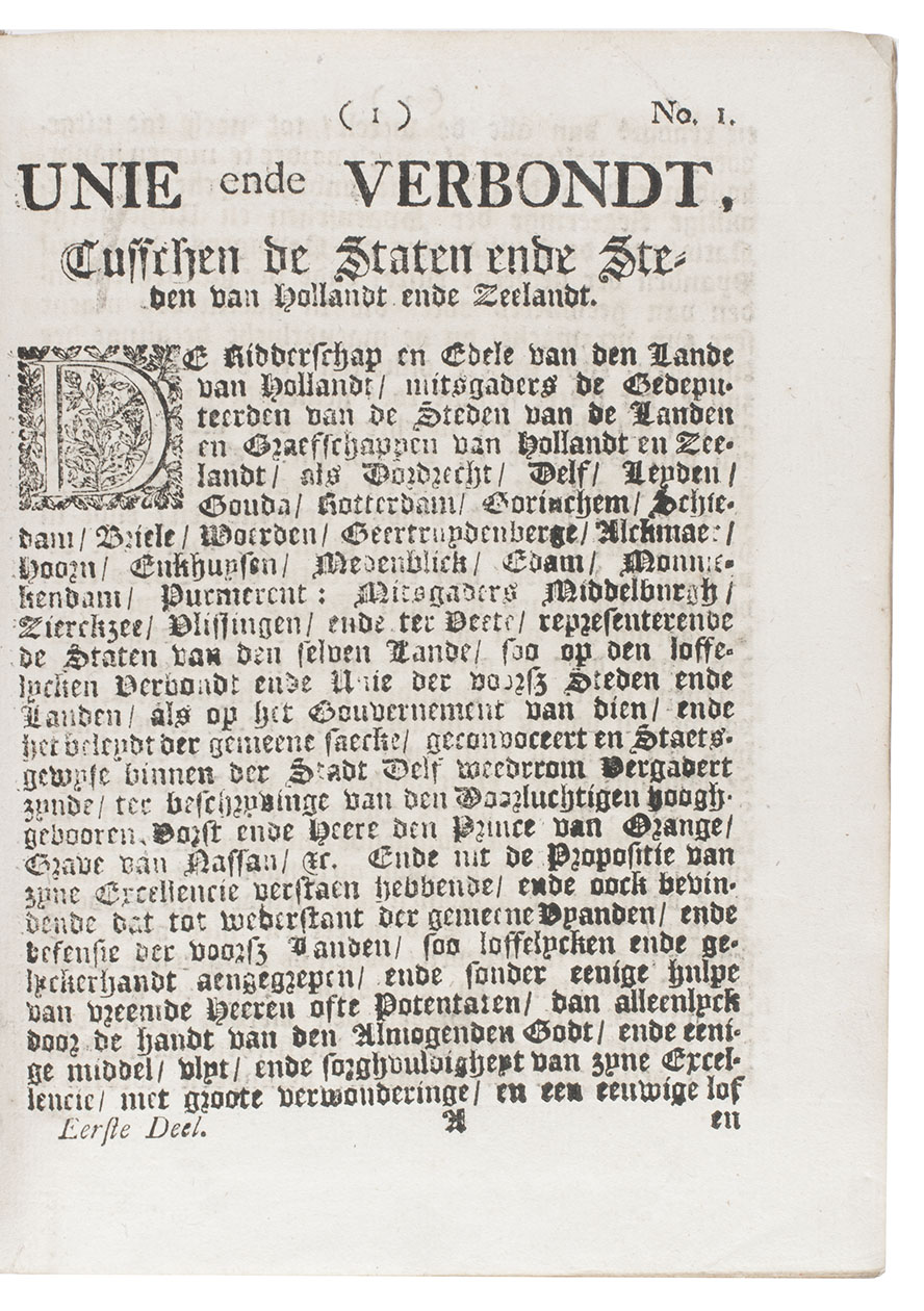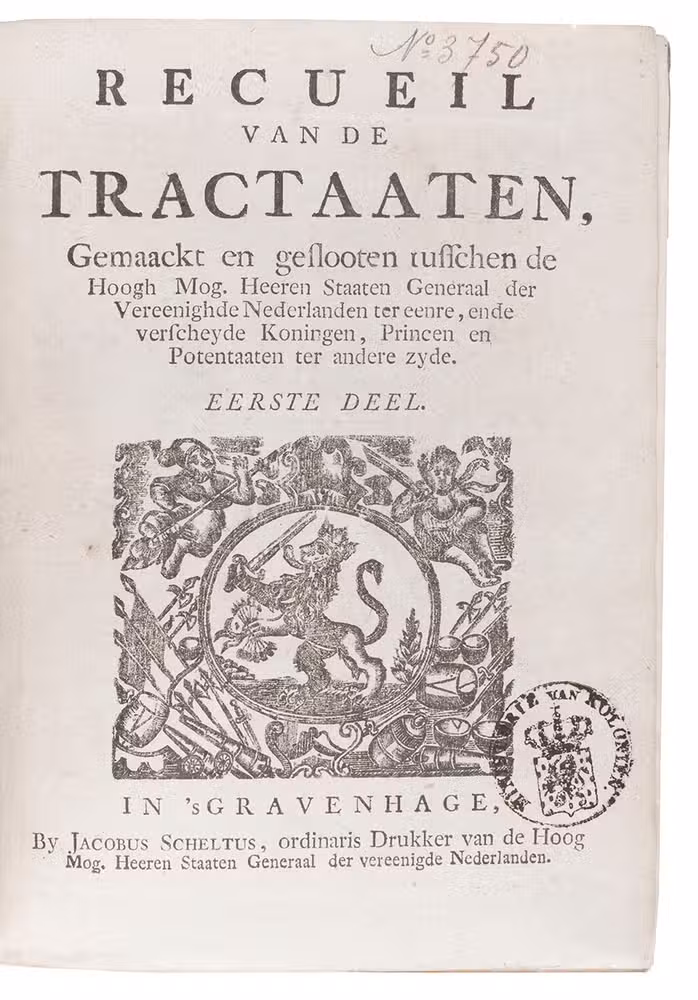Very rare mid-18th-century edition of a collection of 73 treaties between the Dutch Republic and countries in Europe, including Belgium, Denmark, France, Great Britain, Norway, Portugal, Spain and Sweden. Since most treaties concern both the ending of hostilities and overseas commerce, many concern the Dutch East India Company (VOC), the Dutch West India Company (WIC) and the Dutch colonies. Several include translations of the treaties. These documents represent some of the founding documents of the Dutch Republic along with assorted political documents and memorabilia of the Eighty Years War.