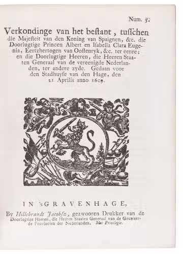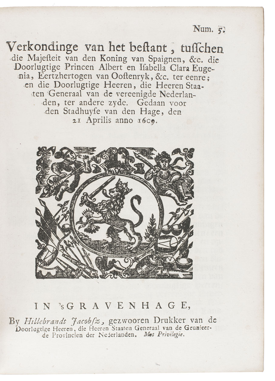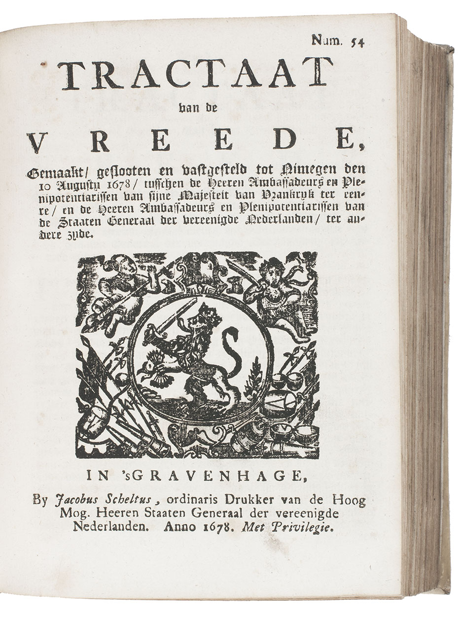 The Hague, Jacobus Scheltus, [between 1742 and 1759]. 4to. With a general title page, followed by an index and 73 treaties, nearly all with their own title page containing the original imprint and a woodcut of the Dutch lion (the arms of the States General) and a few with Van Wouw's printer's device of a snail with the motto "Avec le temps paulatim". Contemporary vellum, straight-sewn on 3 vellum tapes laced through the joints, with a hollow back, with manuscript title on spine.