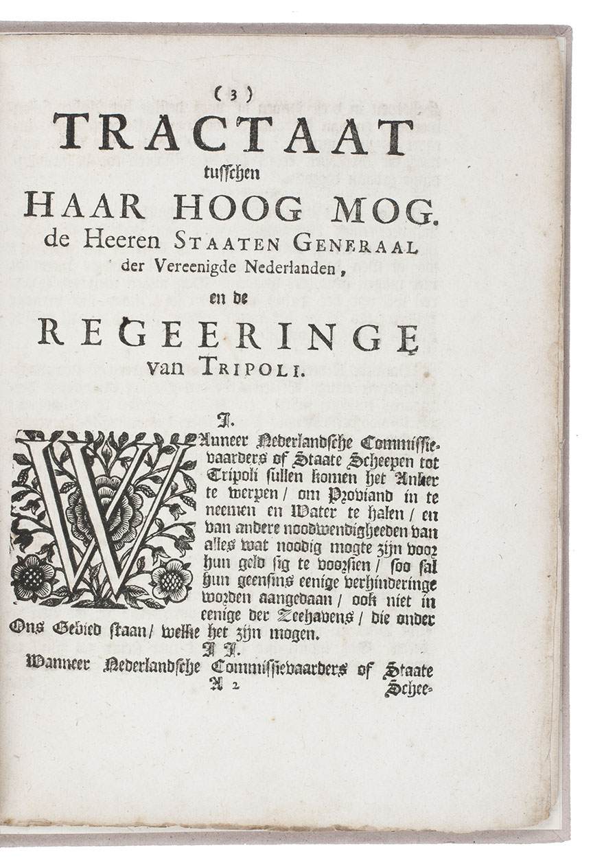 First edition, published in Dutch translation, of a treaty signed between the Dutch States General and Pasha Ahmed Karamanli (1686-1745), Turkish Muslim leader of the semi-autonomous state of Tripoli since 1711, when he killed the Ottoman governor and took the throne. The treaty, in 13 articles, guarantees the safety of Dutch ships trading at Tripoli and their crews (even when shipwrecked), sets restrictions on taxes (military supplies such as gunpowder, lead, iron, cannonballs and ships' masts are exempted). The governor of Tripoli is to see to it that the whole city is warned when one of the Dutch States General's ships drops anchor, so that all who own slaves can keep an eye on them to ensure they do not flee to the ship. Merchants under Dutch authority, whether Christians or Jews, are to be allowed to reside in the city unhindered, except for taxation.