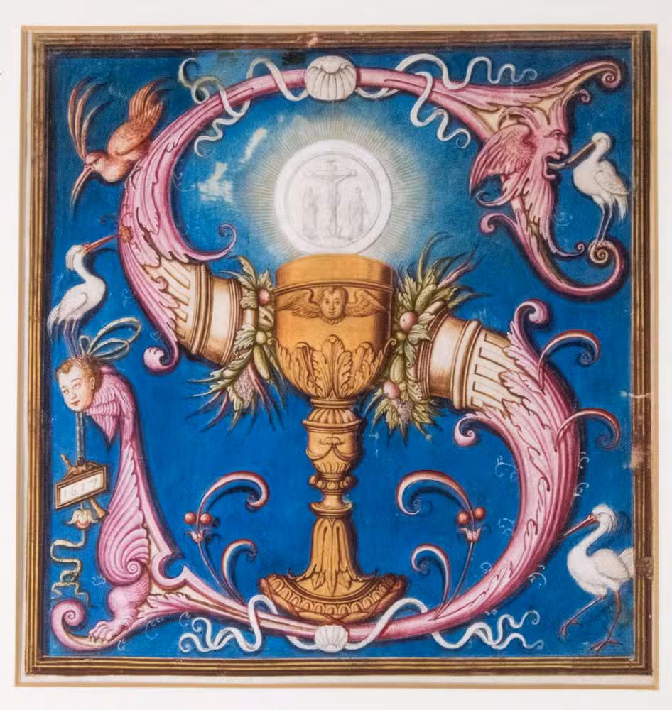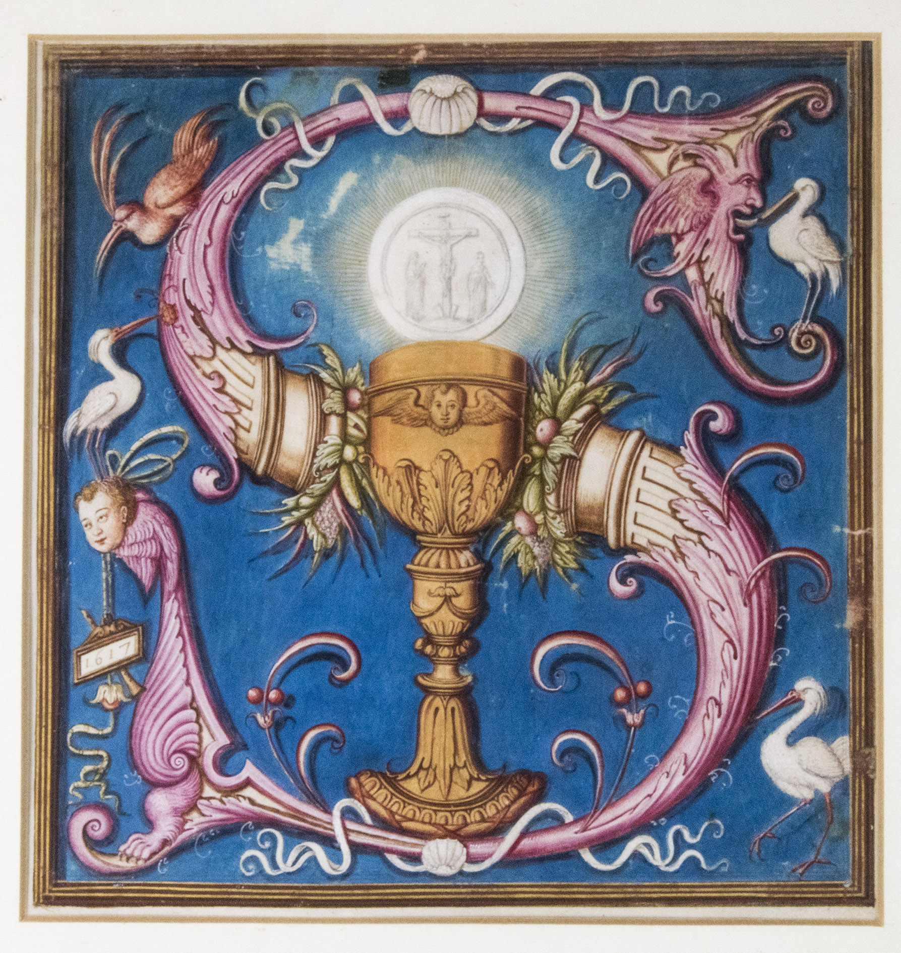 The vibrant work depicts a capital S made up of two cornucopias and a large chalice, surrounded by various birds. Right above the chalice is a small grisaille image of Christ on the cross, surrounded by a gilt halo. The initial was likely originally part of a large choir book, as there is some text written on the back.