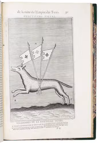 Nicolay's series of engravings of Turkish magistrates and officers (including descriptions) followed by Thomas' collection of emblems, prophesying the fall of the Ottoman empire, as published in the 1620 edition of Laonikos Chalcocondyle's L'Histoire de la décadence de l'Empire Grec. It doesn't have any date or publisher's information itself, but has the same pagination errors described in the copy of Chalcocondyle in the Staatsbibliothek Berlin ("Bl. 32 als 23 gez. und Bl. 64 doppelt gez."). This history concentrates on the later period of the Byzantine empire and was first published in Latin in 1556. The enlarged French translation with additions by Artus Thomas first appeared 1612 and was possibly reissued in 1616 and 1620.