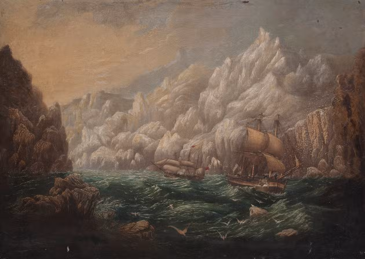 [England?, ca. 1850?]. Oil painting on canvas (65.5 x 91 cm), showing 2 ships in a rough sea amid dangerous rocks and ice. Later mounted on another canvas and stretched over a wooden frame, with a handwritten note about the painting pasted on the back.