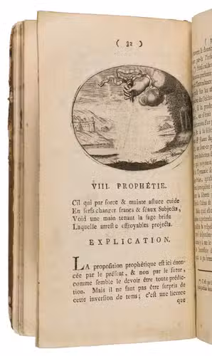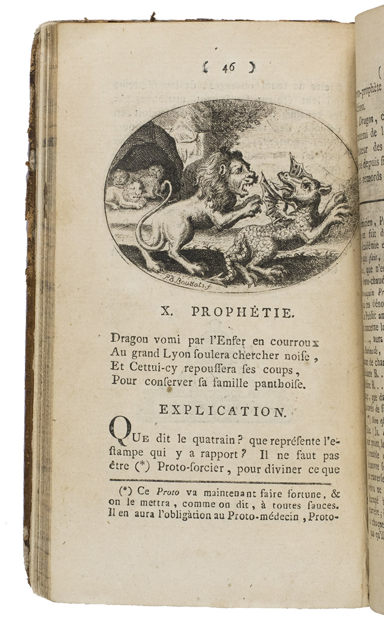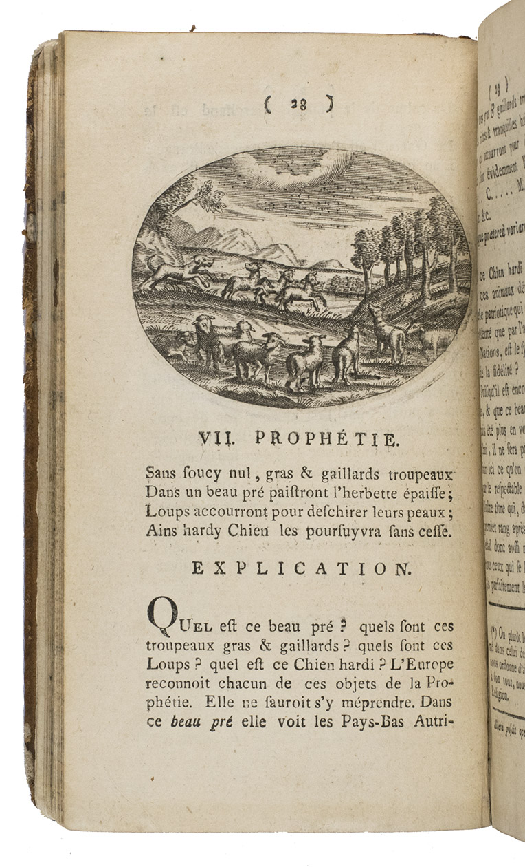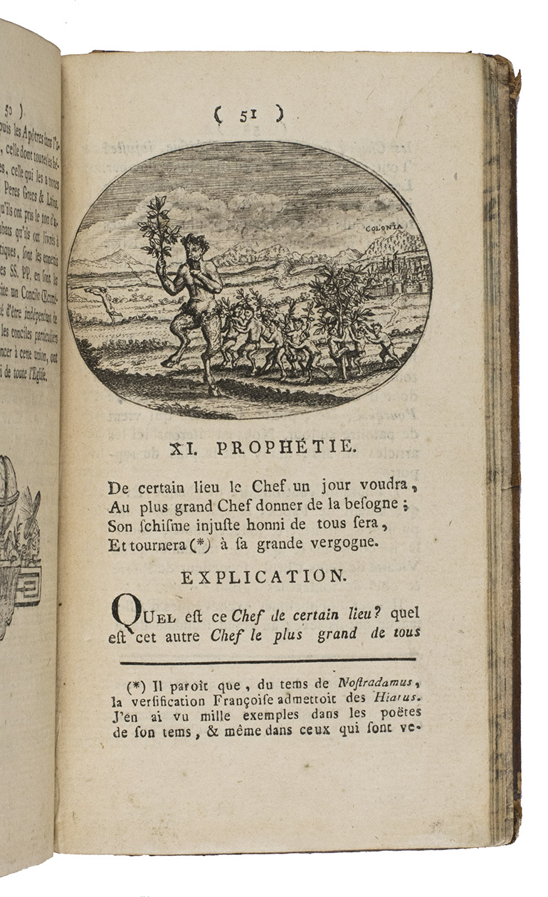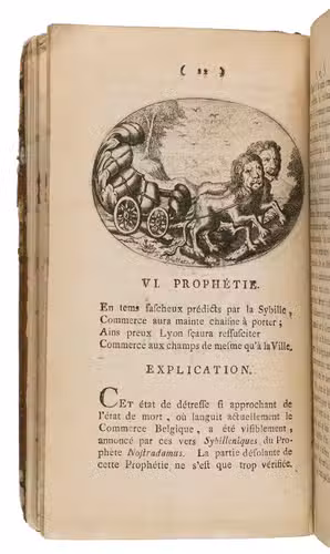 Rare first edition of a work containing 20 adapted prophecies of the French apothecary and seer Michel de Nostradamus (1503-1566). Nostradamus's predictions, first published in 1555 as Les proheties, are here edited by an anonymous author, giving an explanation of and opinion about each prophecy. Each prophecy is preceded by an oval emblematic engraving, 6 signed by the Antwerp-based engraver Pieter Balthazar Bouttats (1666-1756). Since the engravings don't relate to the text, they were probably originally made to illustrate an earlier work, and were reused in the present work.