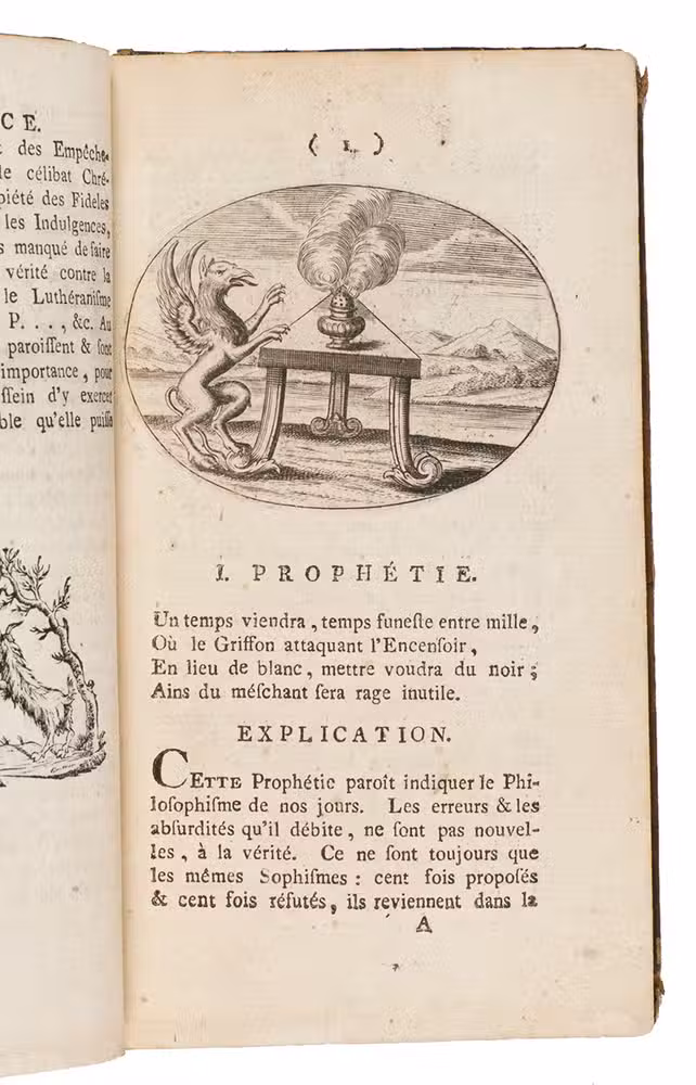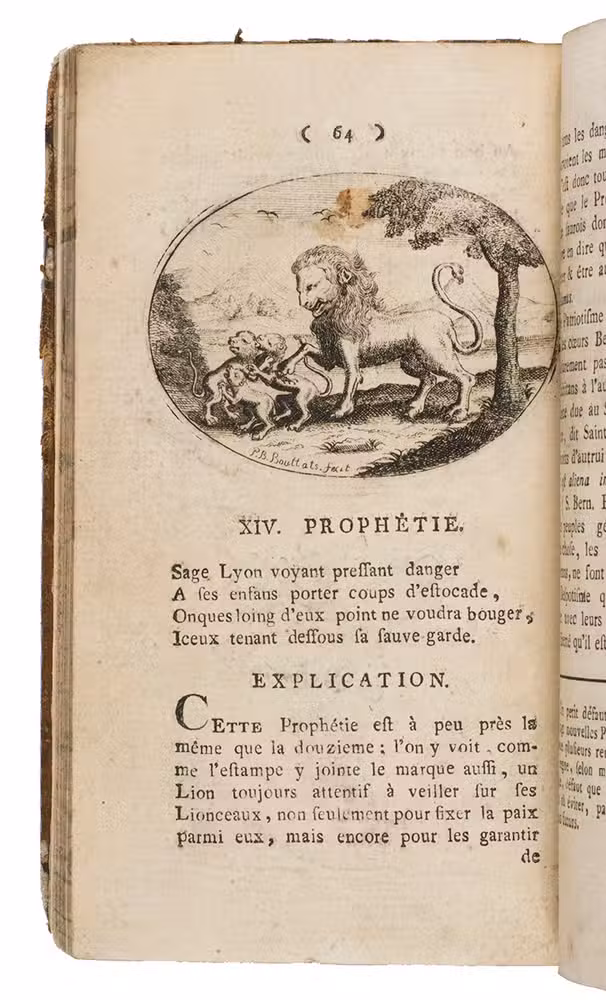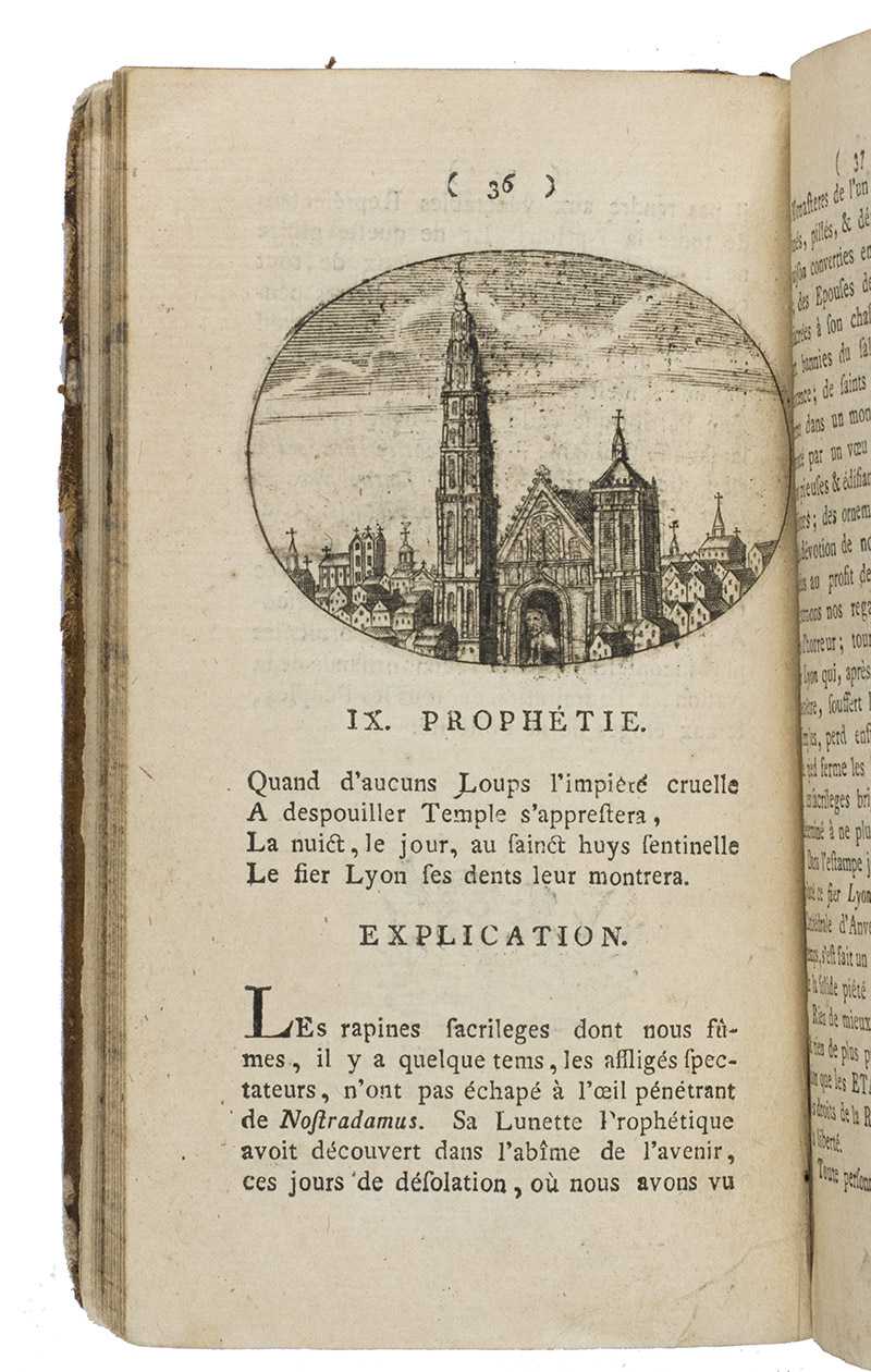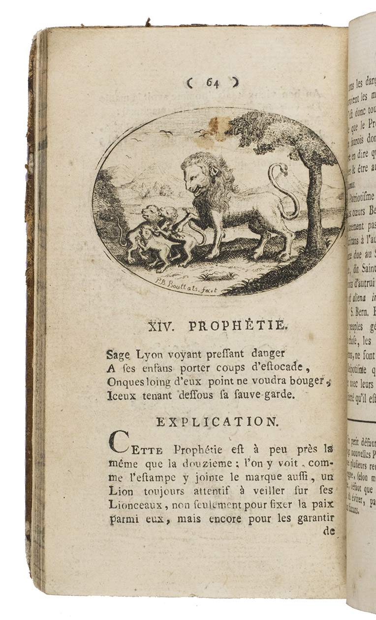 Rare first edition of a work containing 20 adapted prophecies of the French apothecary and seer Michel de Nostradamus (1503-1566). Nostradamus's predictions, first published in 1555 as Les proheties, are here edited by an anonymous author, giving an explanation of and opinion about each prophecy. Each prophecy is preceded by an oval emblematic engraving, 6 signed by the Antwerp-based engraver Pieter Balthazar Bouttats (1666-1756). Since the engravings don't relate to the text, they were probably originally made to illustrate an earlier work, and were reused in the present work.