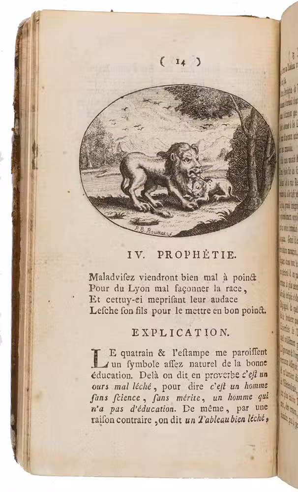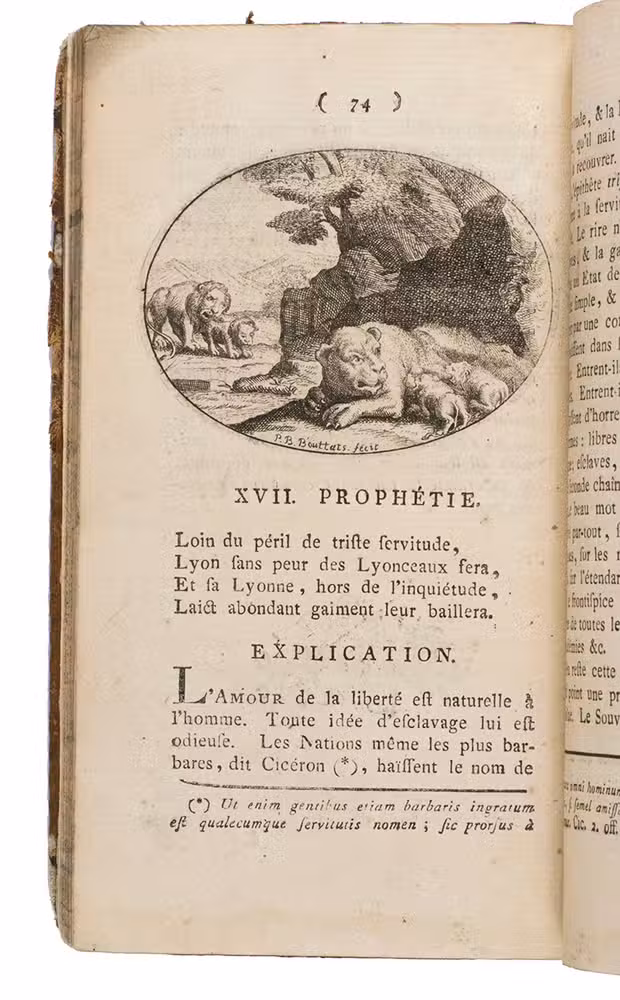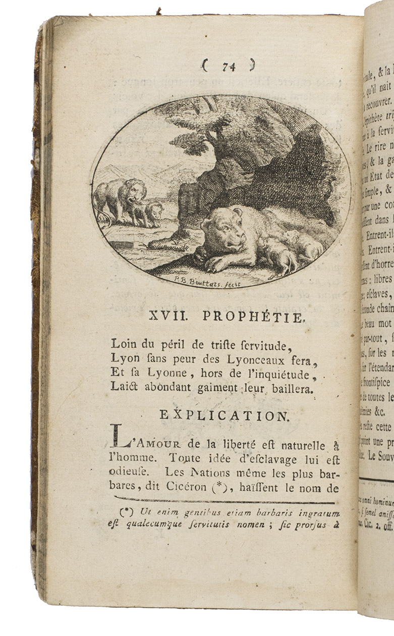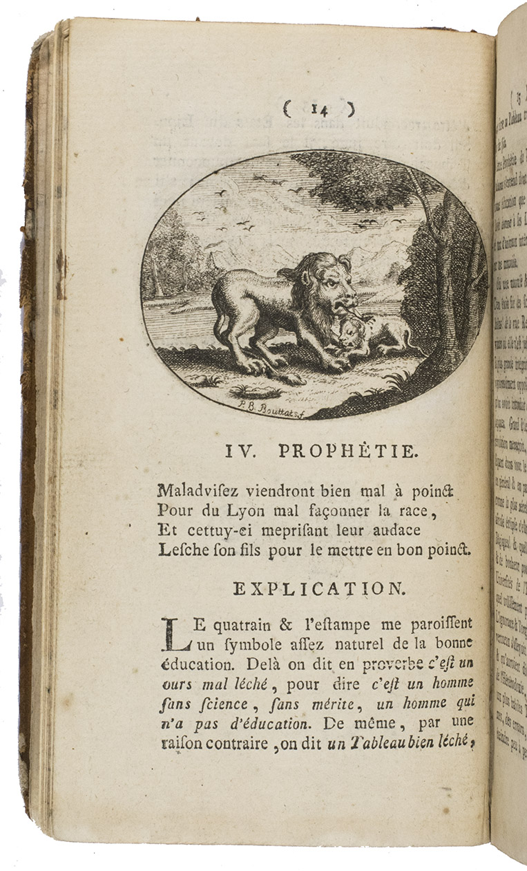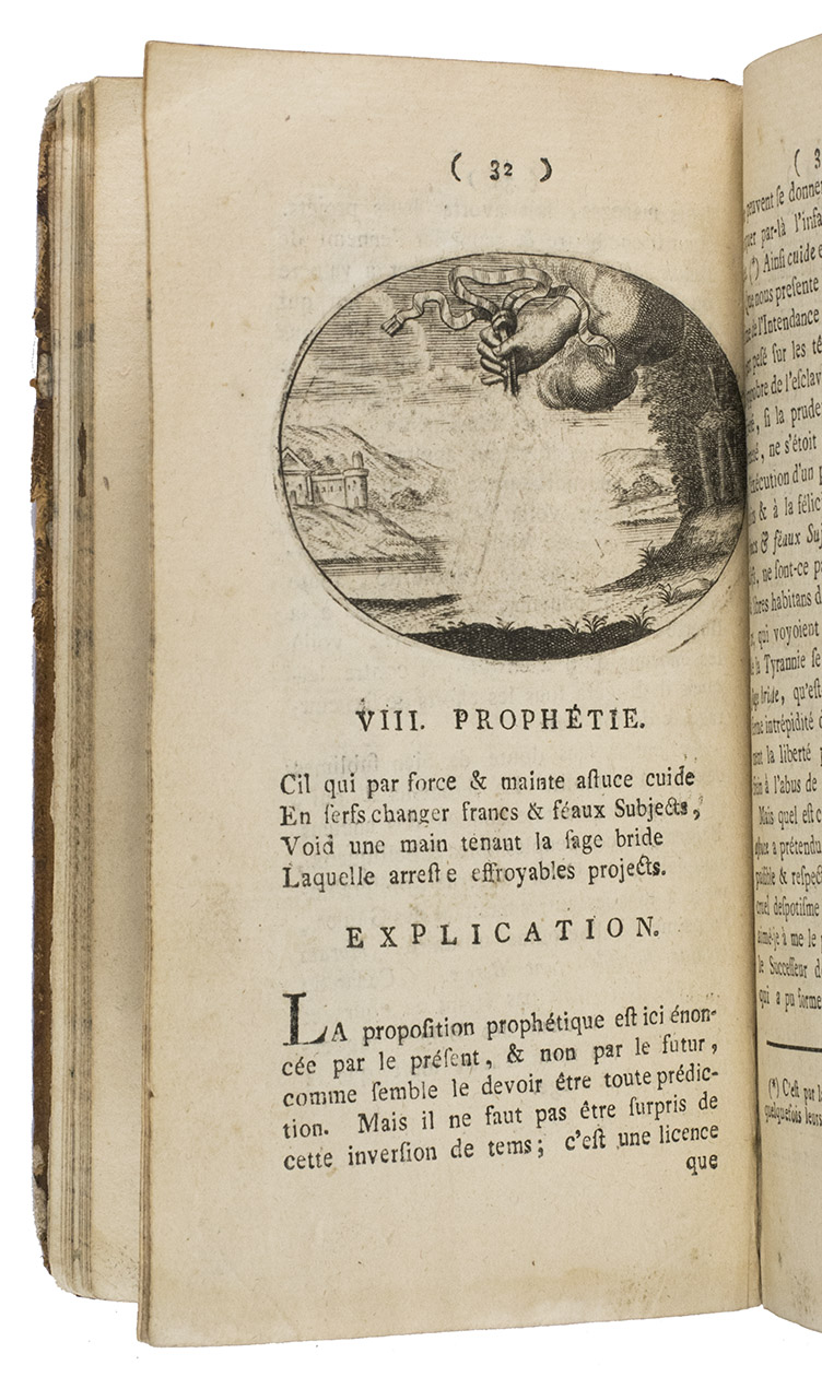 Liège, [ca. 1789]. 8vo. With 20 engraved emblems at the beginning of each chapter, several by Pieter Balthazar Bouttats. Contemporary mottled, tanned sheepskin, gold-tooled spine, marbled edges. VIII, 90, [1], [1 blank] pp.