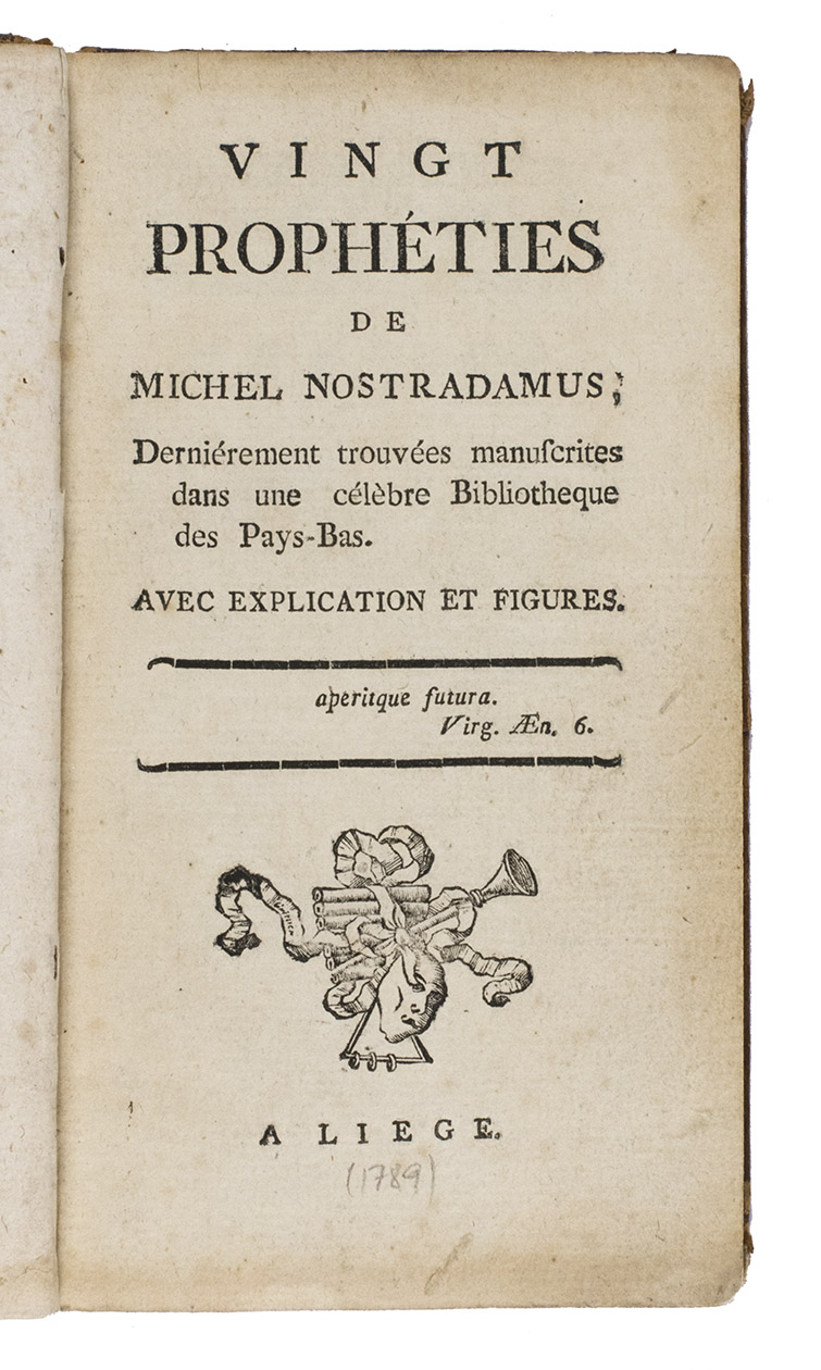 Vingt prophéties de Michel de Nostradamus, derniérement trouvées manuscrites dans une célèbre bibliotheque des Pays-Bas. Avec explication et figures.