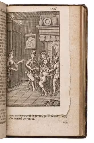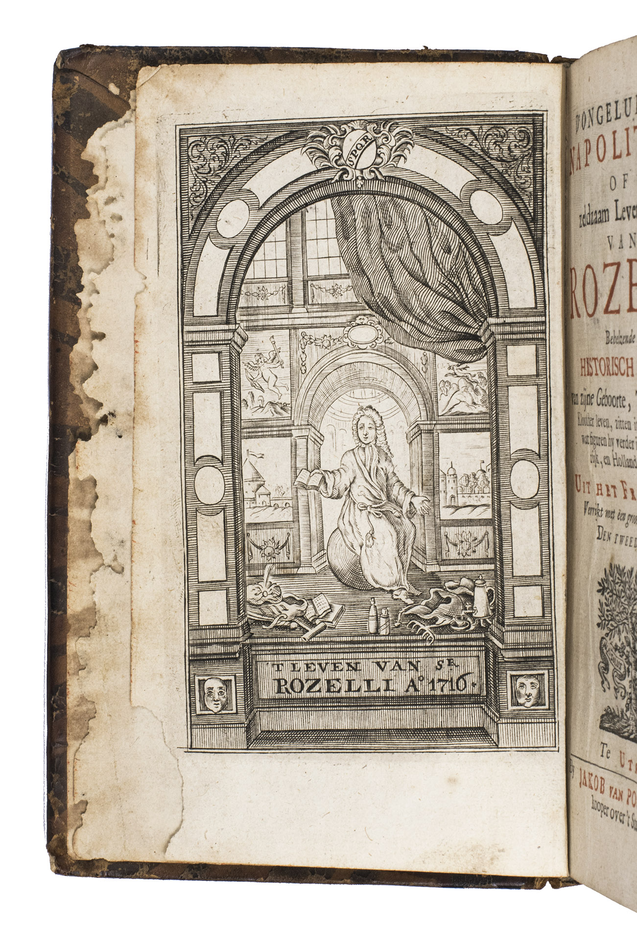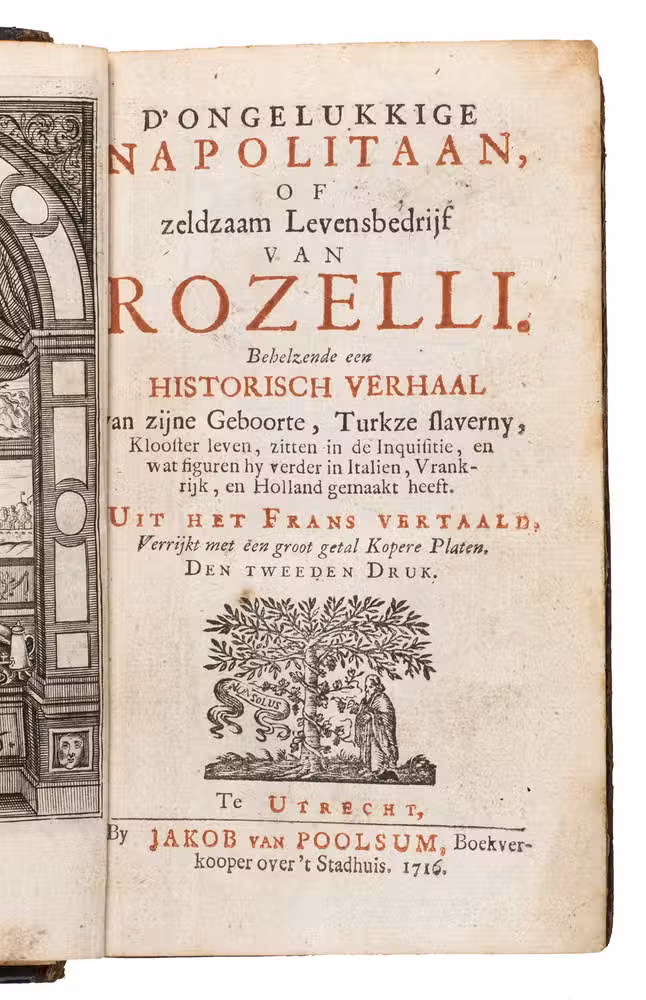 The work was first published in French in 1708 (Paris = Hollande) and 1709 (Amsterdam) as LInfortuné Napolitain ou Les Aventures du Seigneur Rozelli, and was soon translated into English, Dutch, and German. The first Dutch edition was published in 1710 at the same printer as the present second edition. The third and fourth editions appeared respectively in 1722 and 1725, also at Jakob van Poolsum. The last French edition was published in 1781 in 4 volumes. A pseudo-Rozelli story was published at the Hague in 1722.