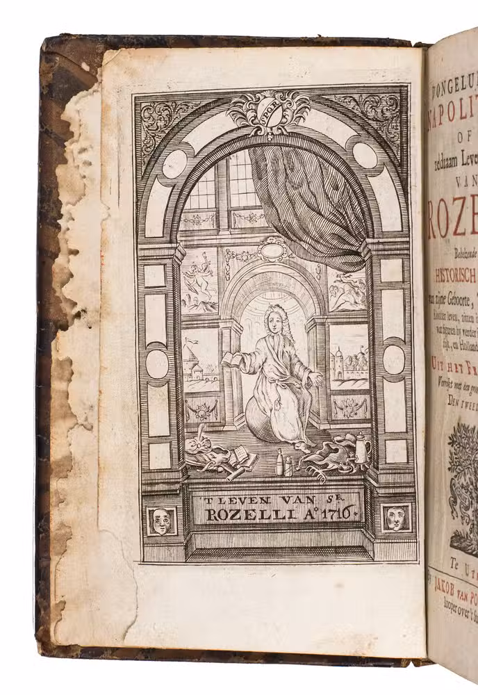 Rare Utrecht edition of an anti-Jesuit satire on the adventures of the unhappy Italian Lucio Rozelli (d. 1719), with beautifully engraved plates. Rozelli was born in Naples, but travelled through Europe and eventually settled in Utrecht, in the Netherlands, where he ran a coffee house. He experienced numerous misfortunes and disasters along the way, was enslaved by the Turks, lived in a monastery, and later converted to Judaism. This popular and rather naughty picaresque novel is now quite rare, with only two copies of the present edition recorded in the Dutch Short Title Catalogue (STCN).