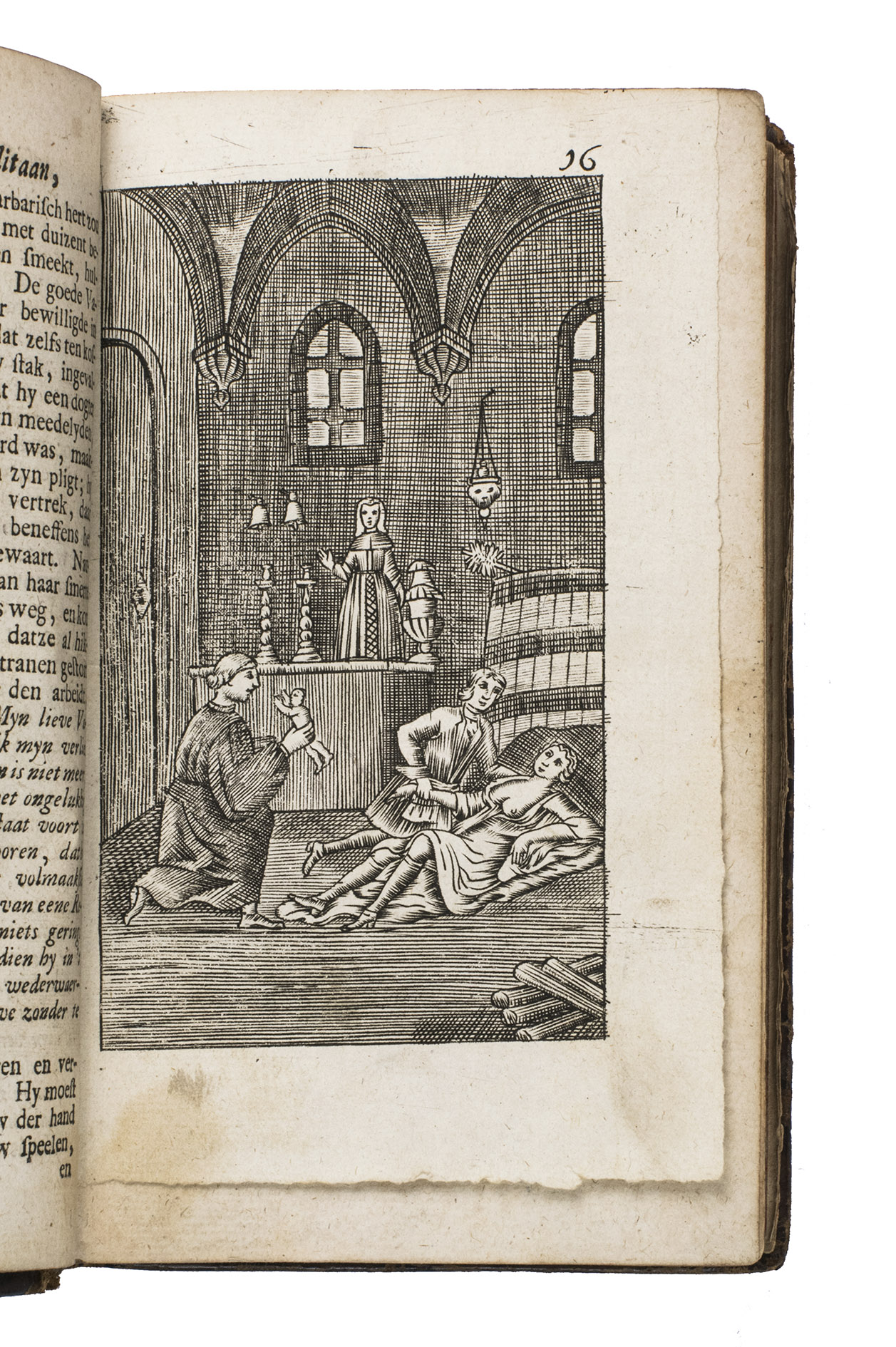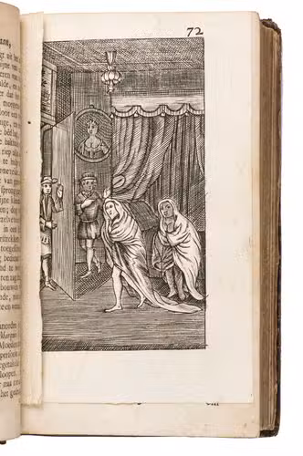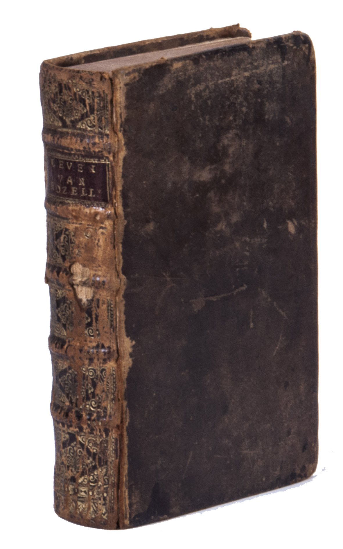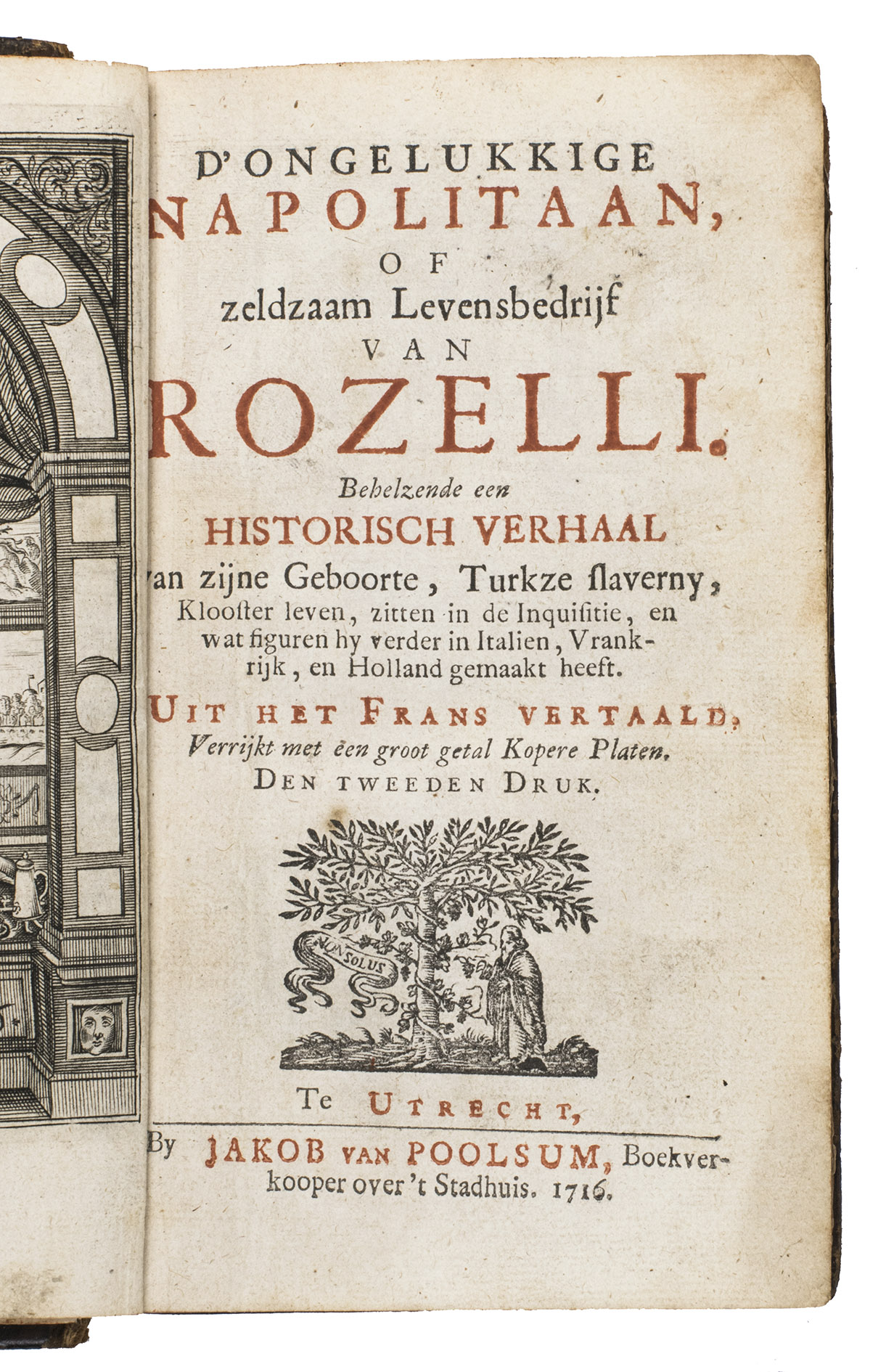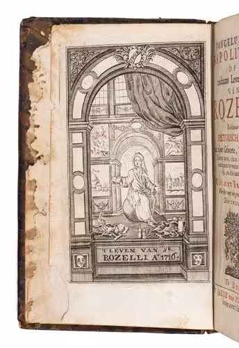 Utrecht, Jakob van Poolsum, 1716. 3 parts in 1 volume. Small 8vo. With a full-page engraved frontispiece, a letterpress title in red and black, 16 full-page engraved plates, several woodcut head- and tailpieces, and woodcut initials. Contemporary gold-tooled calf, sewn on 5 supports with the corresponding raised bands on the spine, a red morocco title label on the spine with the text "Leven van Rozelli" lettered in gold, red sprinkled edges. VI, 484, 36 pp.