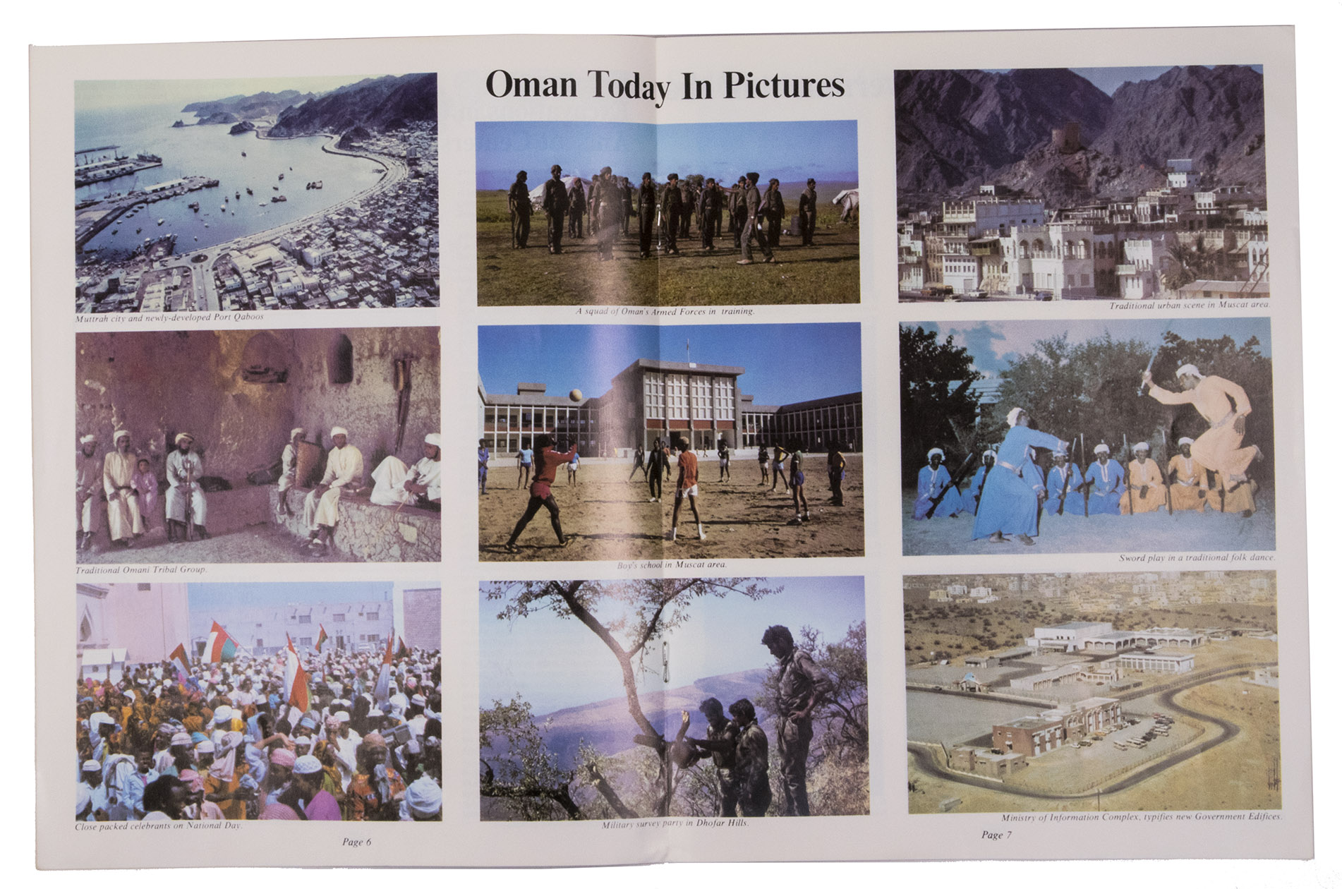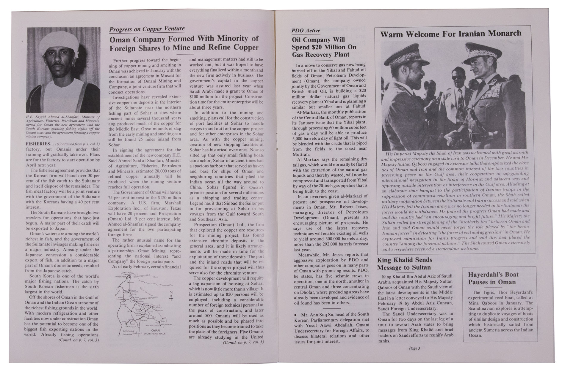 Four issues of two different magazines issued by the Embassy of Oman in Washington: one issue of the Oman news, including articles on president Sadat's visit to Oman, minister al-Zawawi's visit to Saudi Arabia and King Khalid's visit to Oman; and three issues of the Oman report, including articles on His Majesty Sultan Qaboos, Oman's relation to the United States, archaeological excavations north of Muscat, portraits of the government of Oman, the forming of the Omani mining company, the building of a gas recovery plant, a new oil discovery in Dhofar and the legal system of Oman.
