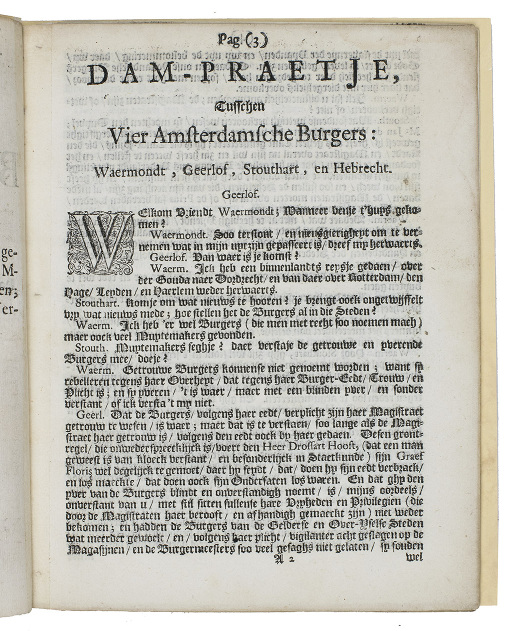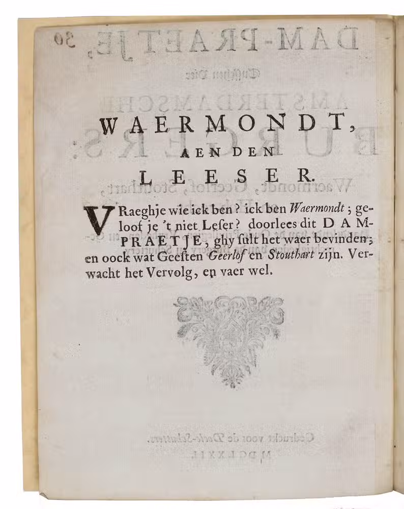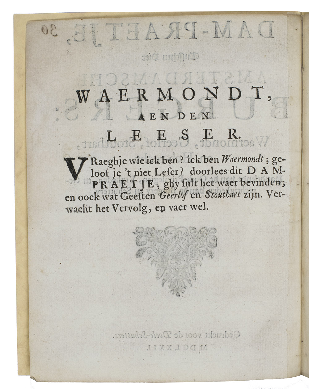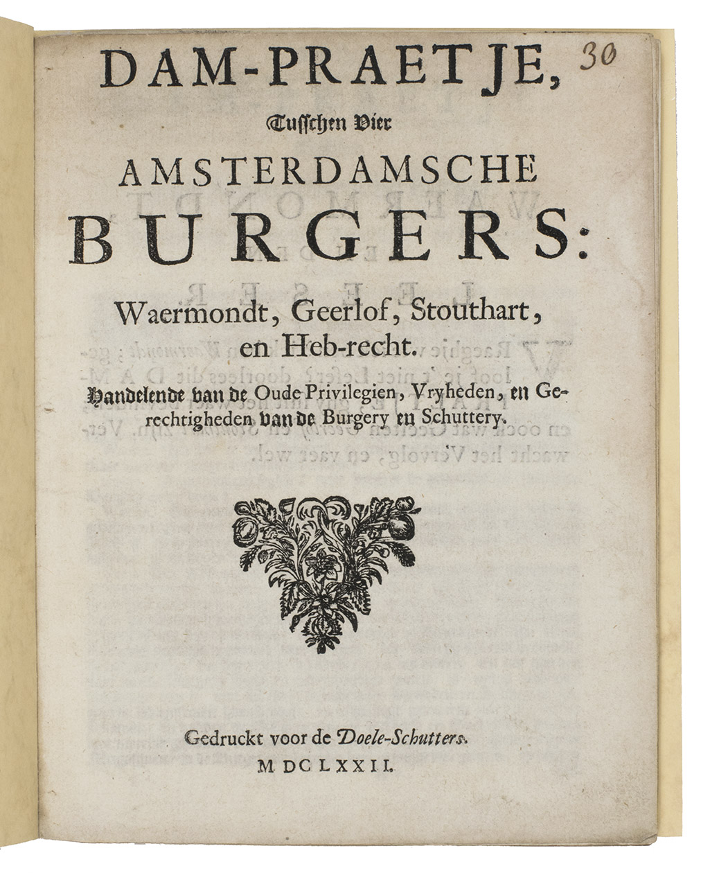 Dam-praetje tusschen vier Amsterdamsche Burgers: Waermondt, Geerlof, Stouthart en Heb-recht. Handelende van de oude privilegien, vryheden, en gerechtigheden van de burgery en schuttery.