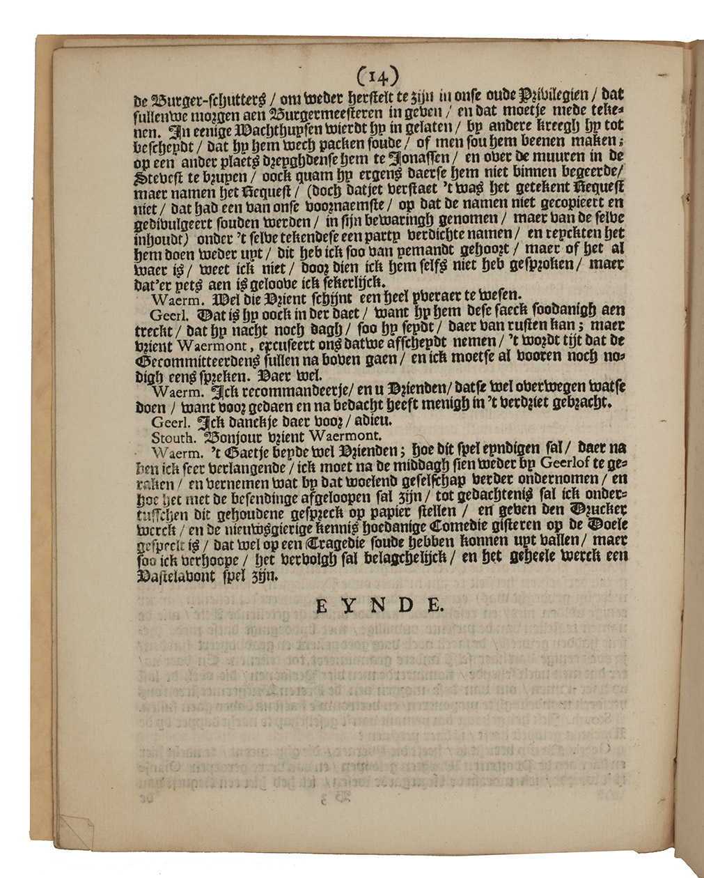 Important pamphlet originating in the so-called Doelenlopersbeweging a democratic and Orangist movement against the Amsterdam Patriciate with its nepotism and autocratic stuctures during September 1672, the Rampjaar (the Disaster Year) of the Republic of the Seven United Netherlands. In this year, the Dutch Republic was attacked by England, France and the dioceses of Cologne and Munster, and the two regents and brothers Johan and Cornelis de Witt were publicly murdered by a rebellious and furious crowd in The Hague. These were turbulent times and the production of pamphlets was higher than ever.