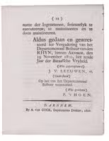 Gelykheid, vryheid. Publicatie. Het departementaal bestuur van den Rhyn ... doet te weten: ... dat verscheiden lieden, uit vreze voor gestrenge examina, ... zich haasteden, om, vóór de invoerings des geneeskundigen bestuurs, zich, voornamelyk ten platten lande, en in kleine steden, alwaar geen toereikend geneeskundig toeverzicht plaats had, ter uitoeffening der genees- heel- verlos- en artsenymengkunde, neder te zetten ...