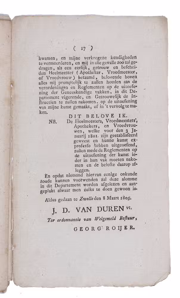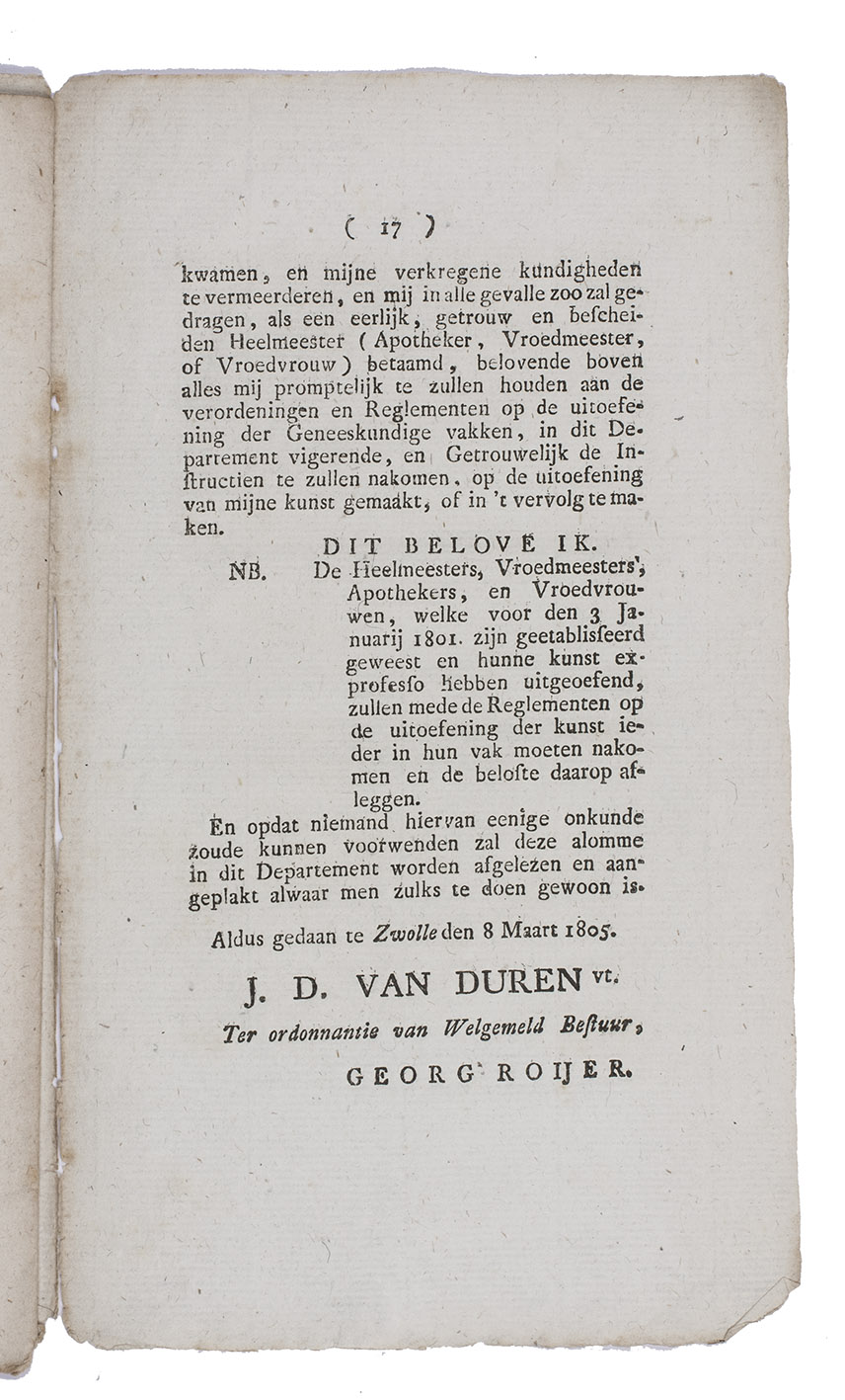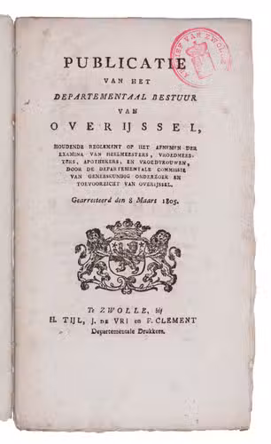 Publicatie van het departementaal bestuur van Overijssel houdende reglement op het afnemen der examina van heelmeesters, vroedmeesters, apothekers, en vroedvrouwen, door de departementale commissie van geneeskundig onderzoek en toevoorzicht van Overijssel. Gearresteerd den 8 maart 1805.