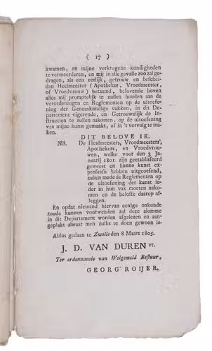 Zwolle, H. Tijl, J. de Vri & F. Clement, 1805. 8vo. With a woodcut coat-of-arms of Overijssel on the title-page. Bound as sewn. [2 blank], 17, [1 blank] pp.