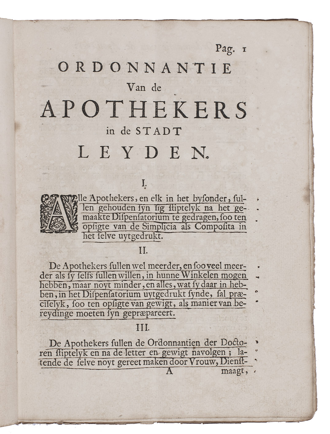 Ordonnantie voor het Collegium Pharmaceuticum, ende het gehele gilde van de apothekarissen binnen de stadt Leyden.