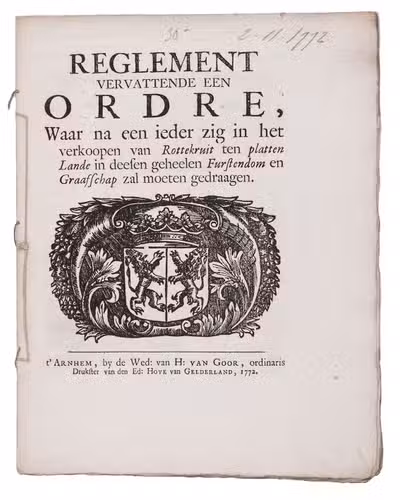 Reglement vervattende een ordre, waar na een ieder zig in het verkoopen van rottekruit ten platten lande in deesen geheelen furstendom en graafschap zal moeten gedraagen.