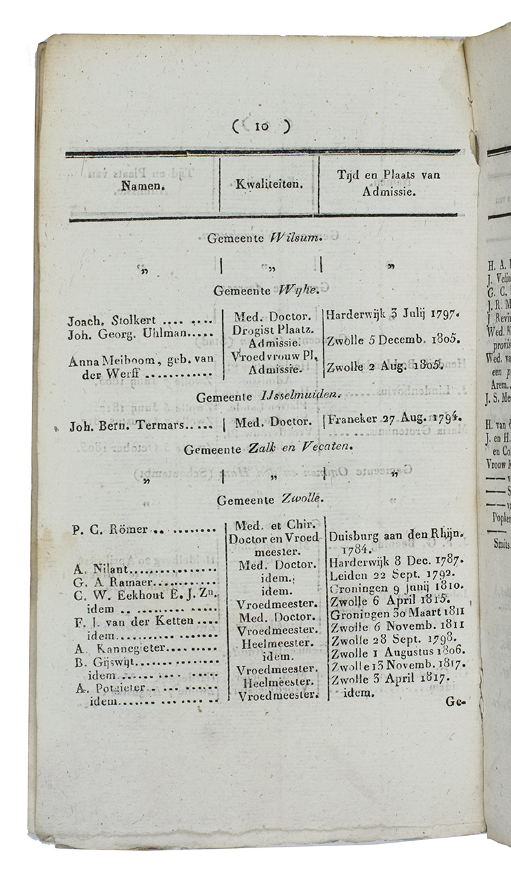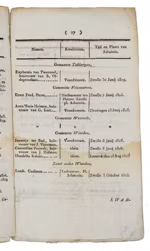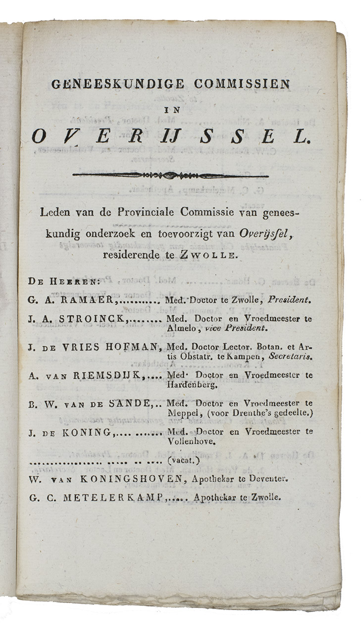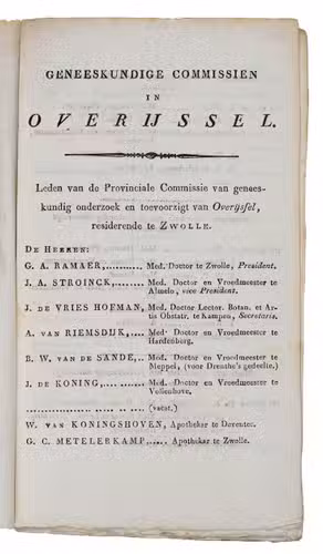 List of the qualified physicians, surgeons, obstetricians, surgeons in the countryside, pharmacists, midwifes, and druggists in the Dutch province Overijssel in the year 1821, issued by the Commission of Medical research and Supervision at Zwolle, signed at the end by G.A. Ramaer, President, and J. de Vries Hofman, secretary, Zwolle, 26 February 1821; and arrested by the Gouverneur of the province of Overijssel, B.H. Bentinck, Zwolle, 10 April 1821 (p. 21).