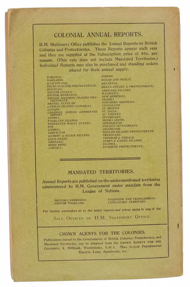 Detailed report to the Mandates Commission of the League of Nations regarding the British controlled Mandate of Palestine. After the collapse of the Ottoman Empire after World War I, the Empires territories in the Middle East were divided between Great-Britain and France, with the exception of the newly created Kingdom of Saudi Arabia, and ruled as mandates on behalf of the League of Nations. The Mandate of Palestine was one of the territories governed by Great-Britain on behalf of the League of Nations and the British government had to produce an annual report of the territorys government for the League of Nations. The first proper report was produced in 1924 and they were produced every year thereafter until 1938. The reports contain extensive information on the region at that specific period, describing the economy, politics, judicial system, public health, technological works and religious matters. The growing unrest in the Arab population and its strife for independence, which would lead to the 1936-1939 revolt against British rule, is already clearly visible in the report.