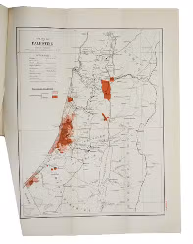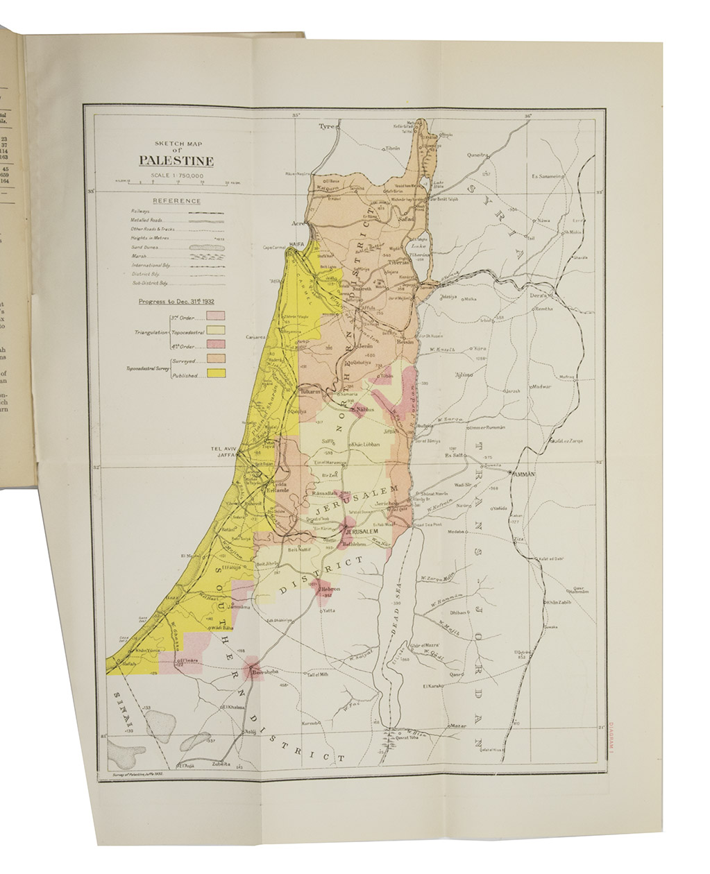 London, His Majesty's Stationary Office, 1933. 4to in 16s. With two folding maps showing parts of the Palestine territory that had been surveyed in detail.Original publisher's printed wrappers. XII, 267 pp.
