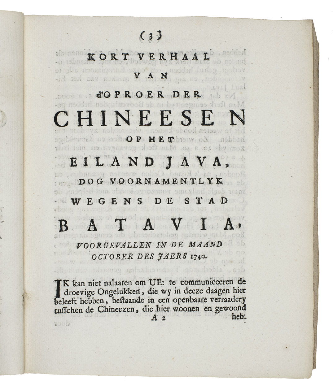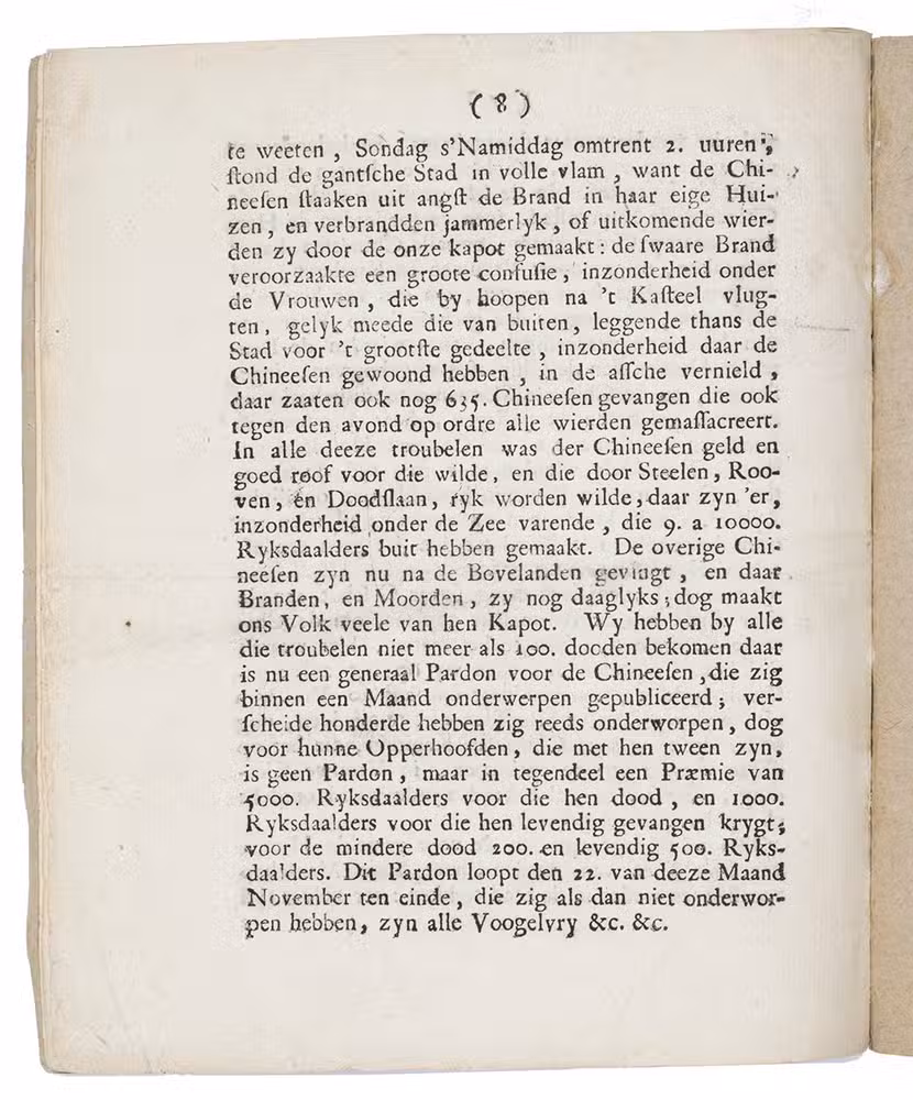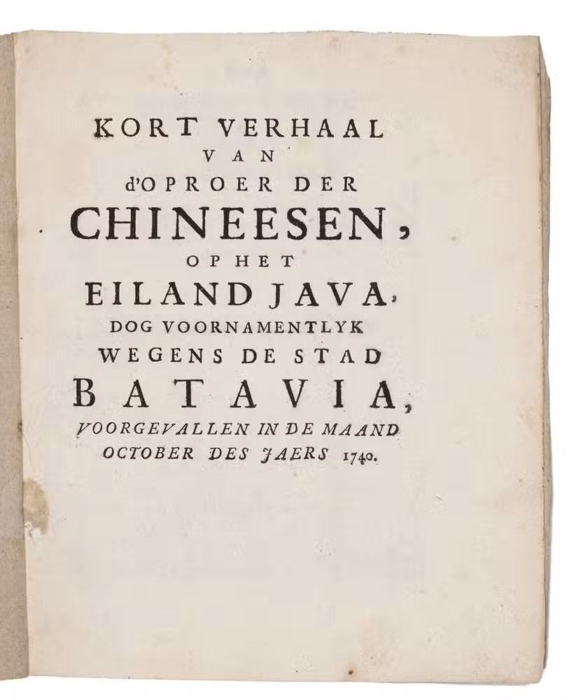 Very rare first and only edition of a short but very detailed eyewitness account of one of the most violent and terrible events in Dutch colonial history: the pogrom in which Dutch soldiers and native collaborators killed ethnic Chinese residents of the city of Batavia (now Jakarta). The anonymous author appears to have been a Dutch soldier, for he notes that "we" had only 3000 able men, "we" lost only 100 men, Chinese were killed by "ours" and that even at the time of writing, after order was restored in the city, "our folk" were still killing many Chinese outside the city. He must have written in the last week of November 1740, for he refers to the 22nd of "this month" November. He clearly accepts the massacre as justified and shows no sympathy for the Chinese. The violence in the city lasted from 9 to 22 October 1740, with, as the present account shows, Dutch troops continuing to kill Chinese outside the city walls until at least the last week of November. Historians have estimated that at least 10,000 ethnic Chinese were massacred, almost a quarter of the Batavian population; just 600 to 3,000 are believed to have survived, so about 80 or 90 percent of the Chinese were massacred.