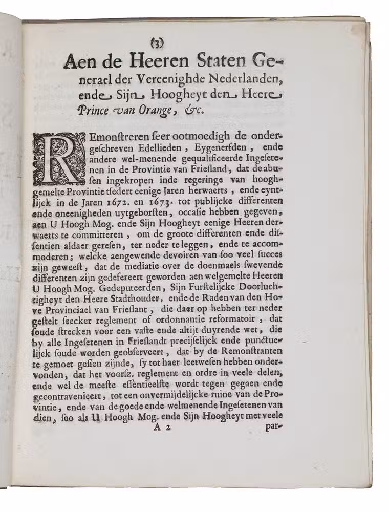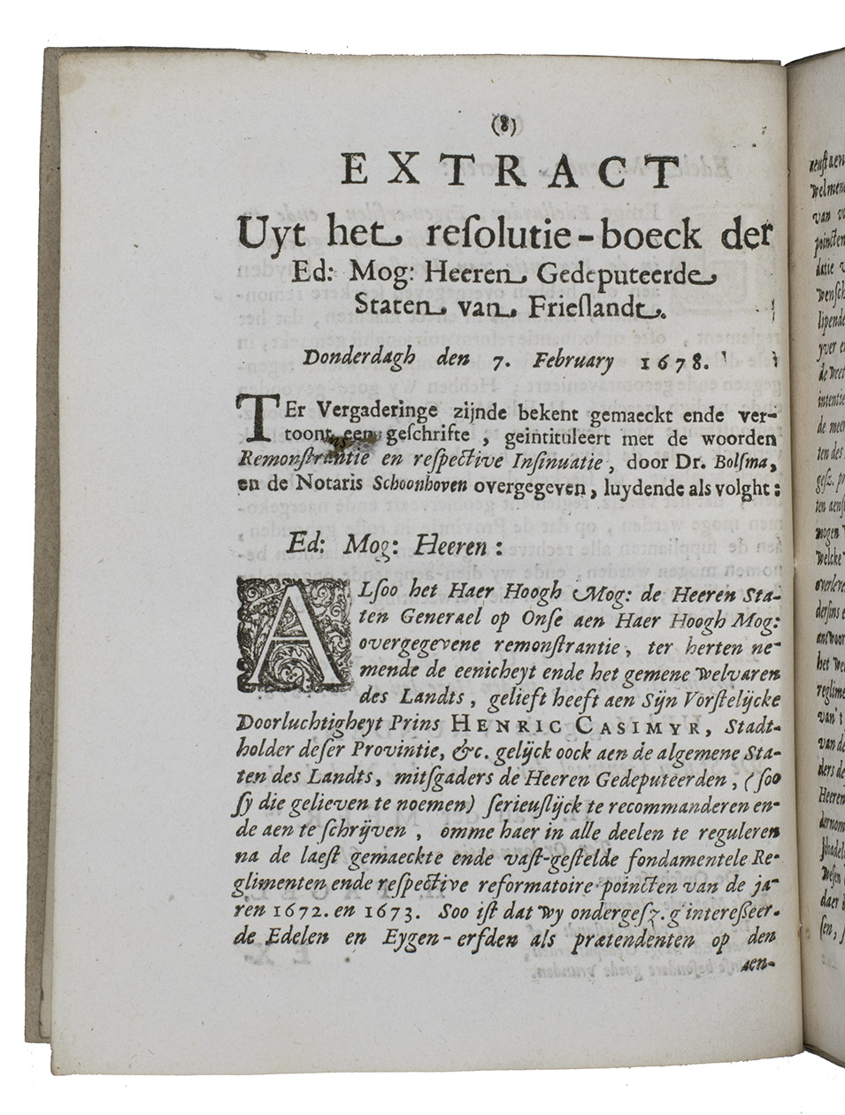 First issue published in February 1678 on a petition presented to the States General by a number of Frisian noblemen and qualified citizens with complains and accusations regarding the appointment of magistrates and the judicature in Friesland; extract: letter and answer to the States Generals letter of 4 February, dated Leeuwarden, 14 February 1678, followed by the letter of the States of Friesland to the States of Holland and West Friesland on the same subject.