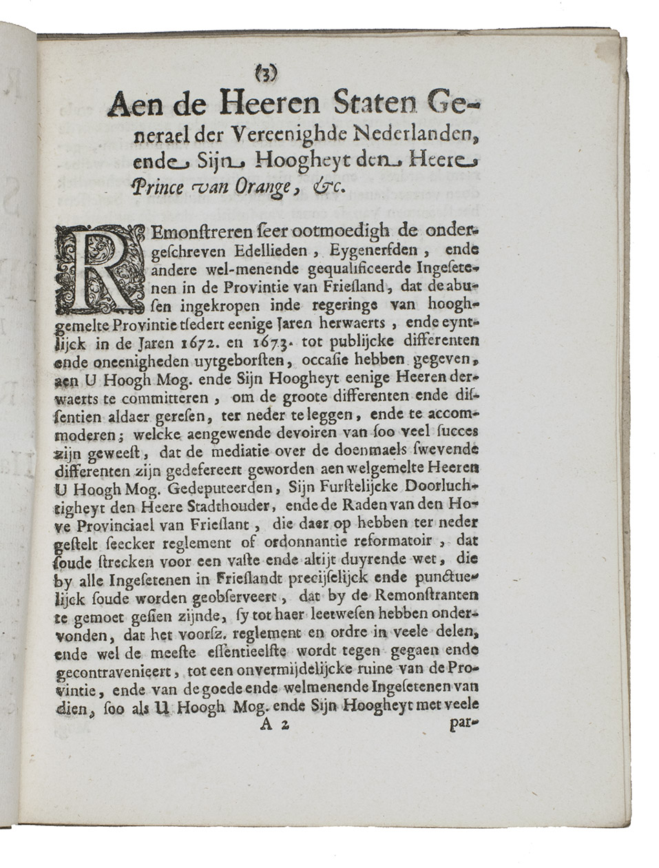 Leeuwarden, Rinnert Sydtses Arumsma, 1678. 4to. With the woodcut coat-of-arms of the States General on the title-page and woodcut initials. Later brown wrappers. 20 pp.