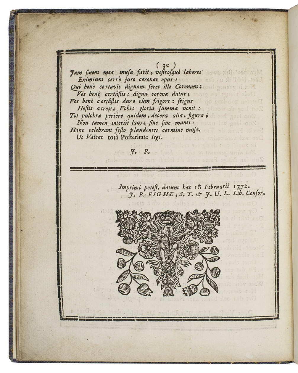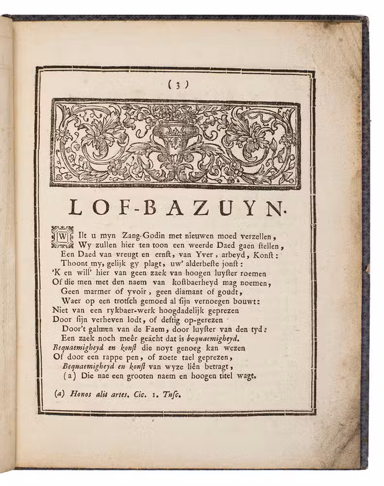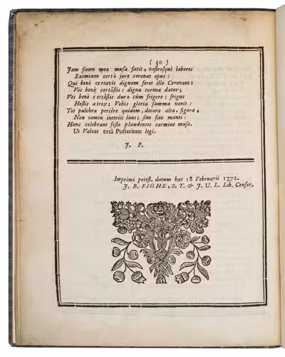 Antwerp, Joannes Petrus de Cort, 1772. 4to. With title-page in a geometric border built up from cast fleurons and each page in a thick-thin border built up from cast units. 19th-century(?) decorated cloth, modern endpapers. 30 pp.