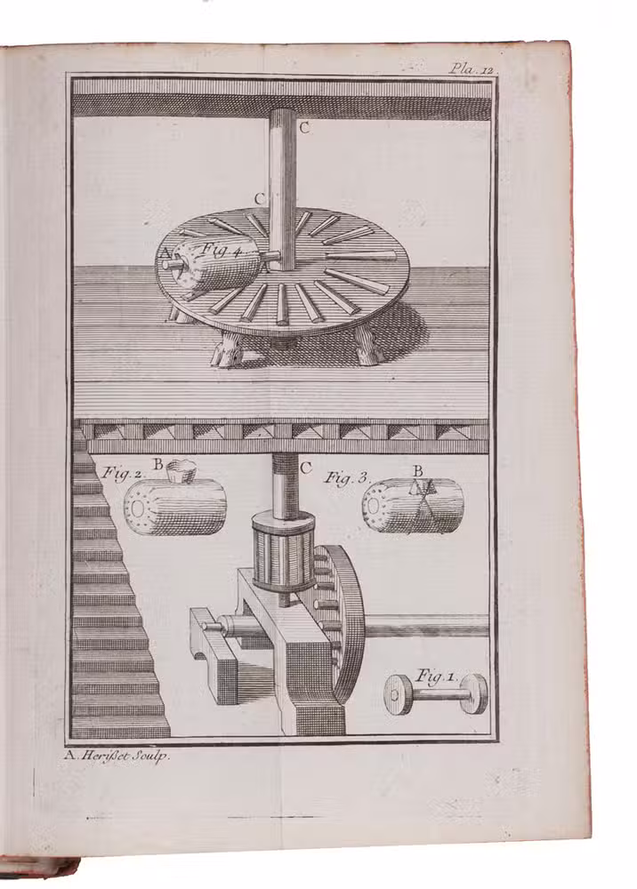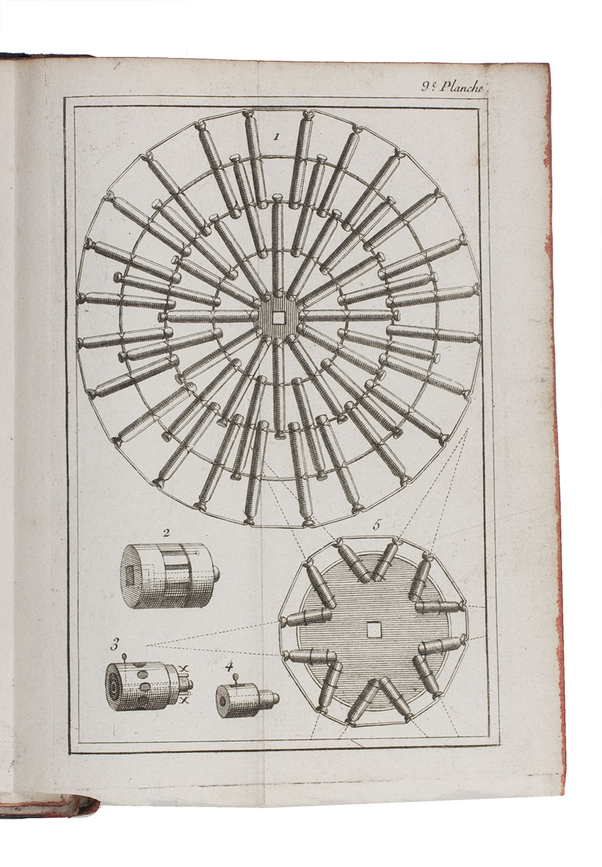 Paris, Charles-Antoine Jombert, 1757. 8vo. With 5 folding tables and 12 folding engraved plates. Contemporary mottled calf, richly gold-tooled spine. [8], 142, [3] pp.
