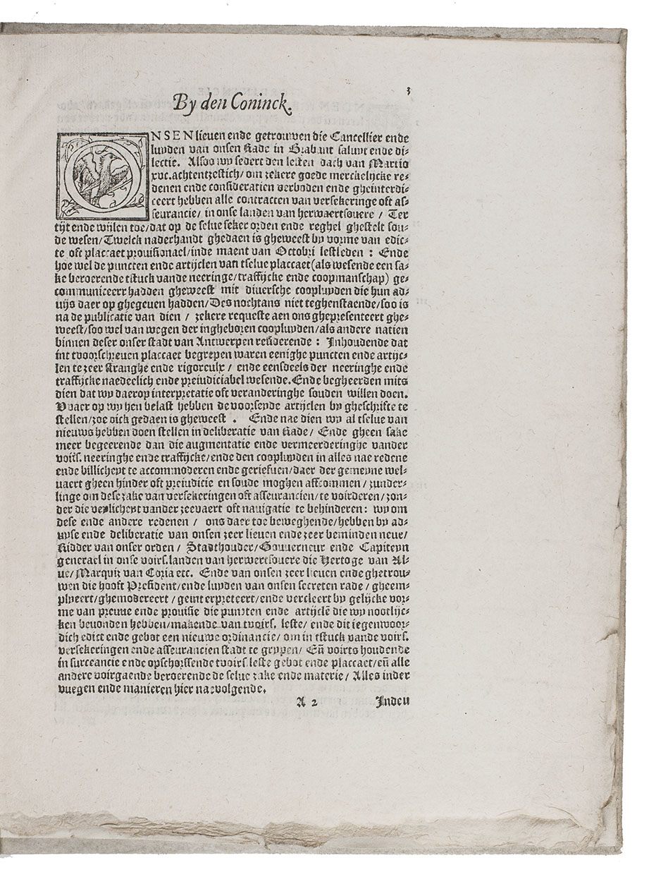Ordinancie, statuyt ende policie gemaect byden coninck onsen aldernadichsten Heere, op tfeyt vande contracten vande asseurancien ende versekeringen in dese Nederlanden.