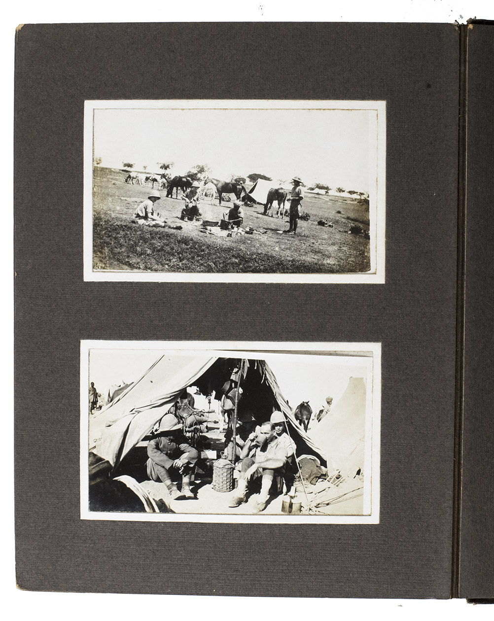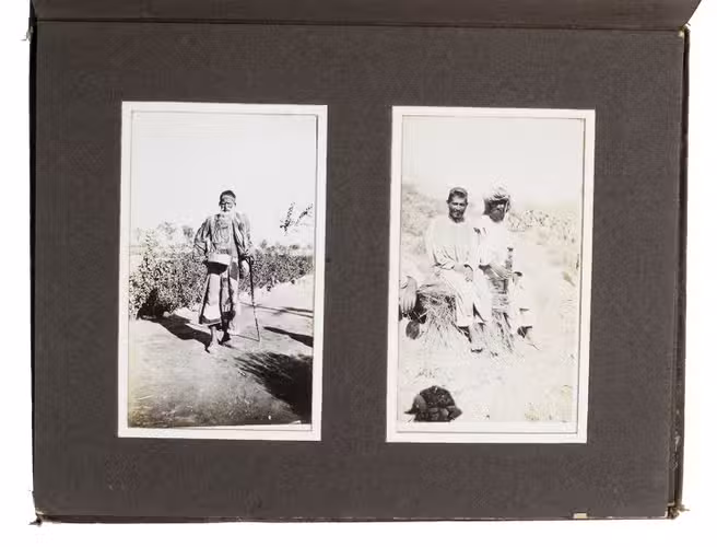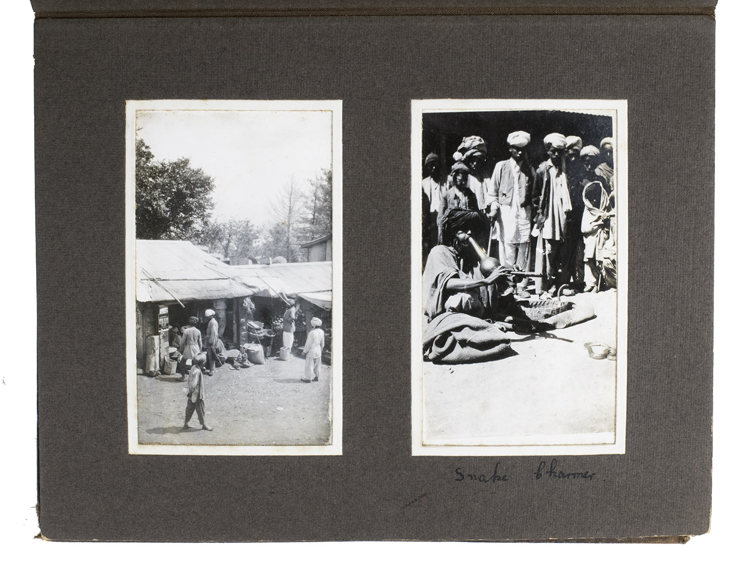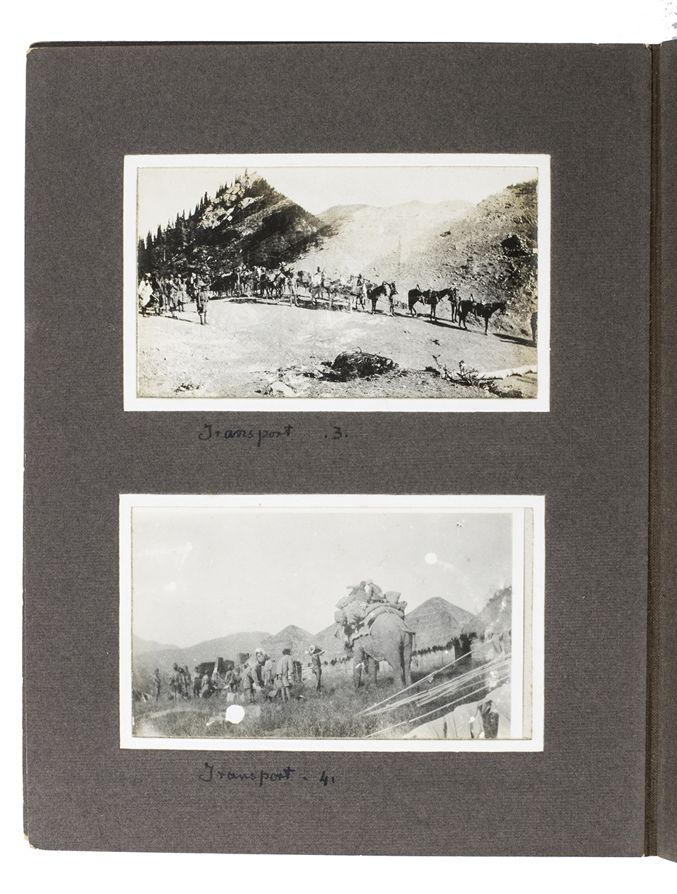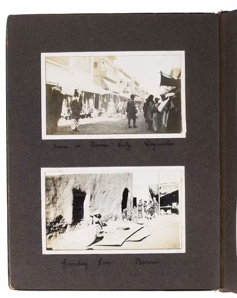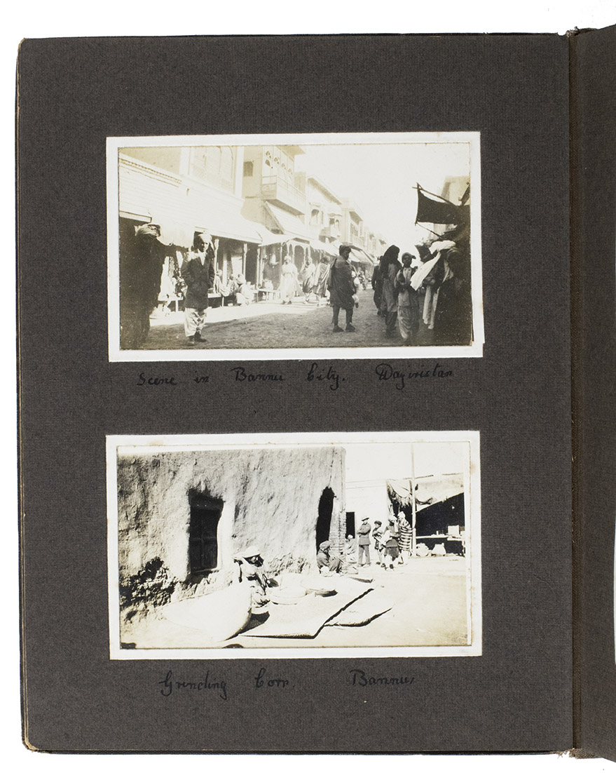 Waziristan/Pakistan, 1923-1925. 4to album (22.5 x 17.5 cm). With 97 black & white photographs (each ca. 11 x 6.5 cm) inserted in "frames" on 24 paperboard leaves, with 2 "frames" on each page (1 frame has 2 photos in it). Contemporary cloth. [48] pp. with 97 photographs.