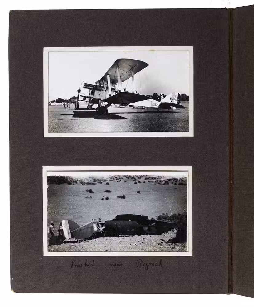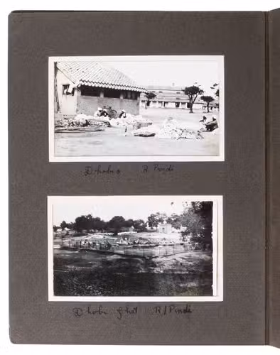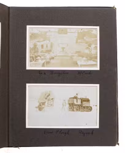 In the 1920s the British and Indians conducted military campaigns against tribesmen in and around Waziristan. At one point a permanent garrison of British troops was maintained in the region, at Razmak. Pinks War was a bombardment campaign carried out by the RAF against the Mahsud tribesmen in South Waziristan in the spring of 1925. Images include pack stations, military transports, wireless equipment, tented military camps, soldiers crossing the River Indus, a ferry crossing in 1923, soldiers posed in deep snow, barracks and other soldiers quarters, aircraft, transport by horse, camel, elephant and cart; as well as soldiers at leisure - riding bicycles, at a beach and at a zoo. One image depicts an airplane crash at Razmak. Only one aircraft was lost during Pinks War, so this may well be a rare photo of it. Some of the places shown include Tauda China, Pakistan; Rawalpindi, Pakistan; Bannu City, Waziristan; and Murree, a hill station in Pakistan. Military stations were positioned at Damdil, Bannu, and Razmak. Many images of local scenes, including people grinding corn and washing clothes, a bazaar, soldiers home, dairy farm, football field, city scenes of Rawalpindi, Murree and Bannu, and more.