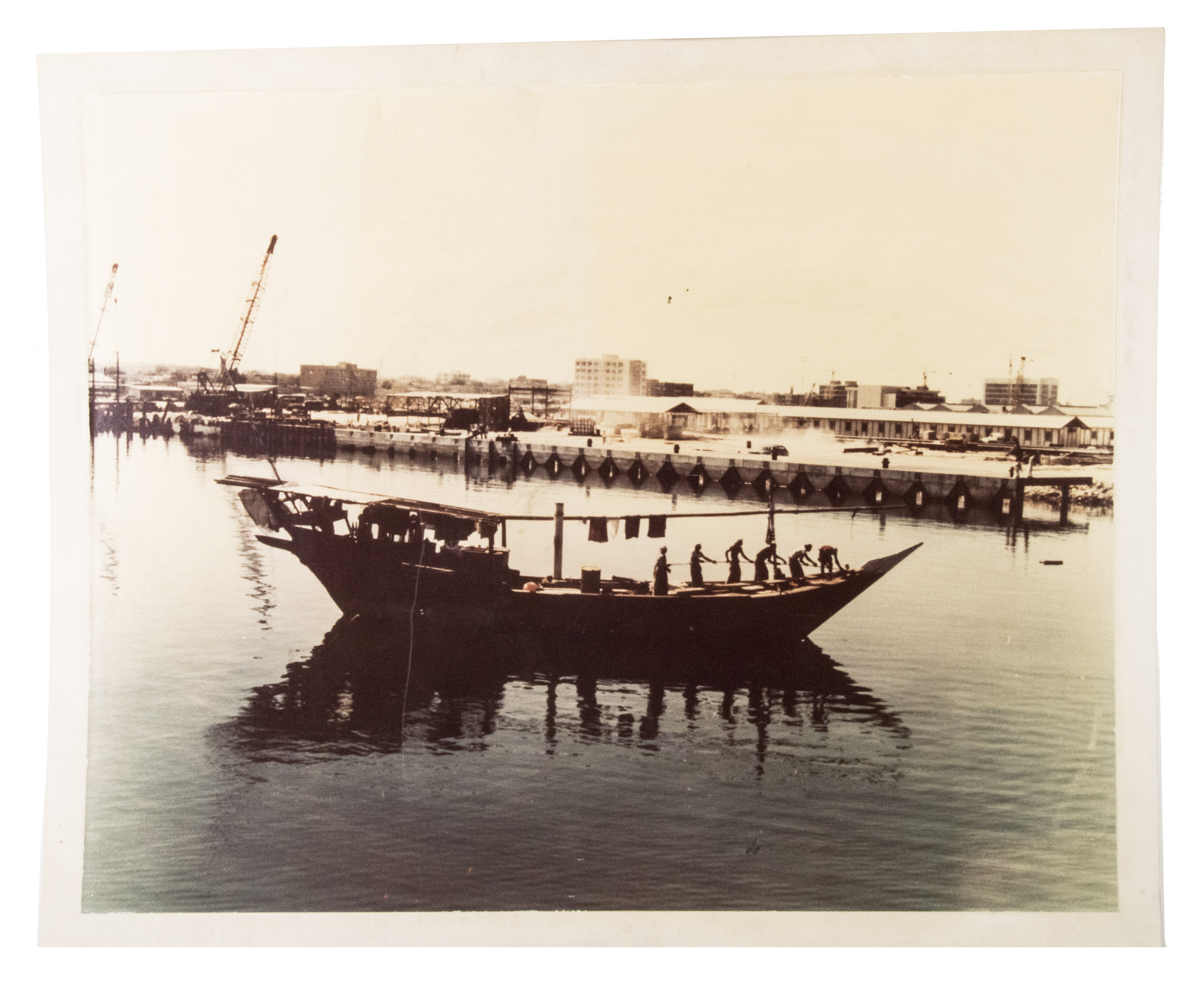 Large photograph showing a dhow in the harbour of Abu Dhabi; the dhow's sail and mast are down and 6 people are pulling a rope on the front of the boat. The photo was taken from the water and overlooking what would become the second-most populous city in the United Arab Emirates. The capital city of the eponymous Emirate is now famous for its impressive skyline made up of huge skyscrapers, but 50 years ago it still looked drastically different. It was a lot less densely populated and the city had not yet reached its literal and figurative height. The formation of the United Arab Emirates can also be seen as the start of Abu Dhabi's major transformation from a small desert settlement into a modern capital city fueled by oil wealth. The first president of the UAE, Sheikh Zayed bin Sultan Al Nahyan, was largely responsible for Abu Dhabi's transformation, as he used oil revenues to modernise infrastructure, education, healthcare, and housing. The present photograph gives a beautiful insight into Abu Dhabi's history and gives a clear view of the state of the city and its harbour before the major transformations that took place in and since the 1970s.