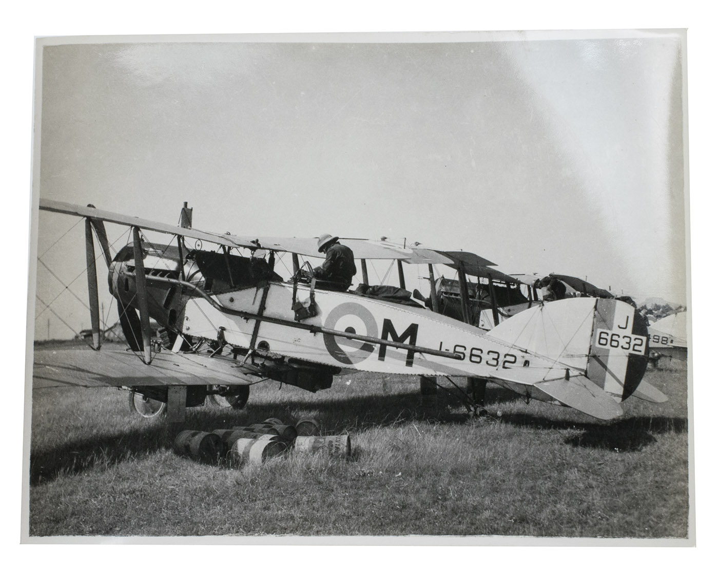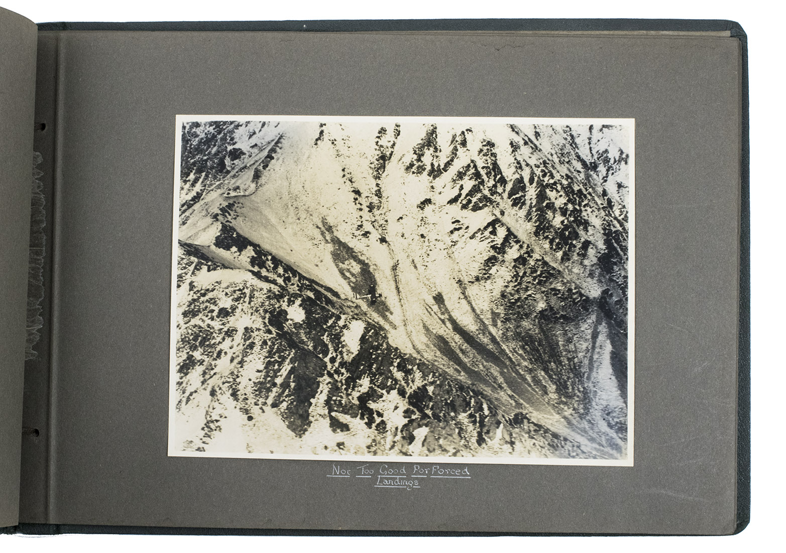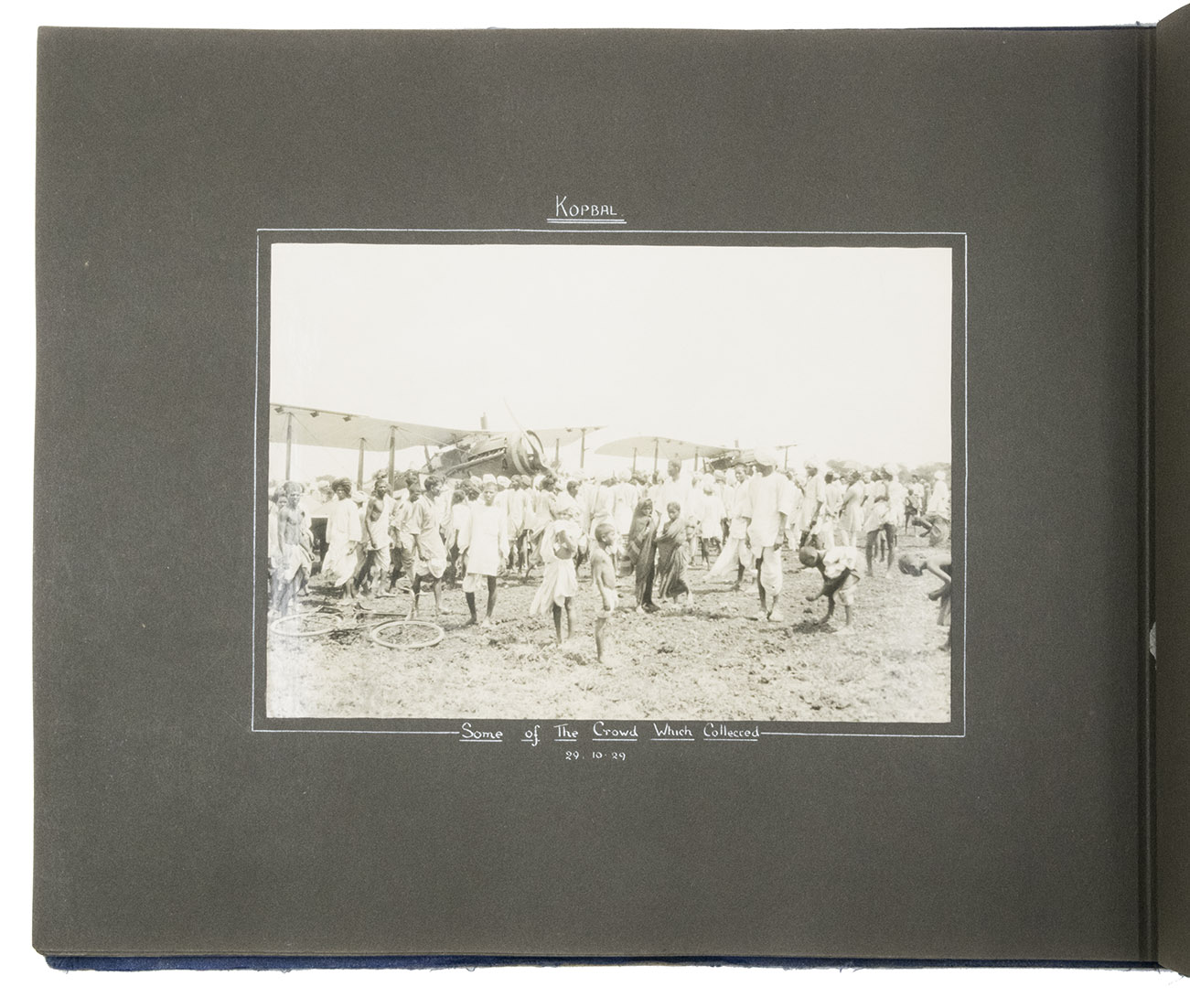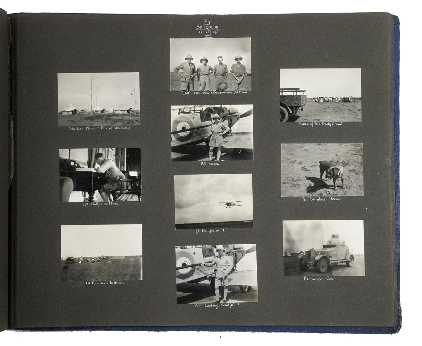 [India and Pakistan, especially their border region], 1929-1930. A collection of photographic silver-gelatin prints of aircraft, the squadron, aerial reconnaissance etc., made and compiled by Thomas William George Eady, flying officer of the no. 28 Squadron of the RAF. It comprises 3 photo albums (contemporary with the photos), 53 loose photos (20 x 15 cm, some with manuscript comments on the back), 5 related documents (dated 1928-1932) and a separate photographic portrait of Eady, in total nearly 2000 prints. The first and largest album, covers 1929, oblong folio (30 x 39.5 cm) in blue cloth with brown cord ties, contains 183 prints in various sizes, mounted on 16 brown paper leaves with India ink captions by Eady in English. The second album, oblong 4to (33.5 x 24 cm) in green cloth with brown cord ties, contains 72 prints made during the Afridi Redshirt Rebellion, in various sizes and mounted on 20 brown paper leaves with neat India ink captions in English by Eady. The small third album, oblong small 4to (19 x 27 cm), consisting of 4 brown paper leaves tied together with black cord ties, contains 33 prints in various sizes mounted on the leaves, some duplicating prints in the largest album, with larger captions in black ink, probably not by Eady.