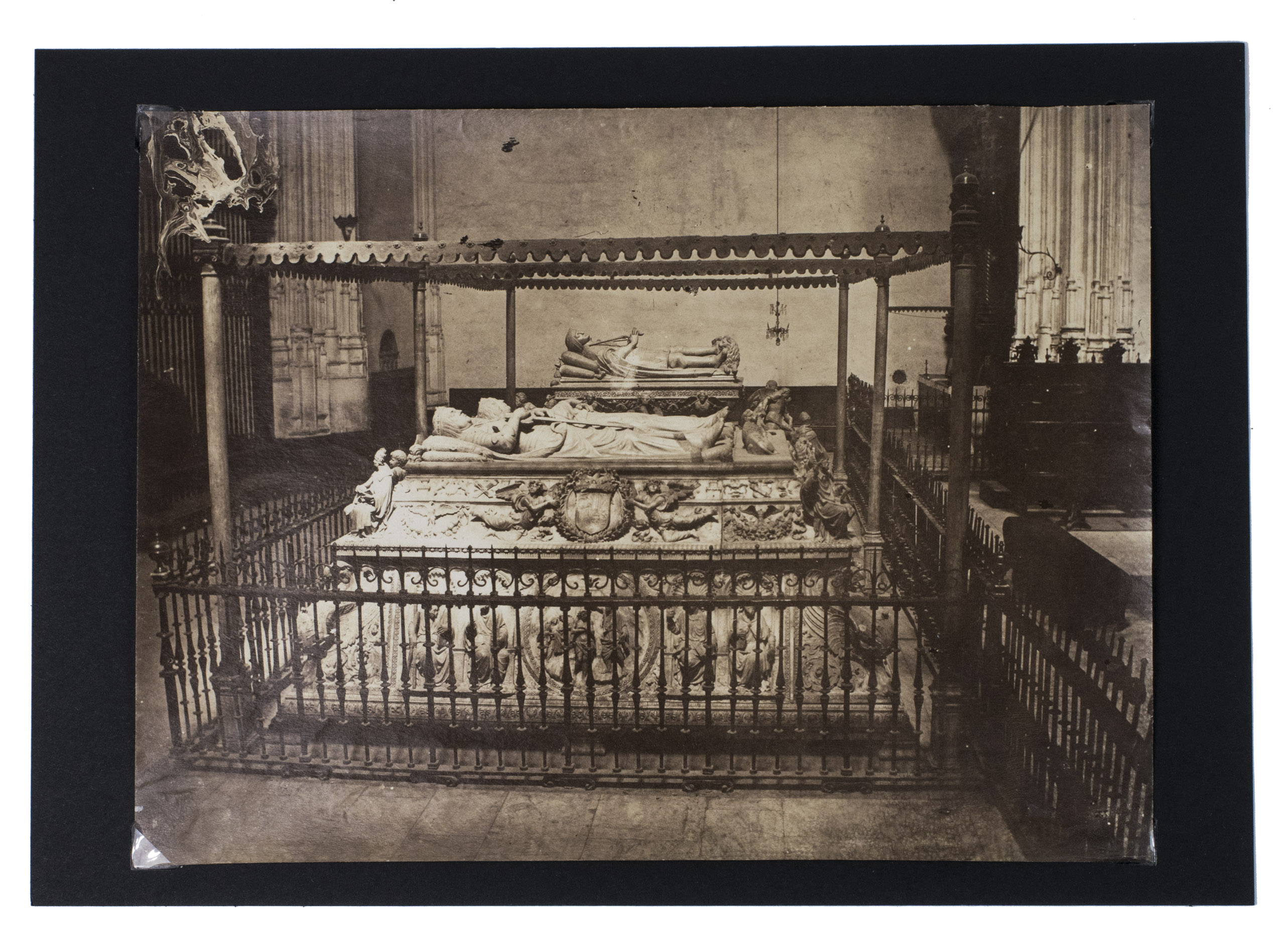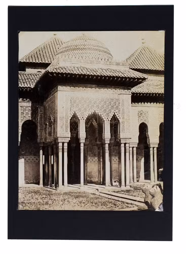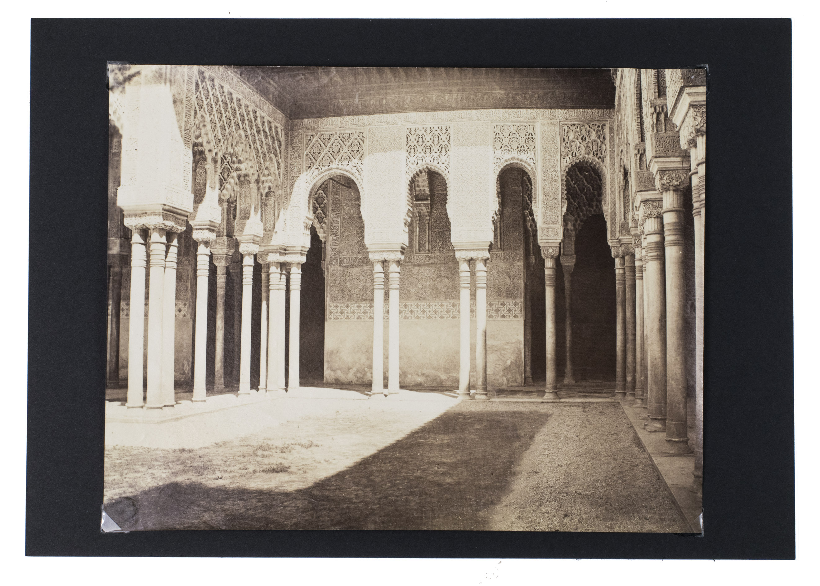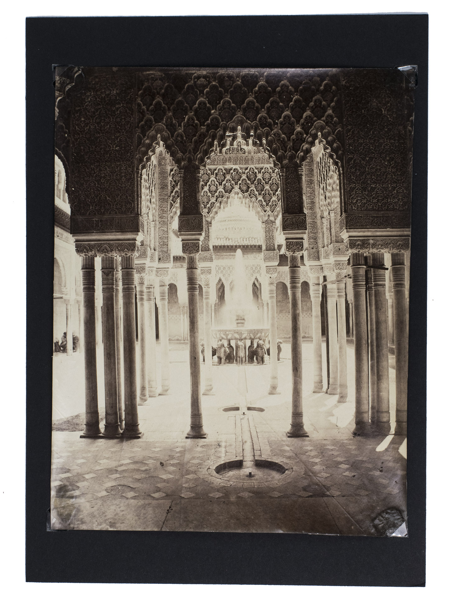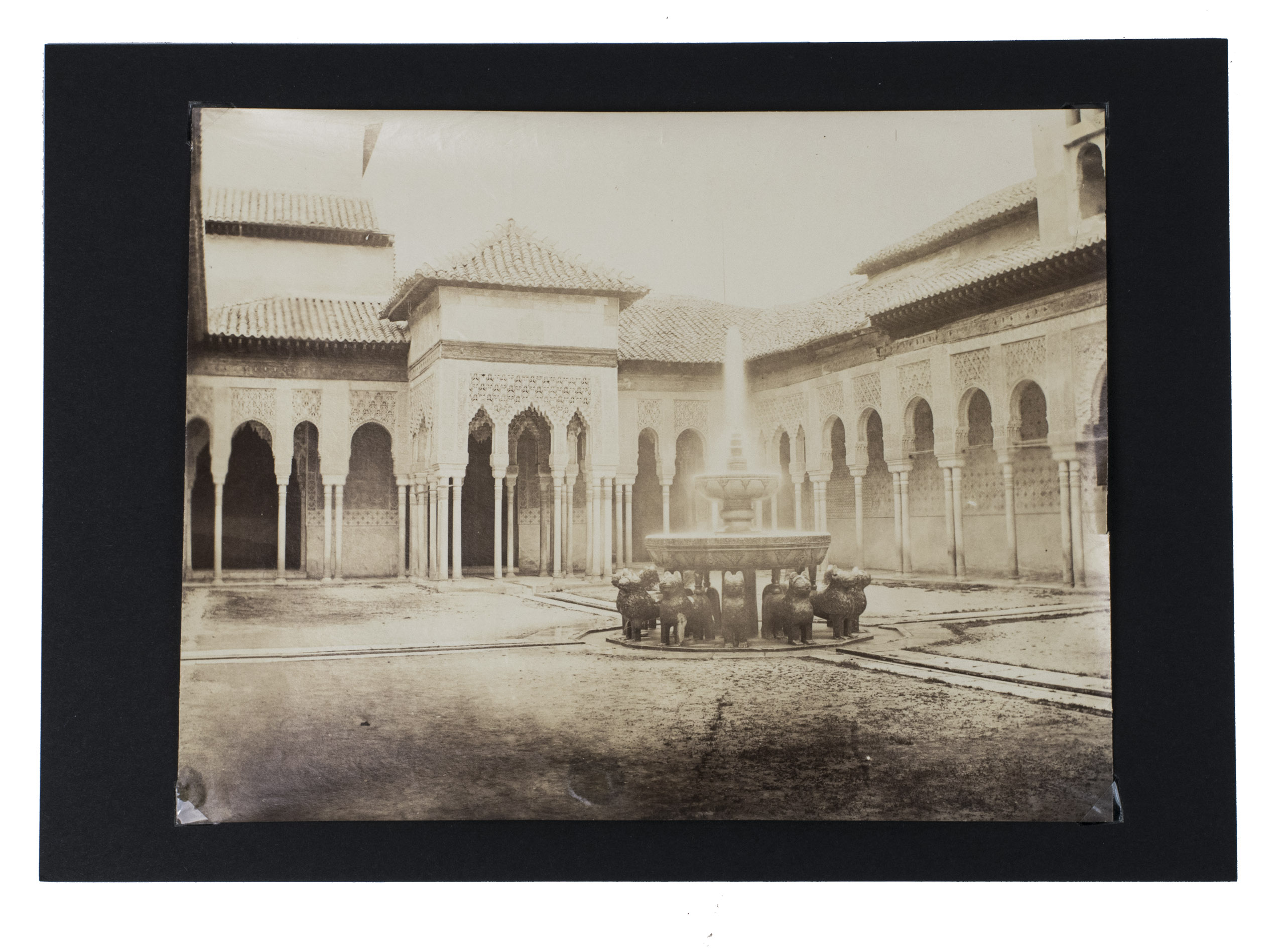 Collection of 19th-century albumen photographic prints of the Alhambra in Spain by Charles Mauzaisse (ca. 1823-1885?; fl. 1860s). The beautiful images show many different parts of the Alhambra, especially of the court and palace of lions, including the central fountain and the pavillion, with the oriental dome that was added in 1859 and later removed. The Alhambra is a medieval palace and fort of "Moorish" or Muslim rulers of the Kingdom of Granada in Andalusia in the South of the Iberian Peninsula. Additionally, the collection contains one photograph of the tomb of the Catholic monarchs, which is located in the Royal Chapel of Granada.