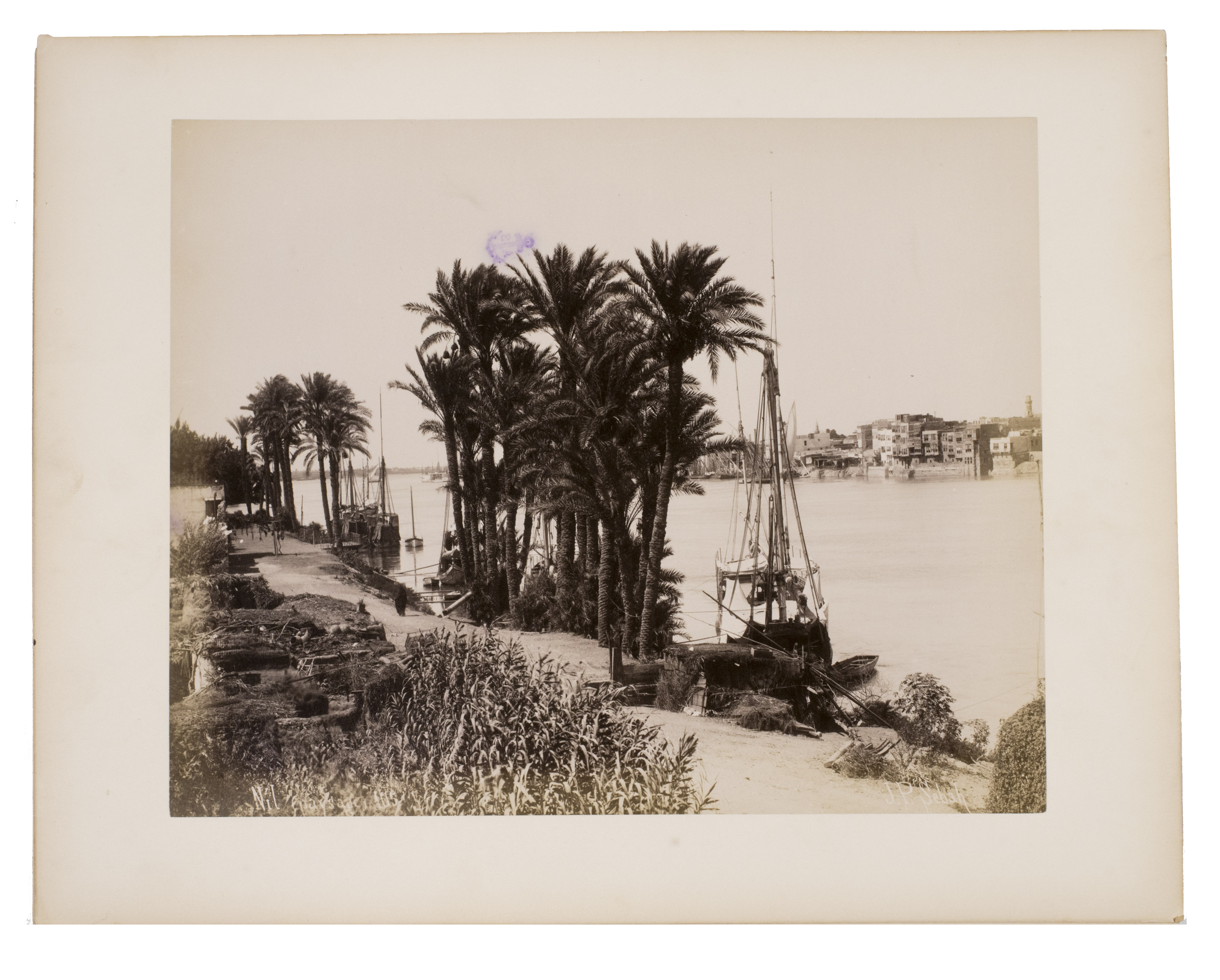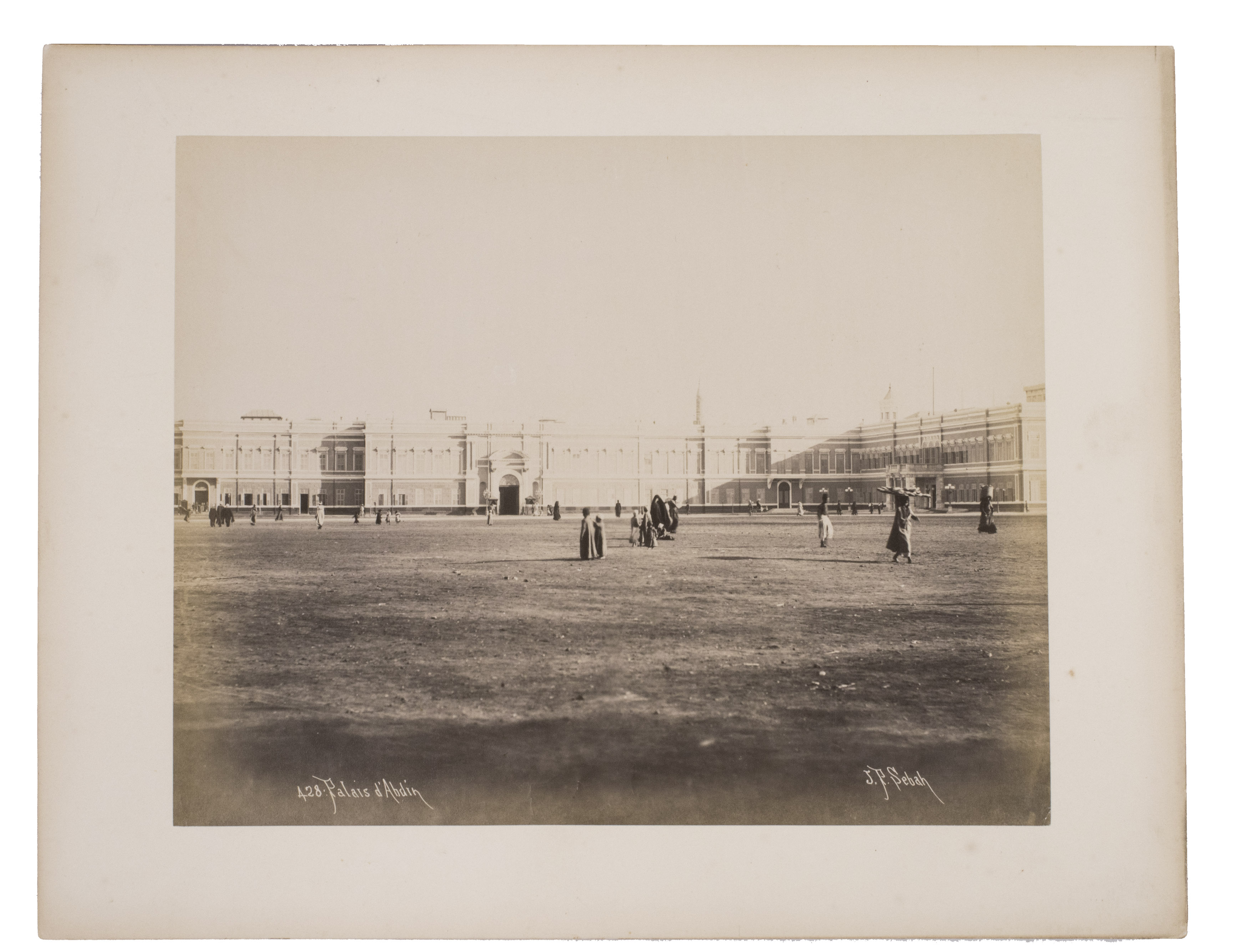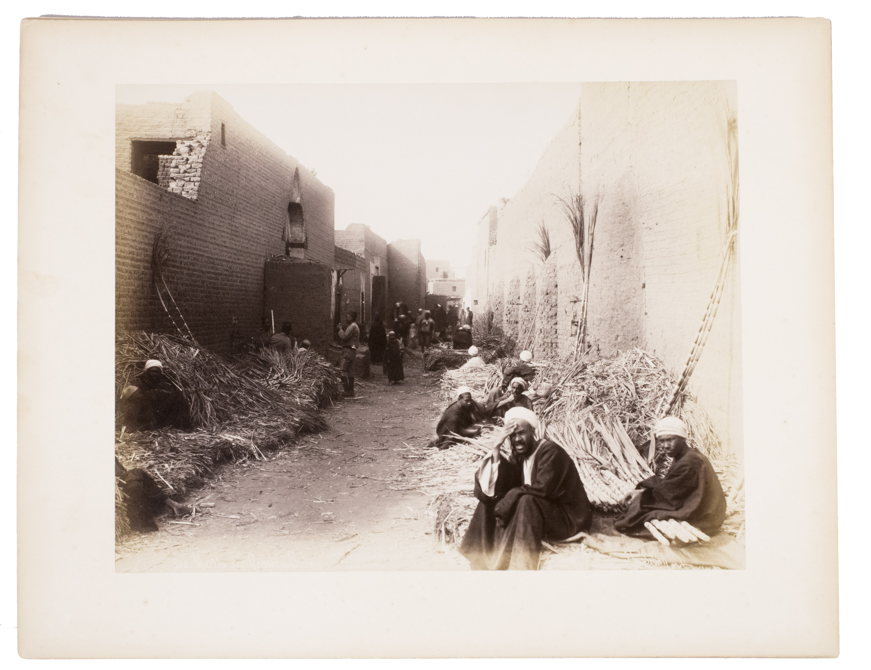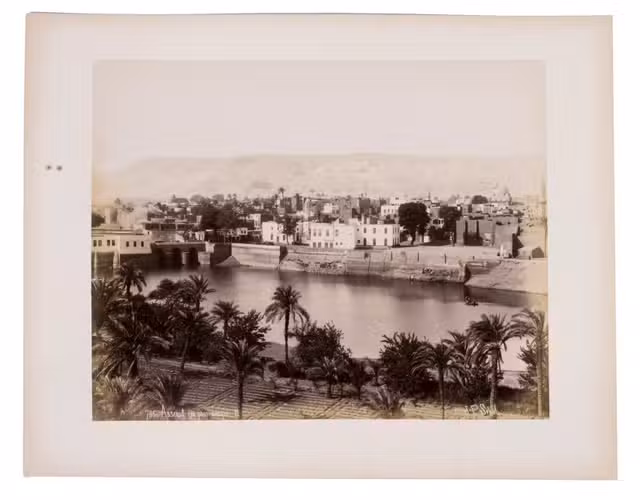 Sébah continued the business of his father Pascal Sébah (1823-1886), one of the first photographers working in Egypt. Pascal rose to prominence because of his well-organized compositions, careful lighting and quality of his prints. The majority of his photographs are of tourist destinations and locals. Jean Pascal inherited his father's good eye, but was more interested in depicting lesser known locations. His photos of people also appear more spontaneous. The present collection includes photographs of El-Souroughieh street and the Khalig canal in Cairo, the Virgin Mary's tree in Matariya, a local with a buffalo, a group of seated men in a mosque, a sugarcane market, locals working on a sugarcane field, a group of boys fishing and the hustle and bustle along the Nile.